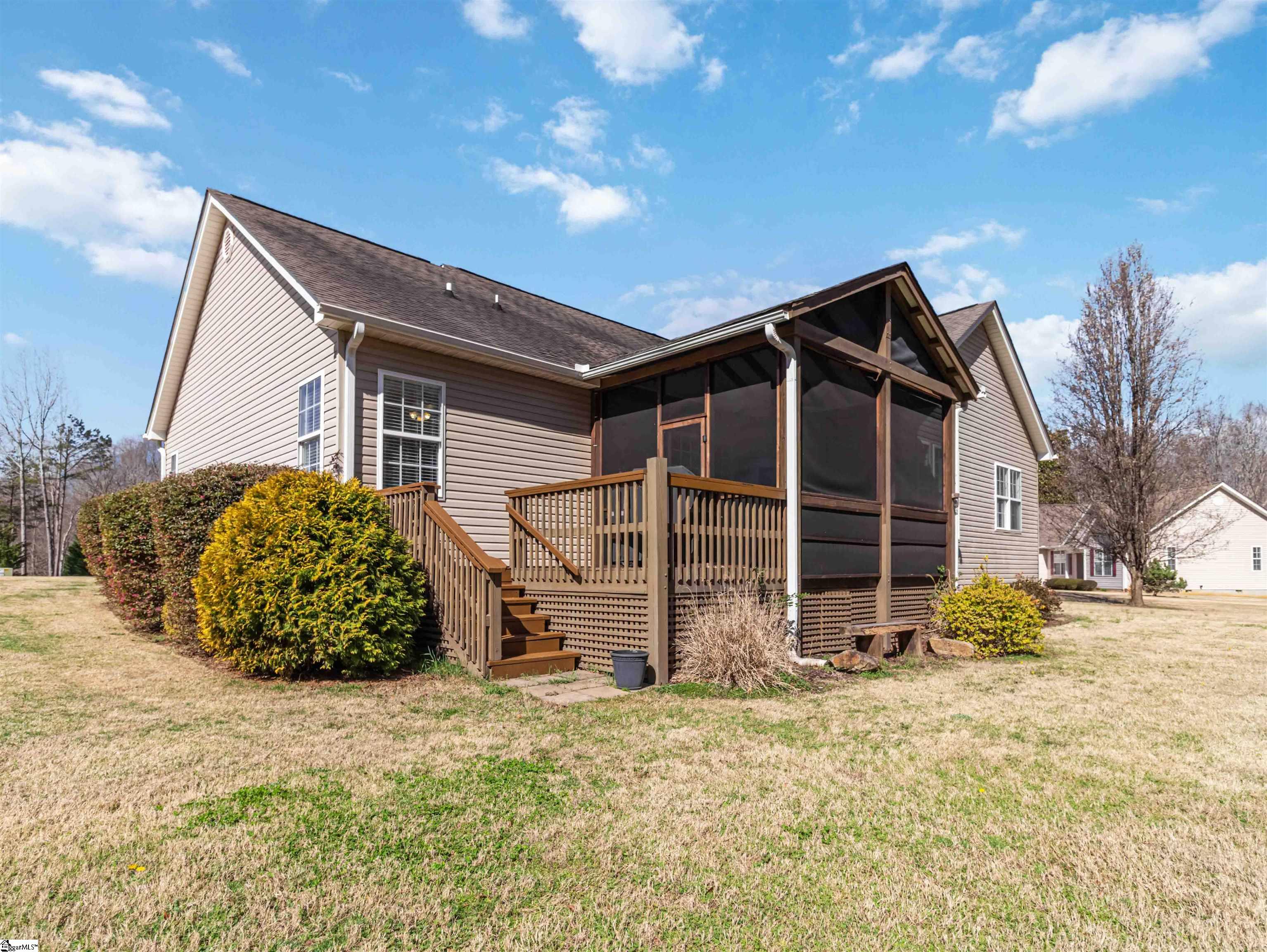 Welcome to 10 Chasie Lane in Greer, SC, a well-maintained 3-bedroom, 2-bath home situated on a spacious half-acre lot in one of Greer’s most desirable neighborhoods. Built in 2007, this 1.5-story home features beautiful wood flooring, heavy crown molding, tray and vaulted ceilings, and a wide foyer that opens into a vaulted great room with a cozy corner fireplace. The kitchen offers generous counter space, ample cabinetry, a gas range, dual sink, and new refrigerator, and overlooks the bright breakfast area with views of the backyard. The primary suite features a new floor, tray ceiling, and a spacious bath with double sinks, garden tub, separate shower, and two closets. Two additional bedrooms share a hall bath, while the flex room over the garage provides space for an office, guest room, or recreation area. Enjoy relaxing on the screened porch overlooking the wooded backyard, where wildlife such as birds, deer, and turkeys are often seen. The flat lot and driveway add everyday convenience, and a utility building with electricity and ramp access offers great additional storage. The septic system was pumped in February 2026 for added peace of mind. Conveniently located just minutes from Greer, this home offers space, comfort, and privacy in a beautiful setting.