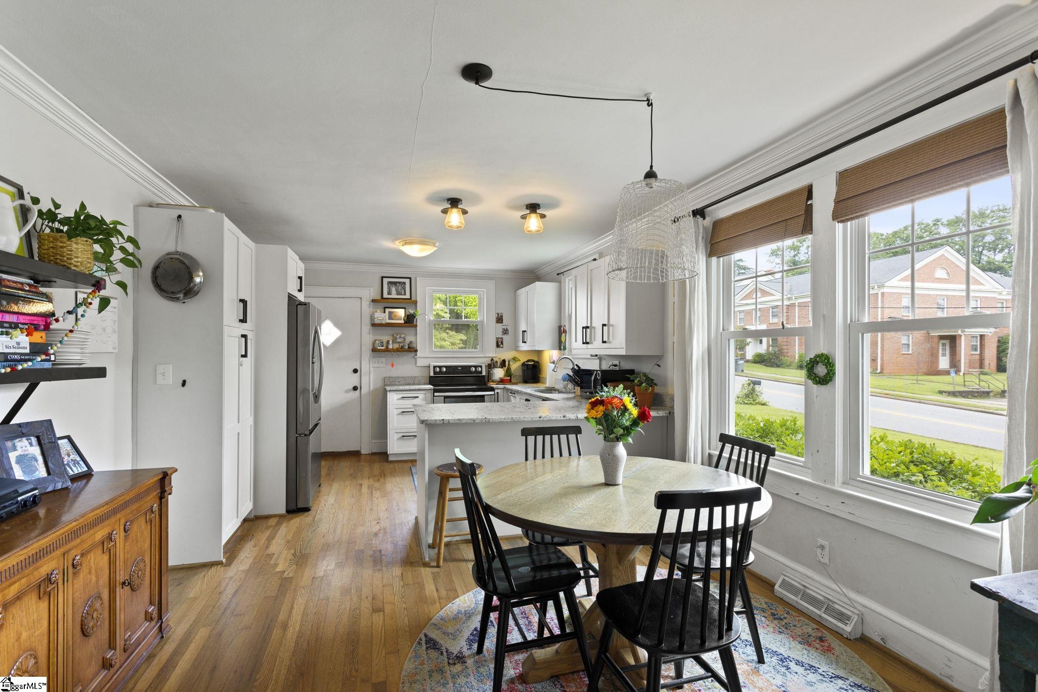 Overbrook charmer just 5 minutes to Downtown Greenville! This charming 3-bedroom, 2-bath home blends history with modern updates, all on one convenient level. WALK to nearby shopping, dining, activities on East North St. including Fork & Plough, Claire's Creamery, and Timmons Park; also walkable to East N Street Elementary and Greenville Middle School. Welcoming rocking chair front porch and two side porches, all freshly painted. Enjoy character throughout with hardwood flooring, 2 fireplaces, an updated kitchen, and recently renovated full bath. The open-concept layout connects the kitchen to a cozy dining nook and inviting living room, creating ease for everyday living and entertaining. A versatile flex room just off the living area, provides endless possibilities—whether you need a home office, playroom, homeschool area, or creative studio, this space adapts to your lifestyle. Additional detached garage/storage. Fully inspected and all repairs completed!