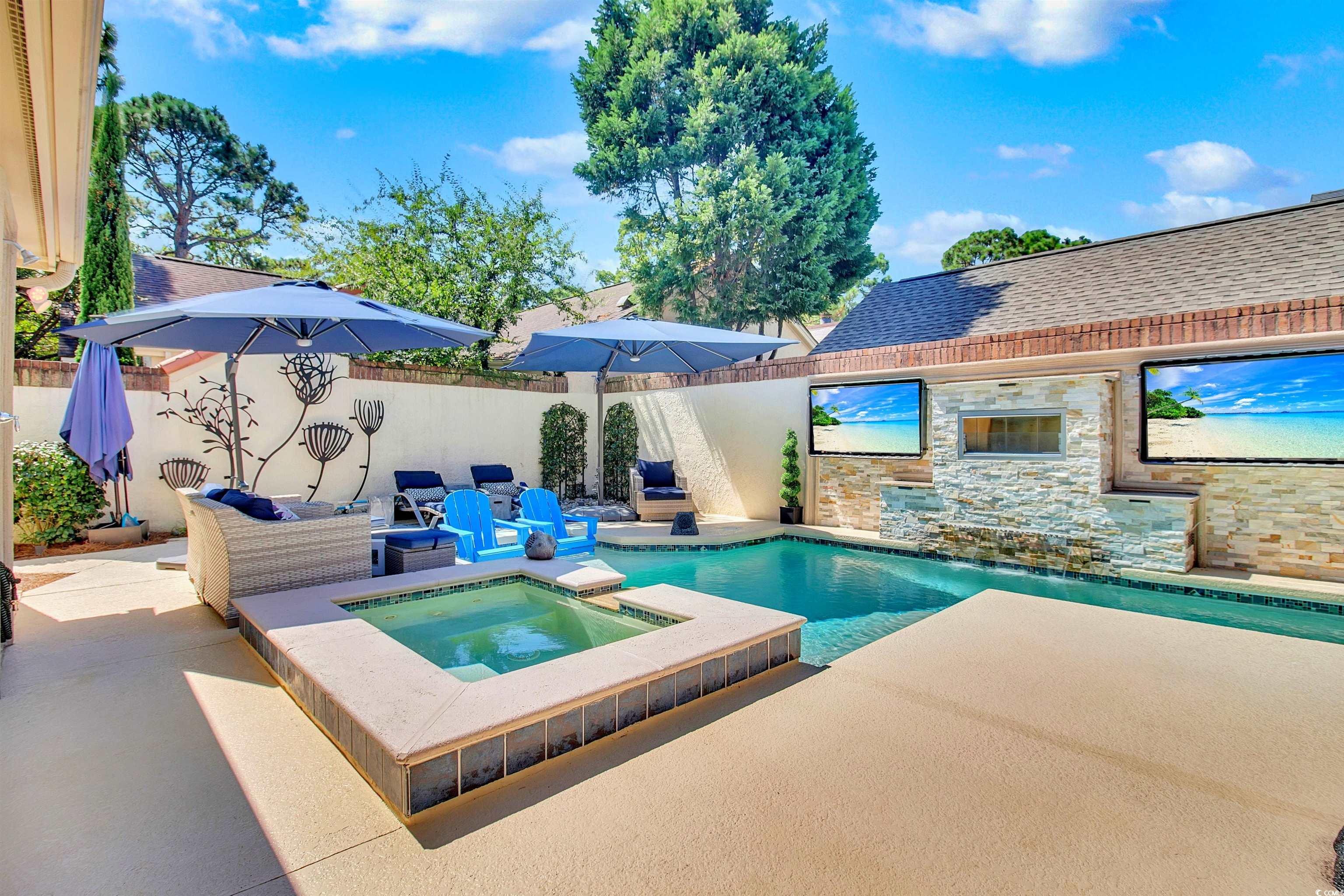 One of the most luxurious homes in the area at this price point with a total WOW factor. As soon as you open the door you are met with a luxurious spa-like feel as you see nothing but windows and water features as you hear the waterfalls gently kissing the water. Located in the desired and peaceful Antigua neighborhood this beautiful 3 bedroom home has been completely renovated and is absolutely stunning The living room is spacious and open which features a vaulted ceiling, ledger tile fireplace with a high end heat and glo led gas fireplace , hardwood floors and expansive windows overlooking the pool , spa, and private backyard. This brings the outside in so you can enjoy the beautiful backyard from the great room. The kitchen features stainless steel appliances and new custom cabinetry. The counter tops are quartz which is highlighted by the custom backsplash .The wall was removed which opens the kitchen to the great room and provides a bar with room for 4 bar stools. Enjoy your morning coffee on the screen porch while taking in the privacy of your backyard oasis that truly feels like you are at a Caribbean resort .The master bedroom is spacious and the floor to ceiling windows provide a lot of natural light. The remote control blinds are easy to use for the evening. The master bathroom is also newly renovated and offers a double vanity, fully tiled shower with glass door. The two additional bedrooms are good sized and convenient to bath 2 which is completely renovated and full tiled tub/shower. Roof was replaced in 2017, the outdoor area was completely renovated in 2023. The heated salt water pool was resurfaced, new pool pump, the decking was resurfaced, hot and cold outdoor shower along with the outdoor gas fireplace, lanai with lights , outdoor kitchen was added in 2023. The pool automation alone was just updated to top of the line new hayward system so you can control everything from your phone and even the landscaping lights can be controlled from your phone. This pool and hot tub are heated with a gas heater so you can have the pool at 90 degrees in half a day and the hot tub can be 104 degrees in less than an hour. Owner recently added a second gas tank so you can heat your pools for days on out without having to refill. The amazing thing about this outdoor set up is that the pool, outdoor gas fireplace inside of the pool, outdoor kitchen grill and inside gas fireplace is all controlled by the large outdoor tanks which last a long time so you don't have to worry about changing out 5 gallon tanks when cooking. There is even 2 65" tv's set up outside so you can watch the game or movie all while outside in your heated pool or just lounging around by it. Such an easy lifestyle all on one level living and in a neighborhood where even your front lawn is cared for by the HOA. Conveniently located only a short golf cart ride or walk to the beach, Publix grocery, restaurants, shopping, entertainment and Grand Strand Regional Hospital. You will not find a house like this with a heated pool and hot tub this close to the ocean for this price point. Significant investment in upgrades in past 2 years. Schedule your showing today!