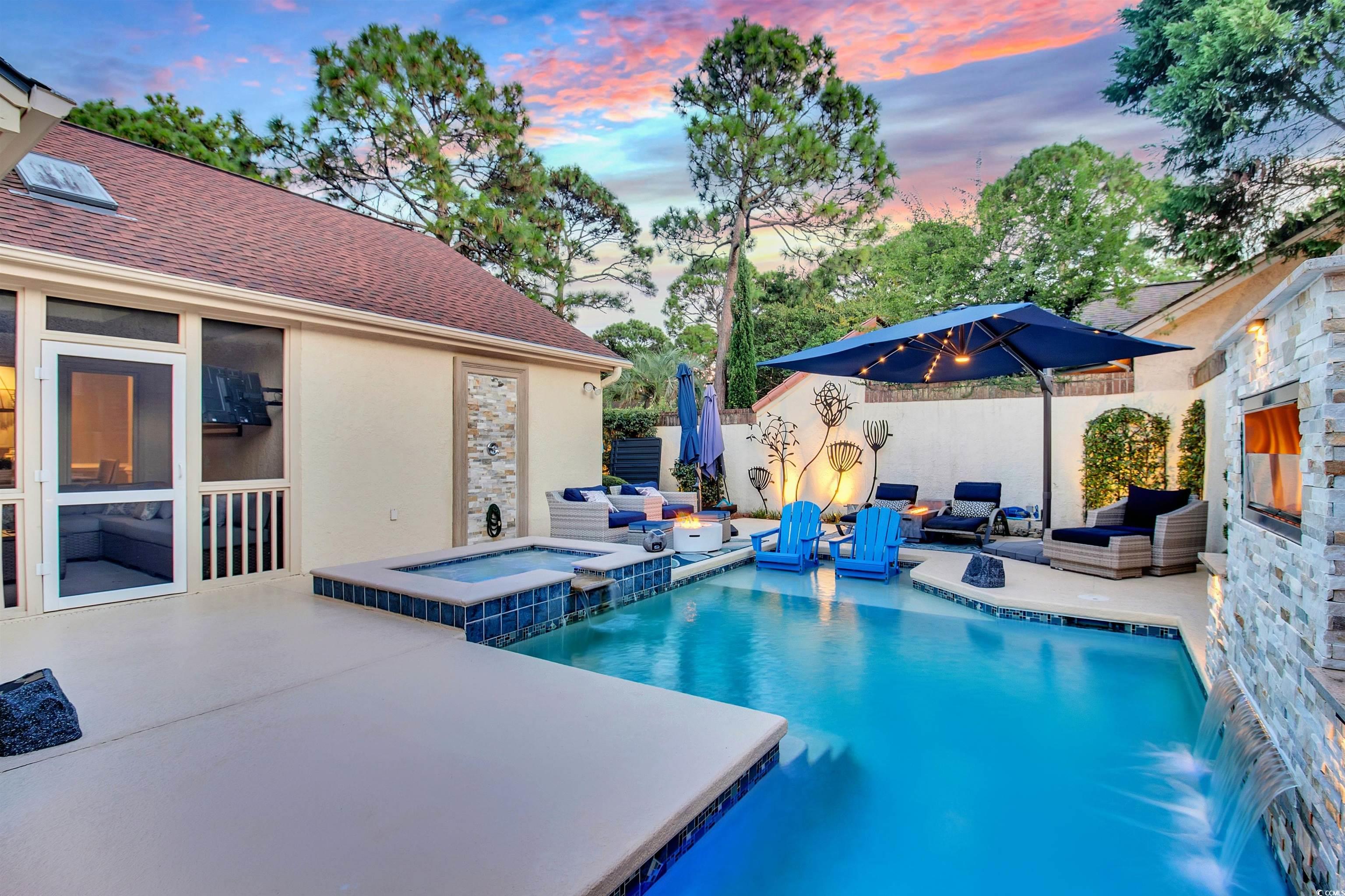 Now fully furnished with top of the line interiors! One of the most luxurious homes in the area at this price point with a total WOW factor. As soon as you open the door you are met with a luxurious spa-like feel as you see nothing but windows and water features as you hear the waterfalls gently kissing the water. Located in the desired and peaceful Antigua neighborhood this beautiful 3 bedroom home has been completely renovated and is absolutely stunning The living room is spacious and open which features a vaulted ceiling, ledger tile fireplace with a high end heat and glo led gas fireplace , hardwood floors and expansive windows overlooking the pool , spa, and private backyard. This brings the outside in so you can enjoy the beautiful backyard from the great room. The kitchen features stainless steel appliances and new custom cabinetry. The counter tops are quartz which is highlighted by the custom backsplash .The wall was removed which opens the kitchen to the great room and provides a bar with room for 4 bar stools. Enjoy your morning coffee on the screen porch while taking in the privacy of your backyard oasis that truly feels like you are at a Caribbean resort .The master bedroom is spacious and the floor to ceiling windows provide a lot of natural light. The remote control blinds are easy to use for the evening. The master bathroom is also newly renovated and offers a double vanity, fully tiled shower with glass door. The two additional bedrooms are good sized and convenient to bath 2 which is completely renovated and full tiled tub/shower. Roof was replaced in 2017, the outdoor area was completely renovated in 2023. The heated salt water pool was resurfaced, new pool pump, the decking was resurfaced, hot and cold outdoor shower along with the outdoor gas fireplace, lanai with lights , outdoor kitchen was added in 2023. The pool automation alone was just updated to top of the line new hayward system so you can control everything from your phone and even the landscaping lights can be controlled from your phone. This pool and hot tub are heated with a gas heater so you can have the pool at 90 degrees in half a day and the hot tub can be 104 degrees in less than an hour. Owner recently added a second gas tank so you can heat your pools for days on out without having to refill. The amazing thing about this outdoor set up is that the pool, outdoor gas fireplace inside of the pool, outdoor kitchen grill and inside gas fireplace is all controlled by the large outdoor tanks which last a long time so you don't have to worry about changing out 5 gallon tanks when cooking. There is even 2 65" tv's set up outside so you can watch the game or movie all while outside in your heated pool or just lounging around by it. Such an easy lifestyle all on one level living and in a neighborhood where even your front lawn is cared for by the HOA. Conveniently located only a short golf cart ride or walk to the beach, Publix grocery, restaurants, shopping, entertainment and Grand Strand Regional Hospital. You will not find a house like this with a heated pool and hot tub this close to the ocean for this price point. Significant investment in upgrades in past 2 years. Schedule your showing today!