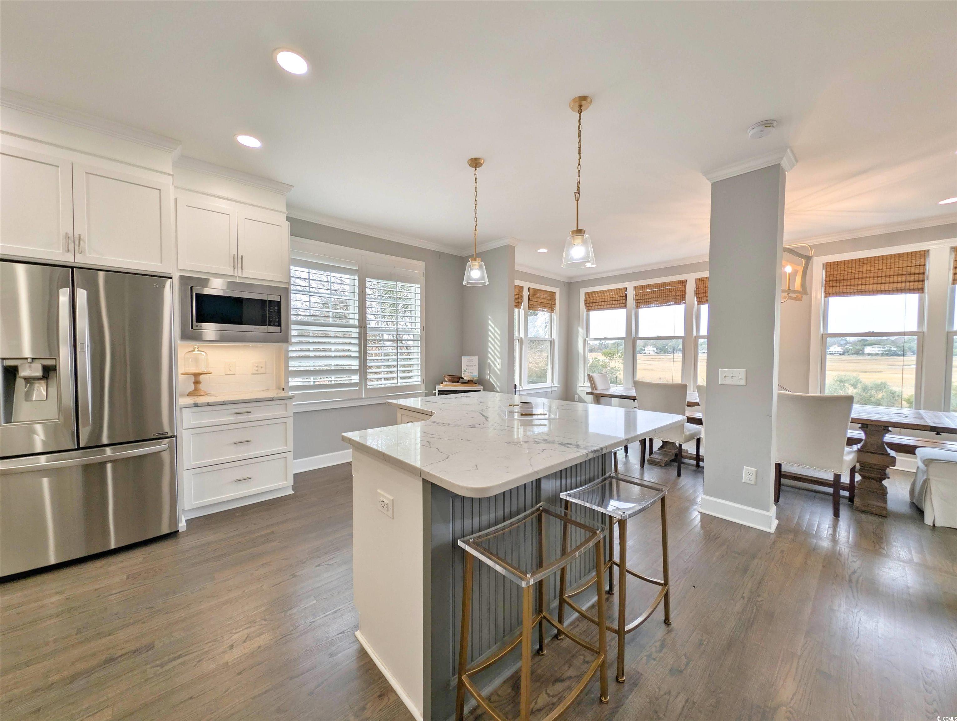Discover coastal living at its finest at 10 Sea Oats Circle, tucked within the exclusive enclave of Charlestown Grant in Litchfield by the Sea. This charming beach home sits in an incredible position—just steps from the sand, directly across from the community pool, and perfectly placed to capture both ocean peeks from the front and wide, peaceful marsh views from the back. Inside, the home feels bright, welcoming, and thoughtfully updated. The kitchen is a standout, featuring a gas cooktop, double ovens, and custom cabinetry that pairs beautifully with the sleek countertops. The main living space takes full advantage of the natural surroundings with large windows showcasing the marsh, a cozy gas fireplace, and a convenient wet bar for entertaining. The main floor offers a spacious bedroom suite that functions beautifully as a primary bedroom, providing convenience and easy single-level living. Upstairs, one of the three guest suites is large enough—and privately appointed enough—to serve as an alternate primary bedroom, giving flexibility for various living arrangements or guest accommodations. An additional room at the front of the home on the main level offers even more versatility, ideal for an office, reading room, or quiet retreat. Outdoor spaces on both the marsh and ocean sides offer relaxing spots to enjoy sunrise, sunset, and the coastal breeze. Residents of Charlestown Grant enjoy access to all the Litchfield by the Sea amenities, including tennis and pickleball courts, walking and biking paths, fishing and crabbing docks, and miles of private beach. With Murrells Inlet, Myrtle Beach, and historic Georgetown all within easy reach, this location blends tranquility with convenience. 10 Sea Oats Circle offers a rare combination of views, proximity, flexibility, and lifestyle—an ideal coastal retreat in one of Litchfield’s most desirable neighborhoods.