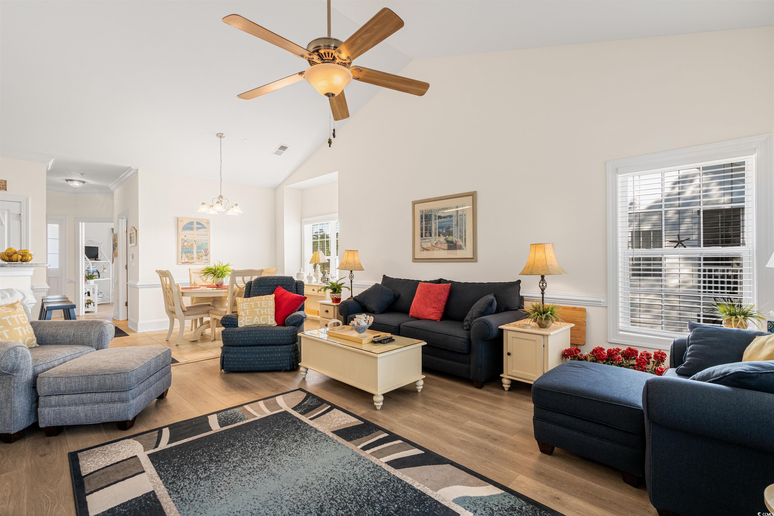 This stunning corner unit condo comes fully furnished and is located only a couple of miles from the beach. Enter through the tiled foyer and immediately notice the many upscale features, including chair rail, base molding, crown molding and smooth ceilings throughout. Vaulted ceilings enhance the open concept layout, seamlessly connecting the living room, kitchen and dining areas. The upgraded kitchen boasts tile flooring, granite countertops, 42-inch solid wood cabinets, stainless steel appliances, a smooth top Frigidaire range, a pantry and a convenient breakfast bar - perfect for entertaining or casual dining. The spacious primary ensuite features triple windows that fills the room with natural light, making it enjoyable to wake in the mornings, the ensuite bath includes double vanities, a garden tub, and a large walk-in closet. The screened porch complete with ceramic tile flooring and a ceiling fan is the perfect place to drink your coffee and enjoy a peaceful sunrise. Community amenities include a beautiful pool area with an outdoor fireplace and grill, as well as a clubhouse featuring a screened porch overlooking the pool area and convenient restrooms. The beautiful brick entrance into Birch N Coppice makes you proud to call this home so don't miss this incredible opportunity to own a place at the beach.