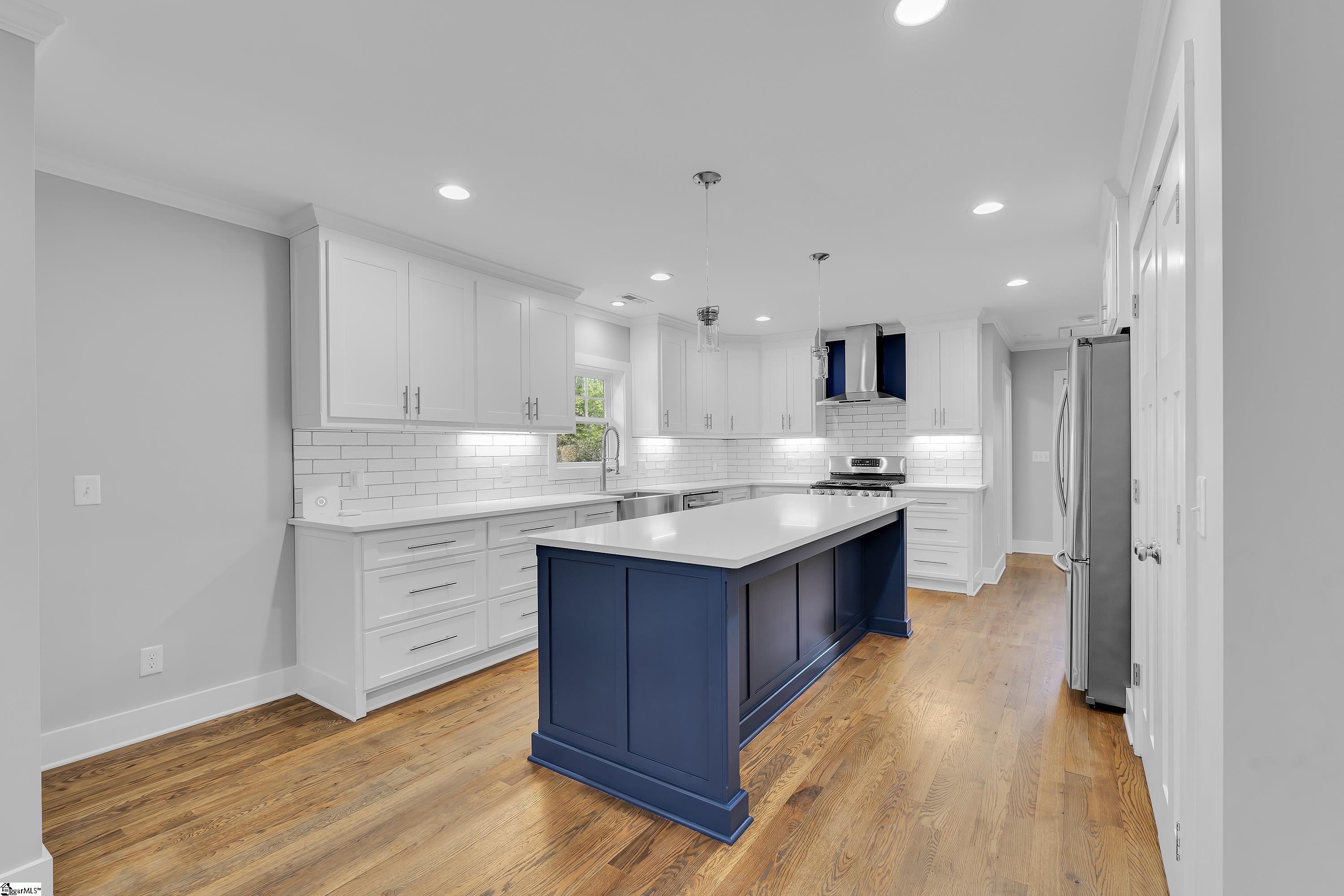 Conveniently located just minutes from downtown Greenville, this beautifully updated Craftsman-style home offers easy access to dining, shopping, and entertainment, plus direct access to the Swamp Rabbit Trail right in the neighborhood. From the inviting front porch to the cozy, fully fenced yard, this home blends classic charm with modern finishes and is one you won't want to miss. Offering 3 bedrooms and 2 bathrooms, the home features hardwood floors throughout many areas and a bright, open floor plan that flows effortlessly from room to room. The kitchen is a true centerpiece, complete with a gas range, vent hood, quartz countertops, and a large island opening into the spacious family room and leading to a side patio just off the kitchen. The primary suite provides a comfortable retreat with a custom tile shower, glass surround, double vanity, and walk-in closet. A well-designed laundry room includes a stainless steel sink and additional cabinetry for extra storage. Two additional bedrooms on the main level share a full bathroom, offering flexibility for guests, family, or a home office. Out back, enjoy a large porch overlooking the fenced yard, perfect for relaxing or entertaining. The basement features a putting green and offers great space for a workshop, storage, or hobbies.
