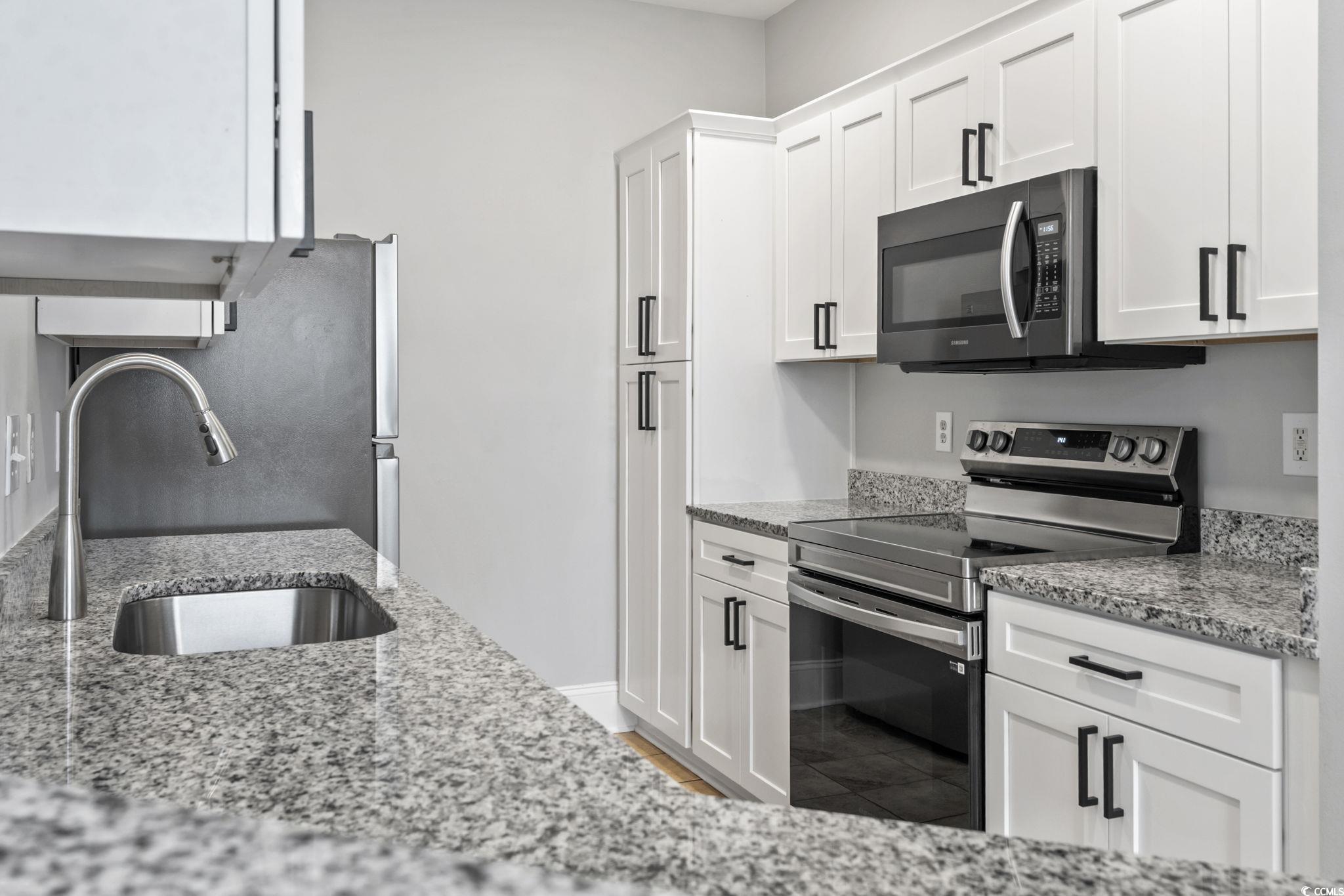 The perfect primary home or investment property awaits! Step into this beautifully updated first floor END UNIT; a 3-bedroom, 2-bath condo offering effortless living and expansive, direct pond views right from your screened-in porch. This move-in-ready unit features a fully remodeled kitchen, complete with brand-new cabinetry, granite countertops, and stainless steel appliances—perfect for everyday cooking or entertaining guests. Enjoy stylish, low-maintenance LVP flooring throughout the main living areas and the primary suite. Enjoy a split floor plan, maximizing privacy in your primary suite away from the other two bedrooms. The primary suite features two walk-in closets and a great sized bathroom with a ton of counter space, in addition to an oversized tub/shower. Both bathrooms have been refreshed with granite counters, modern lighting, and new mirrors, adding a touch of luxury to your daily routine. Relax on your private screened porch overlooking a huge pond, creating the ideal backdrop for morning coffee or sunset evenings. Additionally, enjoy your own storage closet, a new water heater installed just last year, and a separate laundry room with shelving above the washer and dryer! With first-floor convenience and thoughtful upgrades throughout, this condo is the perfect blend of comfort, style, and easy living. Fountain Point is a fantastic community located just 15 minutes away from the beach, and close to all of the fantastic dining and shopping that Myrtle Beach has to offer. Investors - this unit is turn key and would bring in great numbers as a long term rental! Don’t miss the chance to make this updated condo yours!