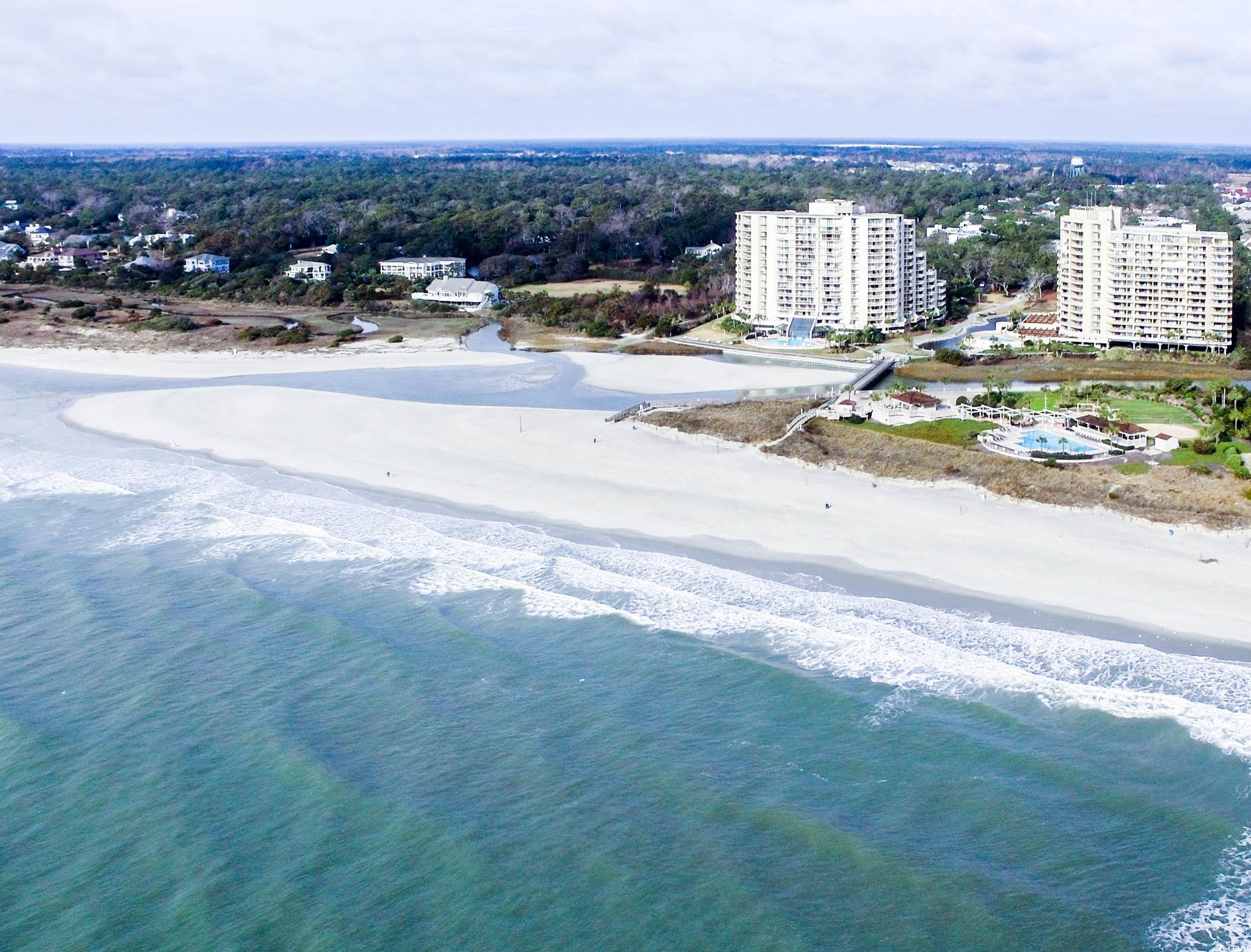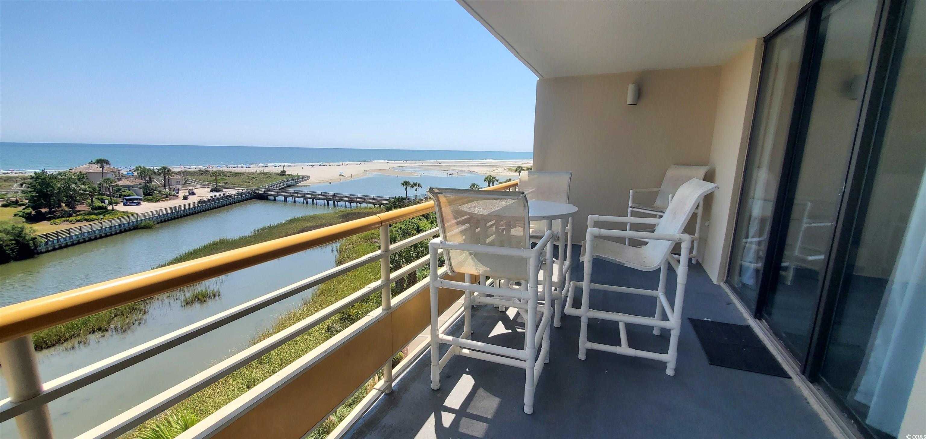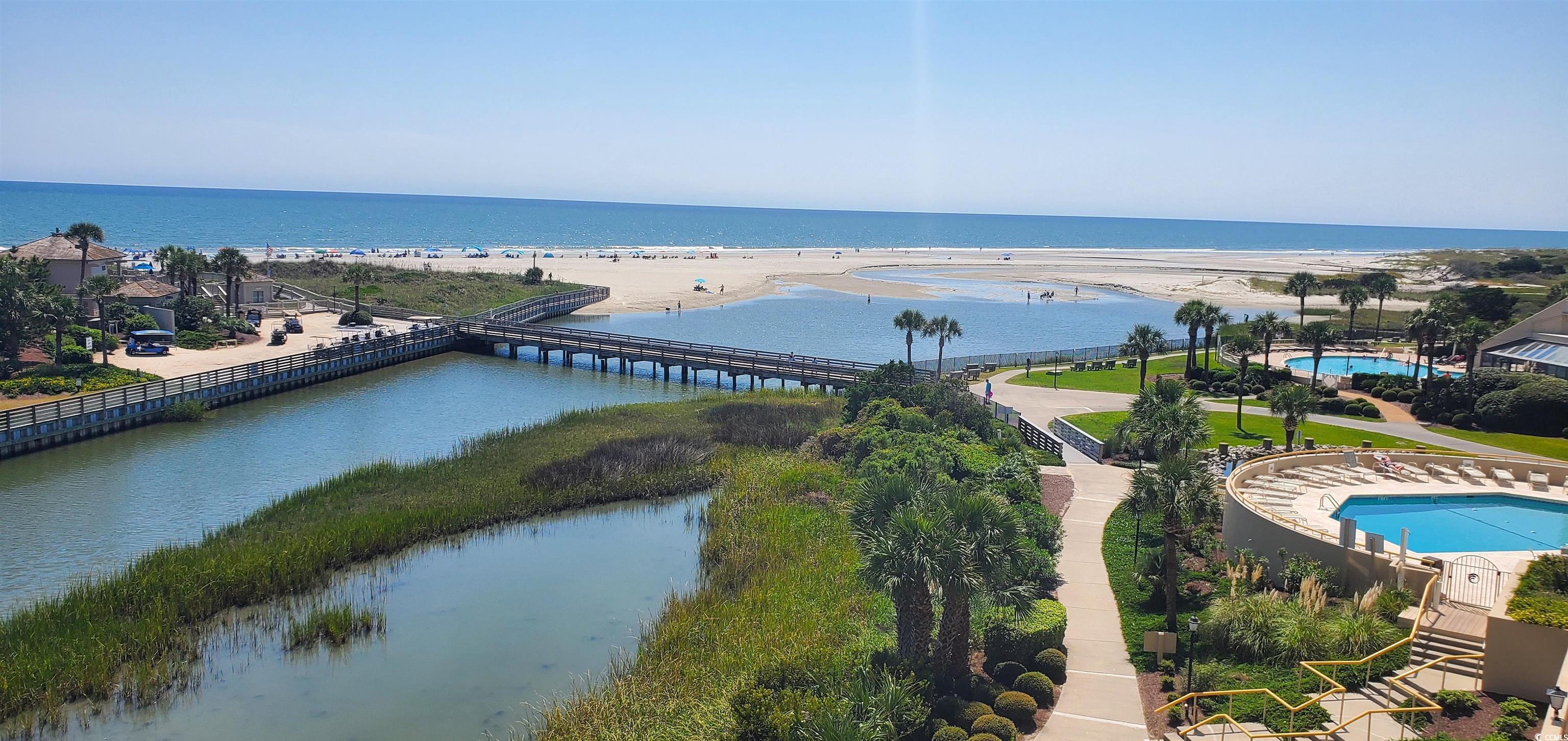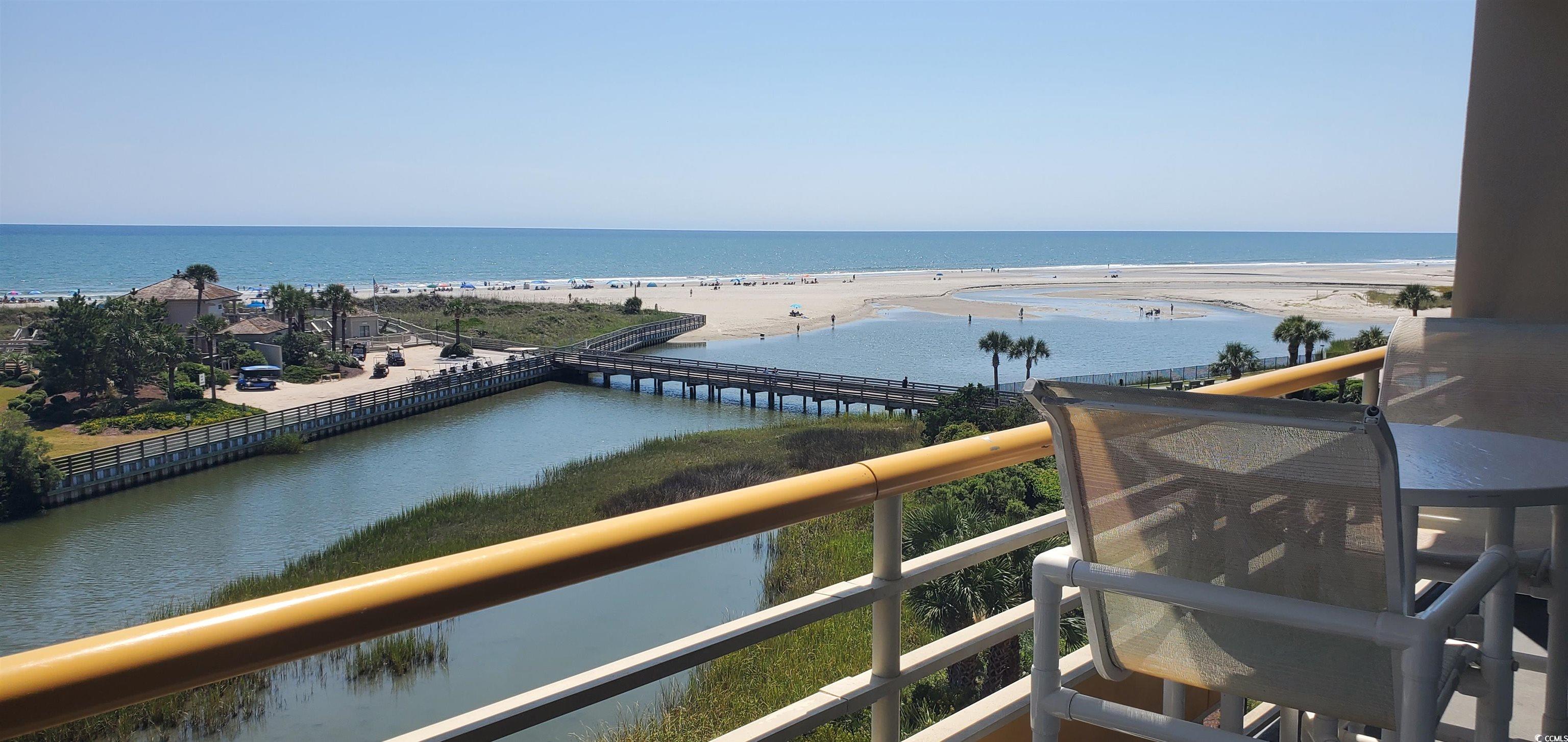 Outstanding views, convenient location and a great value! On the 5th living level, there are wonderful views of the ocean, beach, the Creek, and Beach Club. The large balcony stretches across the living area and the primary bedroom to offer excellent views from the interior of both spaces. There is balcony access from the living area and primary bedroom, there are multiple views of the ocean, beach and marshes to enjoy. Sold completely furnished. Ocean Creek has 57-acres of park-like grounds. 24-hour gated security, tennis center, pickleball court, putting green, multiple outdoor pools, and an indoor pool with whirlpool. The community has a wonderful oceanfront beach club with a snack bar and grill open in season, sand volleyball court, outdoor pool, playground, lockers, and restrooms. Building insurance is assessed annually. Property is currently a vacation rental. All figs. & sq. ft. approximate.