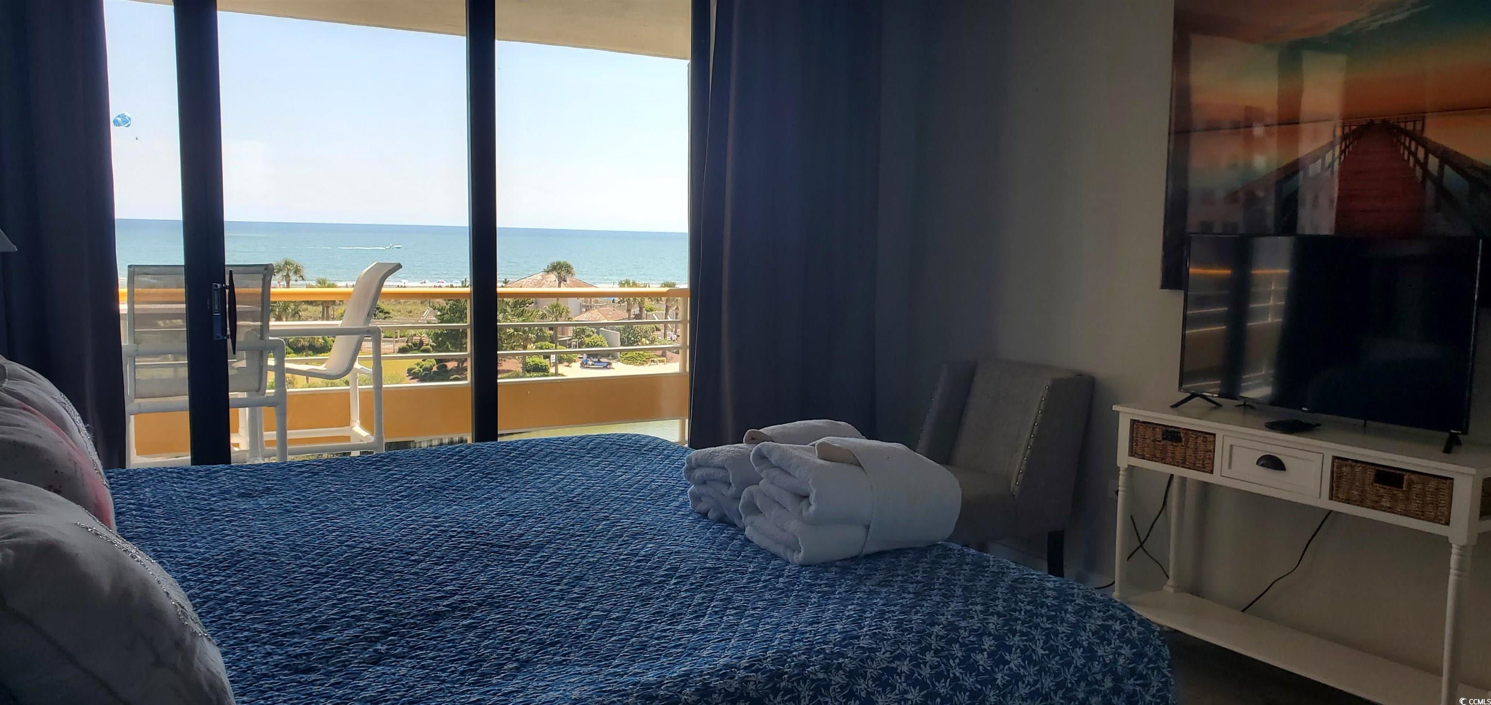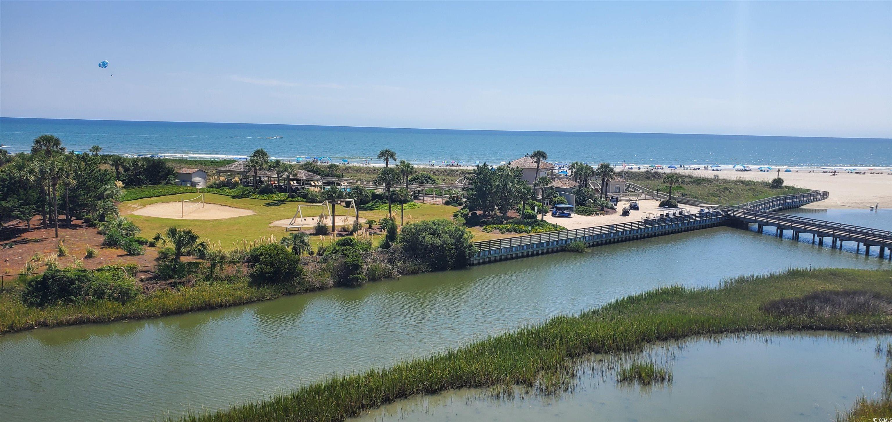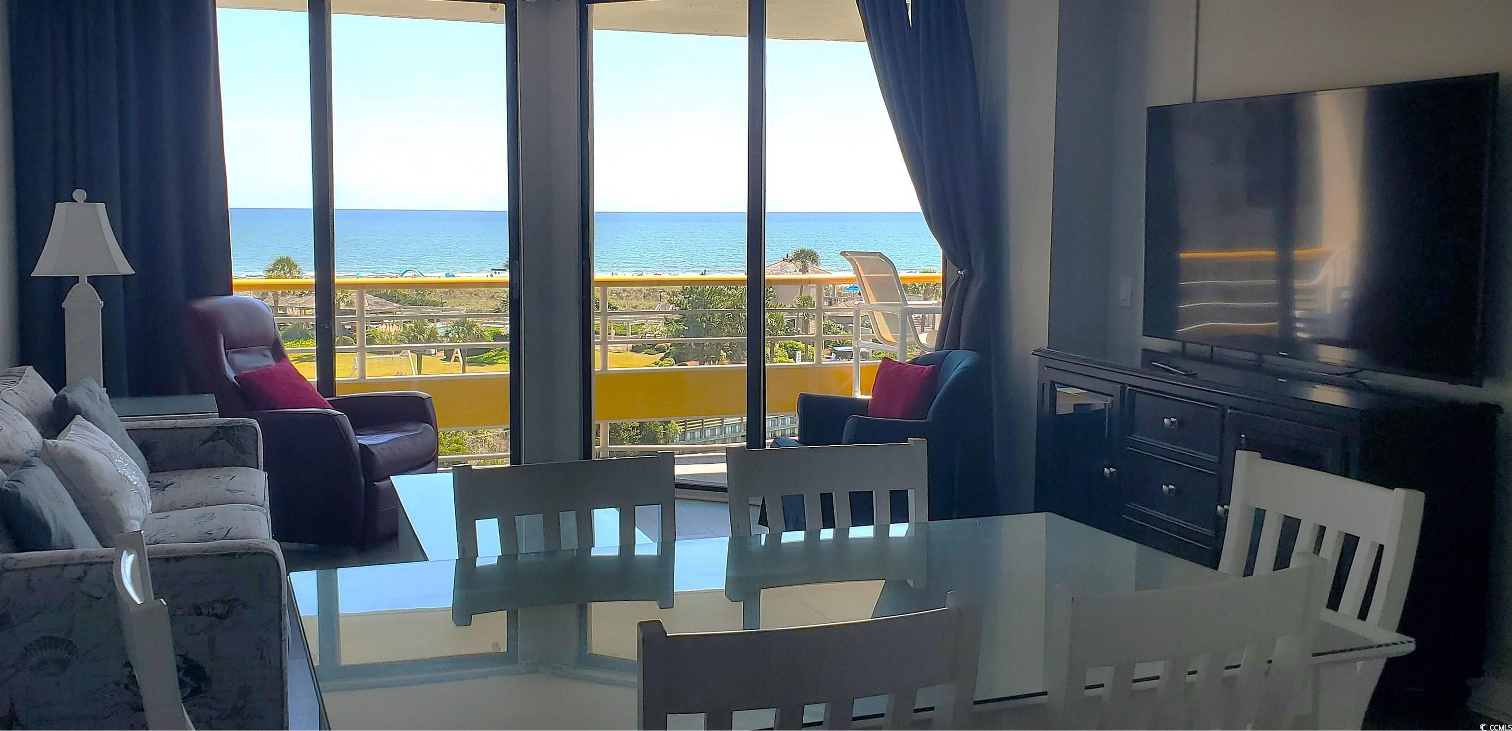 Outstanding views, convenient location and a great value! On the 5th living level, there are wonderful views of the ocean, beach, the Creek, and Beach Club. The large balcony stretches across the living area and the primary bedroom to offer excellent views from the interior of both spaces. There is balcony access from the living area and primary bedroom, there are multiple views of the ocean, beach and marshes to enjoy. Sold completely furnished. Ocean Creek has 57-acres of park-like grounds. 24-hour gated security, tennis center, pickleball court, putting green, multiple outdoor pools, and an indoor pool with whirlpool. The community has a wonderful oceanfront beach club with a snack bar and grill open in season, sand volleyball court, outdoor pool, playground, lockers, and restrooms. Building insurance is assessed annually. Property is currently a vacation rental. All figs. & sq. ft. approximate.