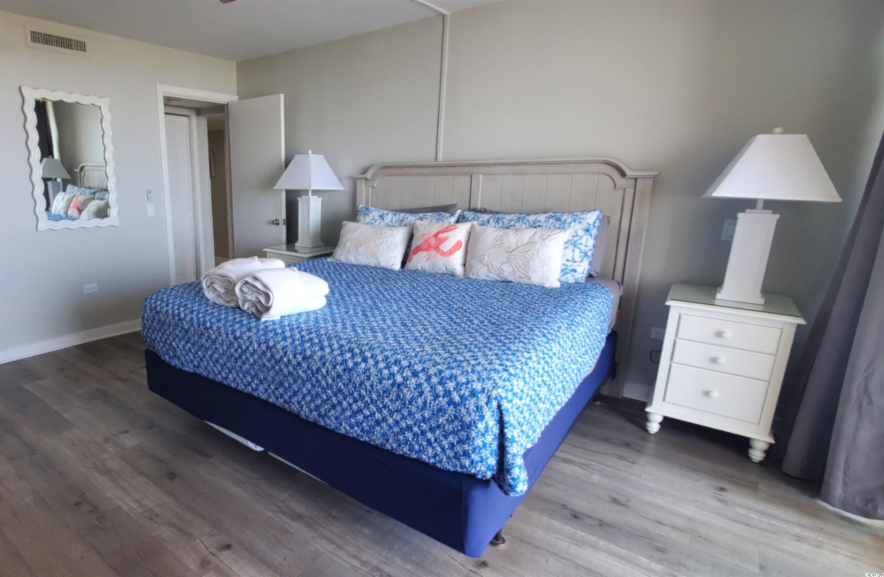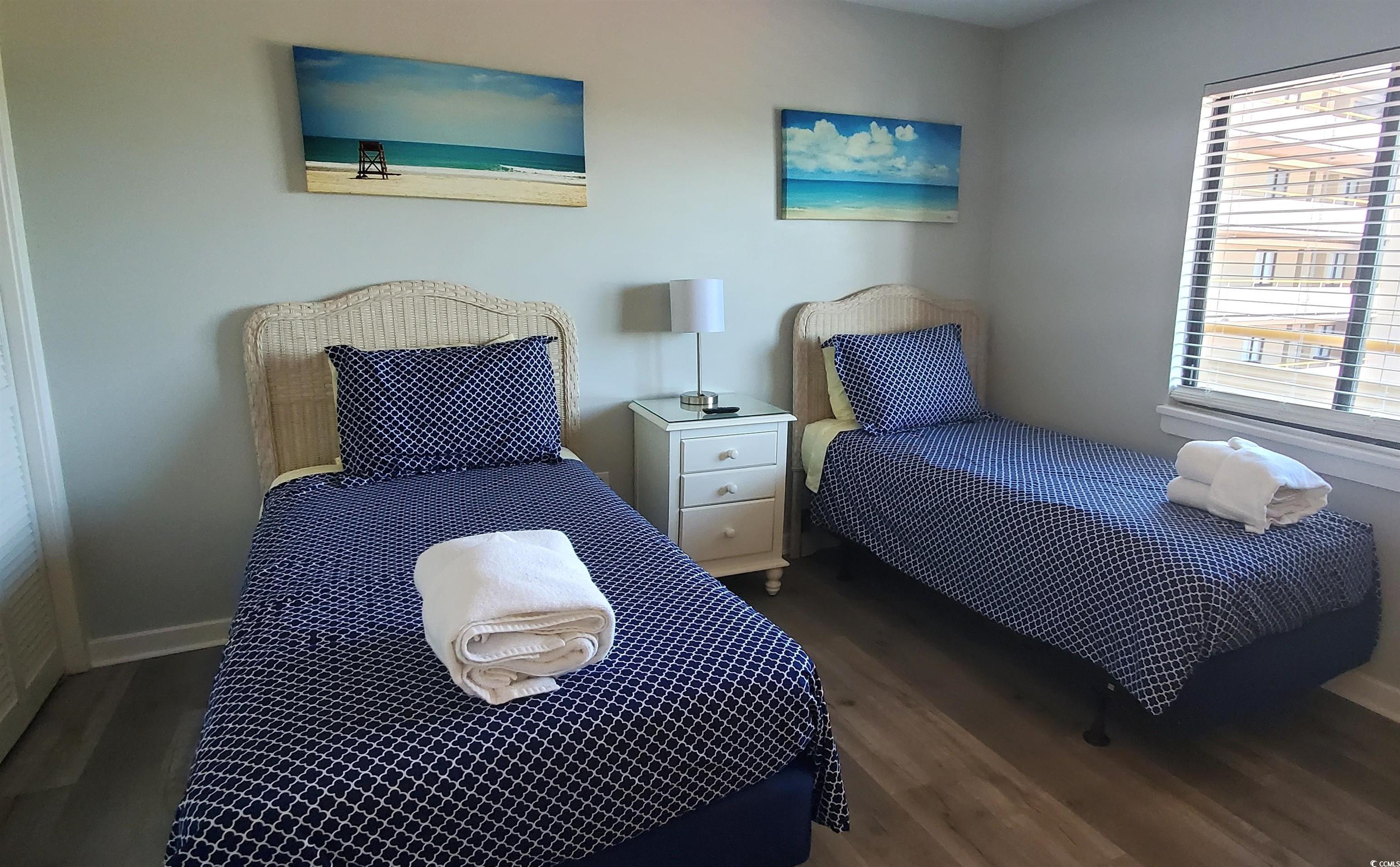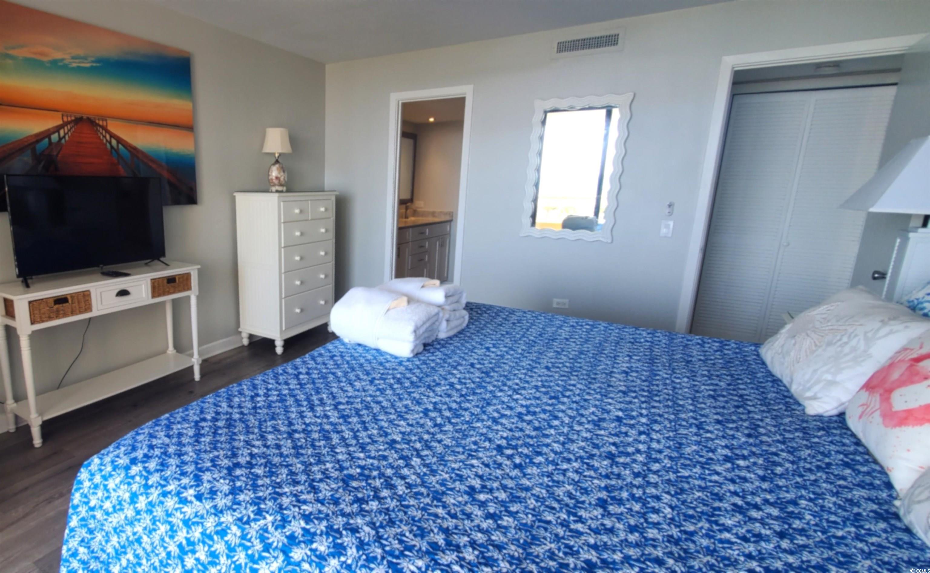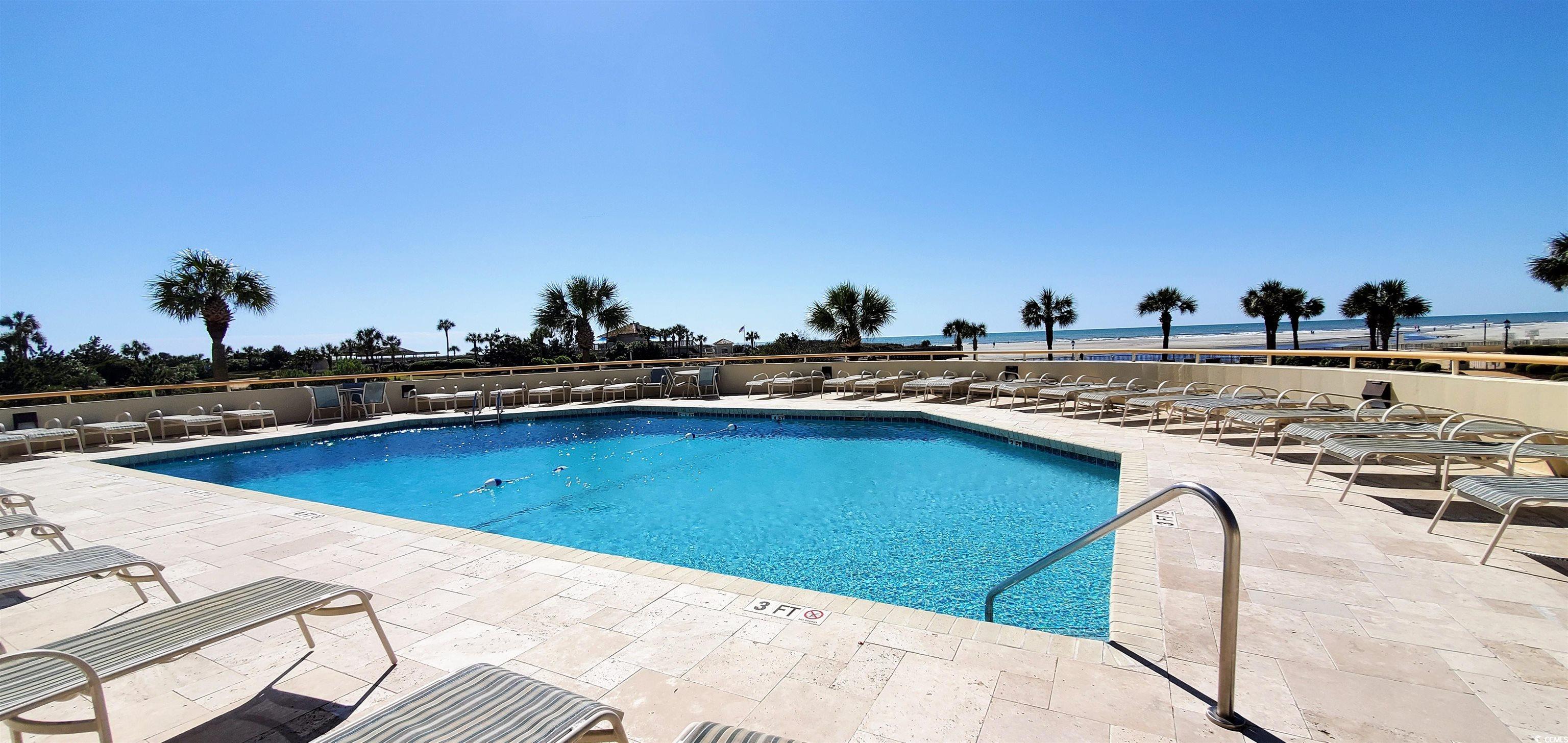 Outstanding views, convenient location and a great value! On the 5th living level, there are wonderful views of the ocean, beach, the Creek, and Beach Club. The large balcony stretches across the living area and the primary bedroom to offer excellent views from the interior of both spaces. There is balcony access from the living area and primary bedroom, there are multiple views of the ocean, beach and marshes to enjoy. Sold completely furnished. Ocean Creek has 57-acres of park-like grounds. 24-hour gated security, tennis center, pickleball court, putting green, multiple outdoor pools, and an indoor pool with whirlpool. The community has a wonderful oceanfront beach club with a snack bar and grill open in season, sand volleyball court, outdoor pool, playground, lockers, and restrooms. Building insurance is assessed annually. Property is currently a vacation rental. All figs. & sq. ft. approximate.