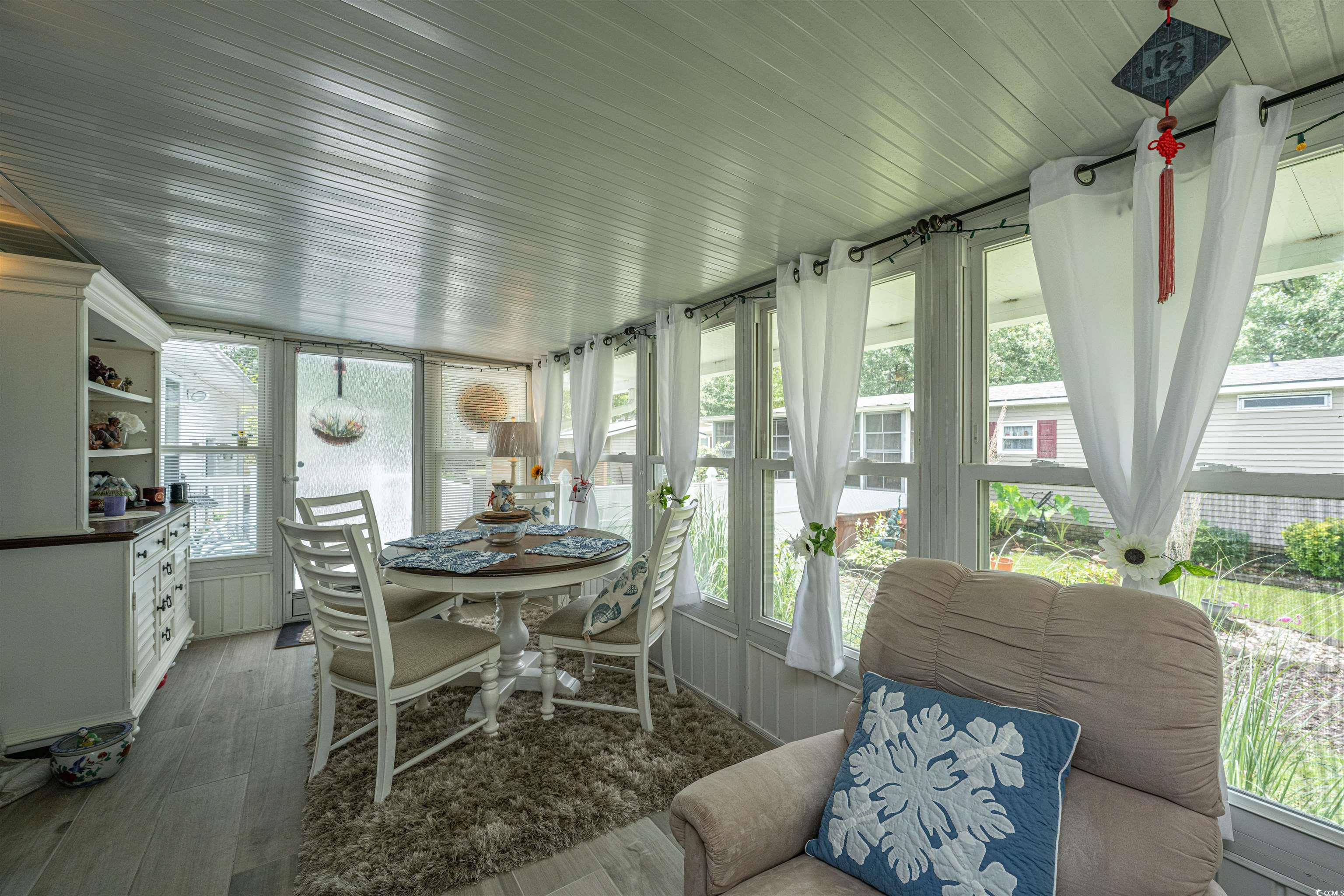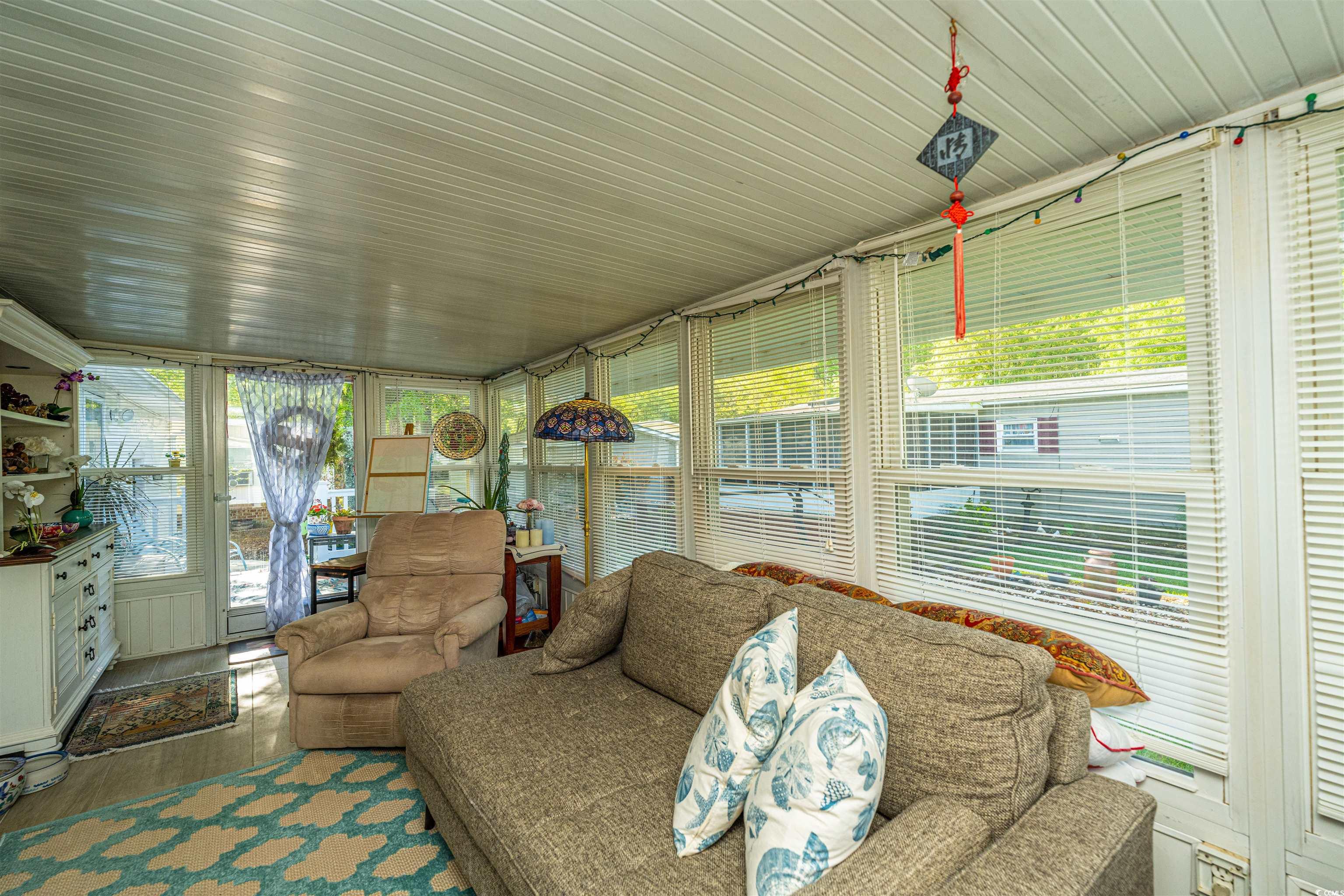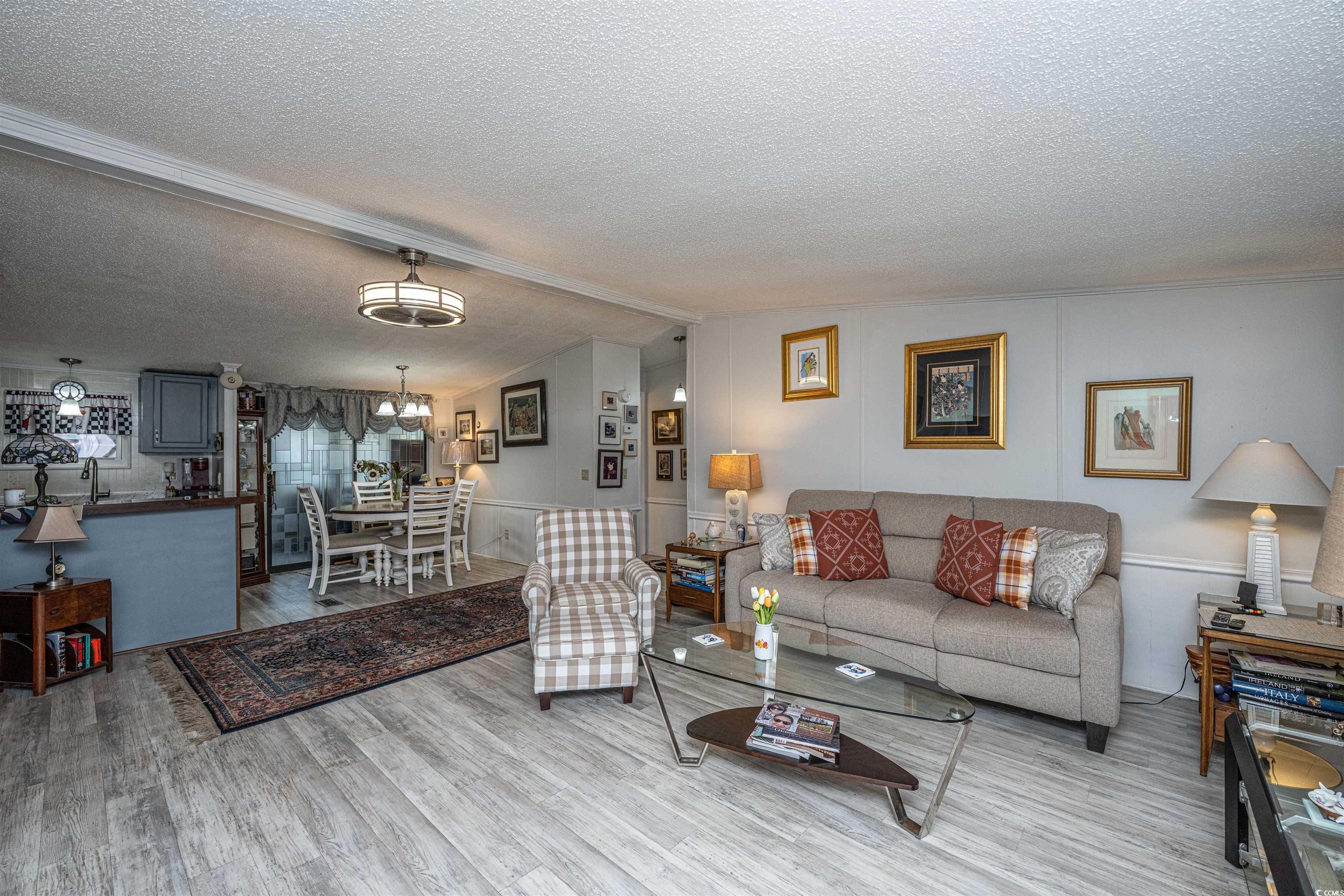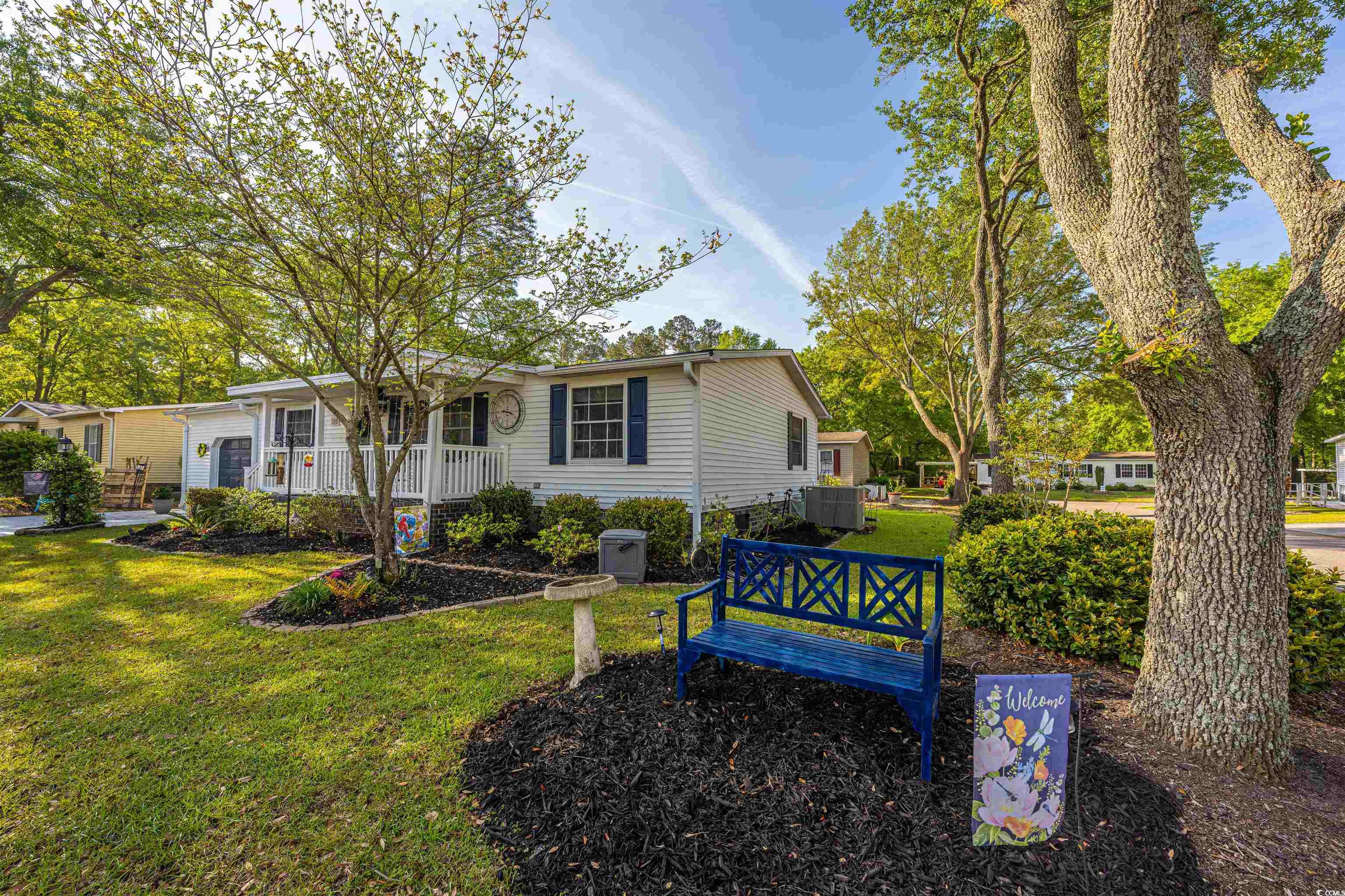 Welcome to Southern Palms, a gated 55+ community in Ladson offering a peaceful, active lifestyle. Here, you own your beautifully remodeled manufactured home while leasing the land. This home was completely renovated in 2017 with additional upgrades in 2024 including HVAC, flooring, countertops, appliances plumbing, electrical, and garage door. Step inside to an inviting open floor plan where a spacious living room flows seamlessly into the updated kitchen and dining area. The private primary suite is thoughtfully separated from the two guest bedrooms and full bath, offering comfort and privacy. Enjoy your mornings on the covered front porch or relax year-round in the all-seasons sunroom. The fenced backyard features a patio designed for both quiet moments and entertaining. Residents of Southern Palms enjoy a variety of amenities: a sparkling pool, putting green, fitness room, billiards, and scenic walking paths around the community pond.