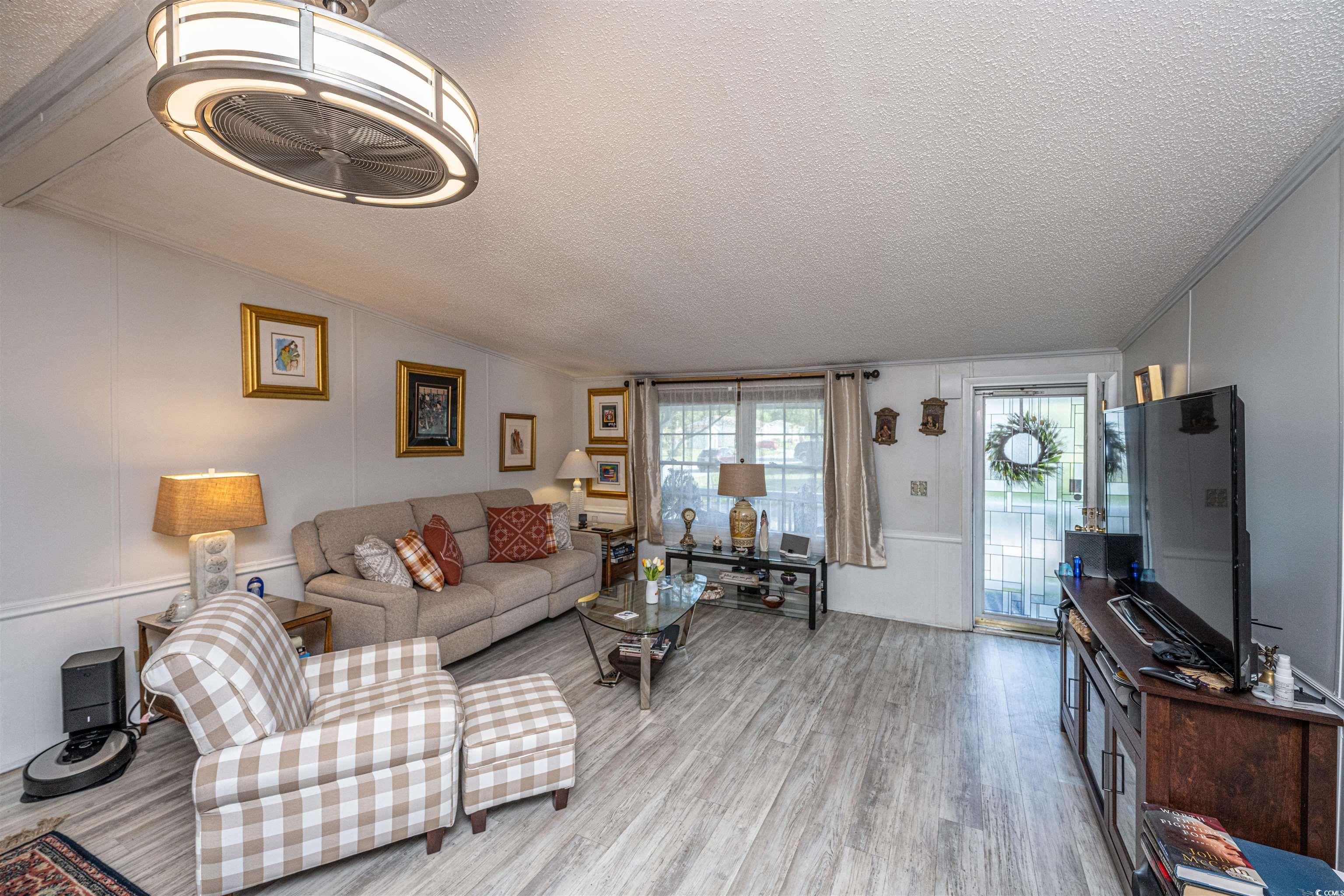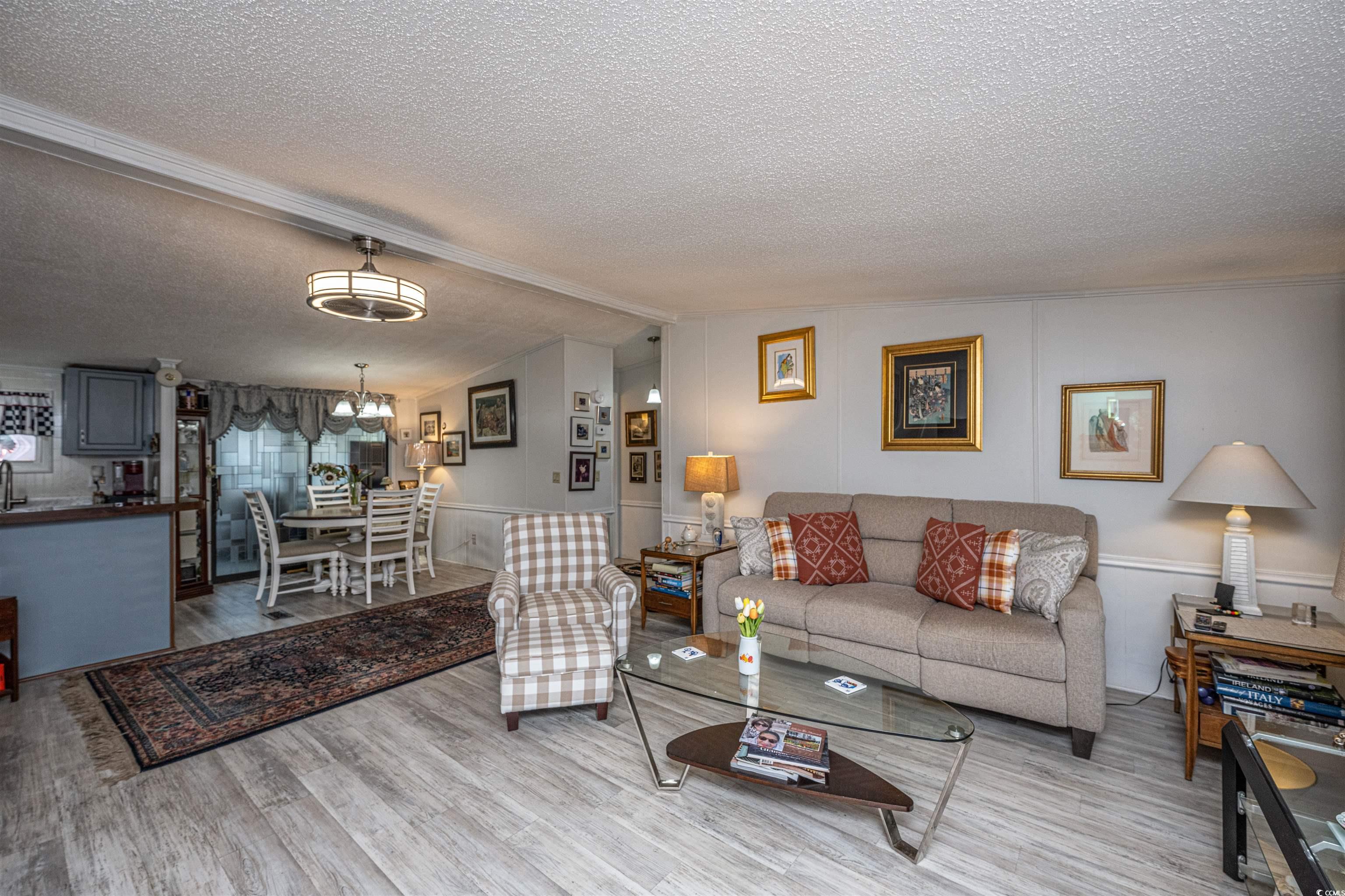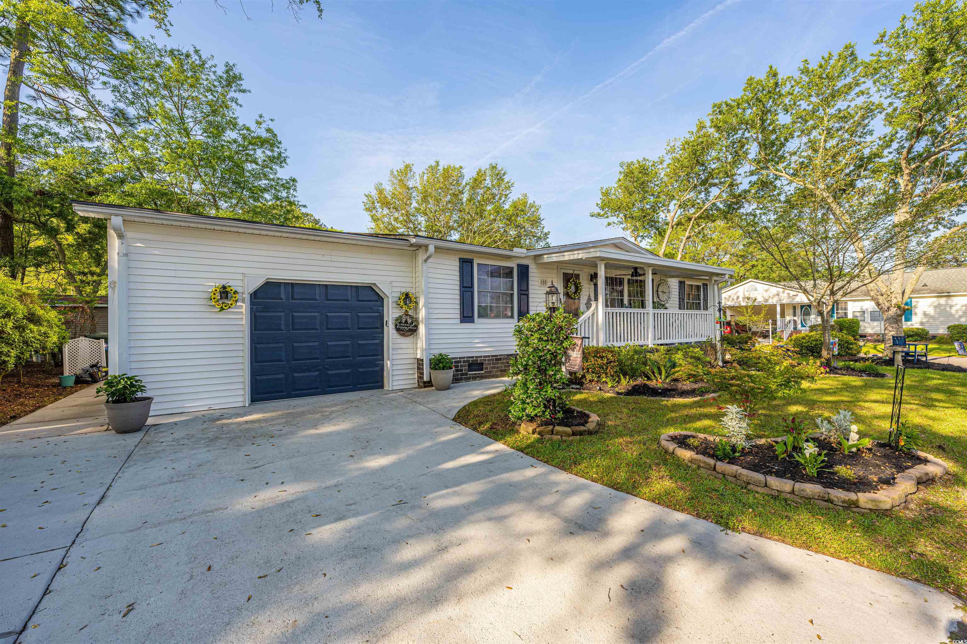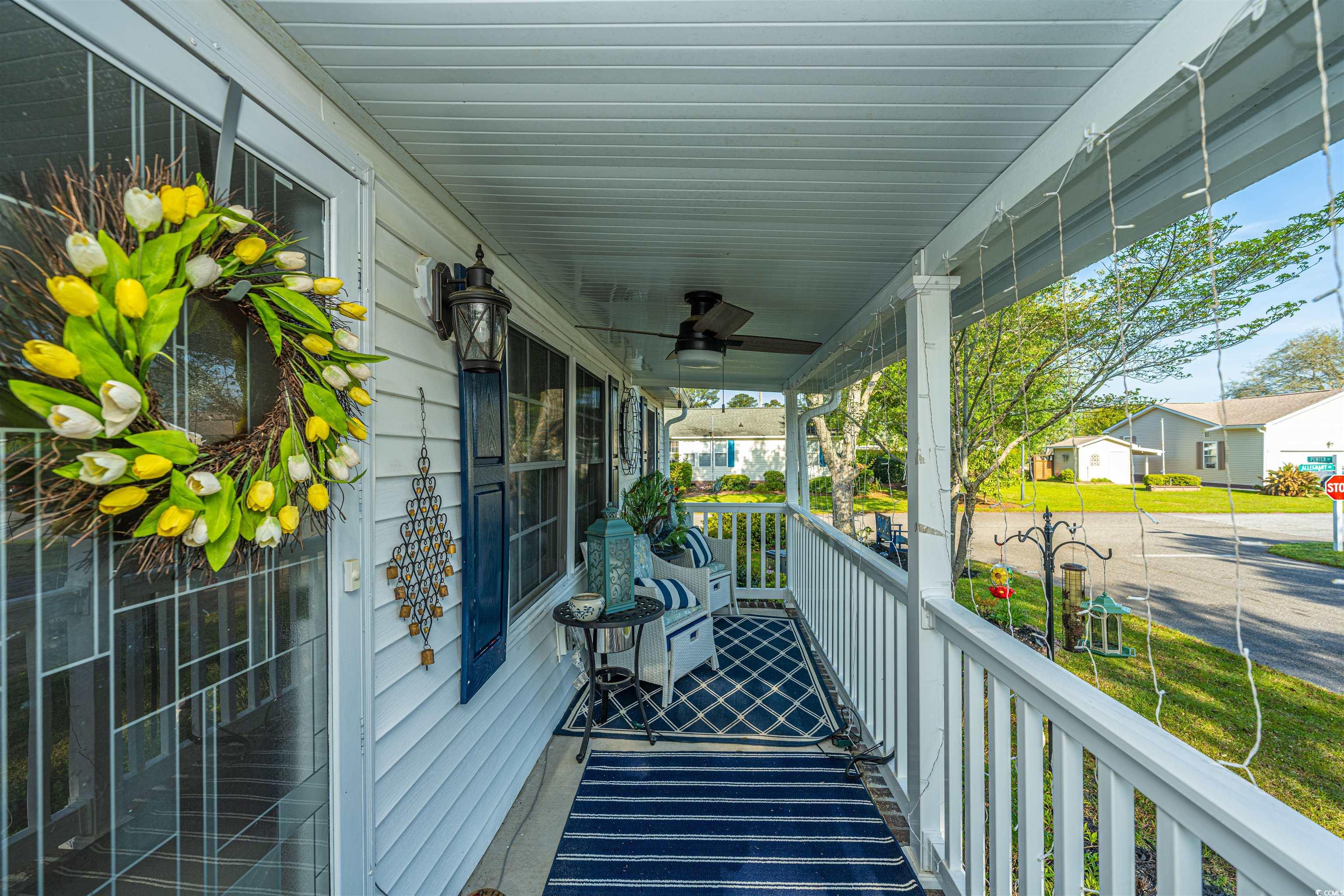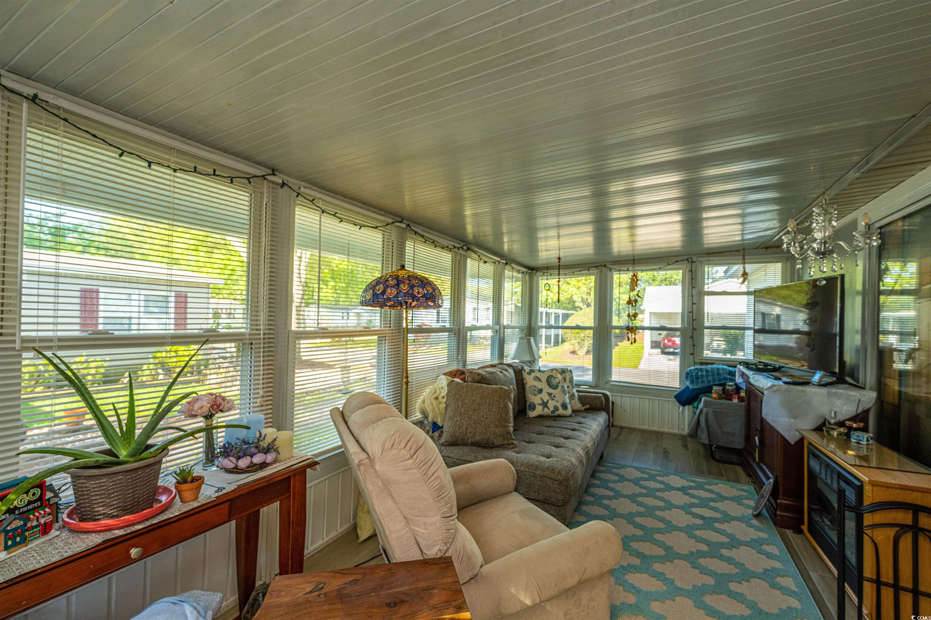 Welcome to Southern Palms, a gated 55+ community in Ladson offering a peaceful, active lifestyle. Here, you own your beautifully remodeled manufactured home while leasing the land. This home was completely renovated in 2017 with additional upgrades in 2024 including HVAC, flooring, countertops, appliances plumbing, electrical, and garage door. Step inside to an inviting open floor plan where a spacious living room flows seamlessly into the updated kitchen and dining area. The private primary suite is thoughtfully separated from the two guest bedrooms and full bath, offering comfort and privacy. Enjoy your mornings on the covered front porch or relax year-round in the all-seasons sunroom. The fenced backyard features a patio designed for both quiet moments and entertaining. Residents of Southern Palms enjoy a variety of amenities: a sparkling pool, putting green, fitness room, billiards, and scenic walking paths around the community pond.