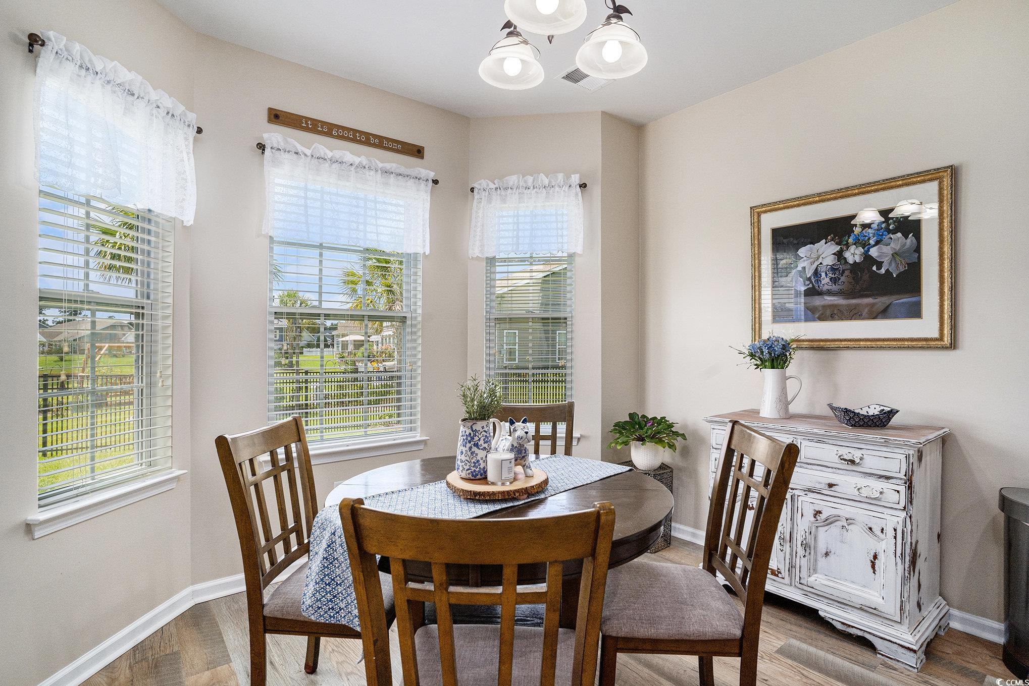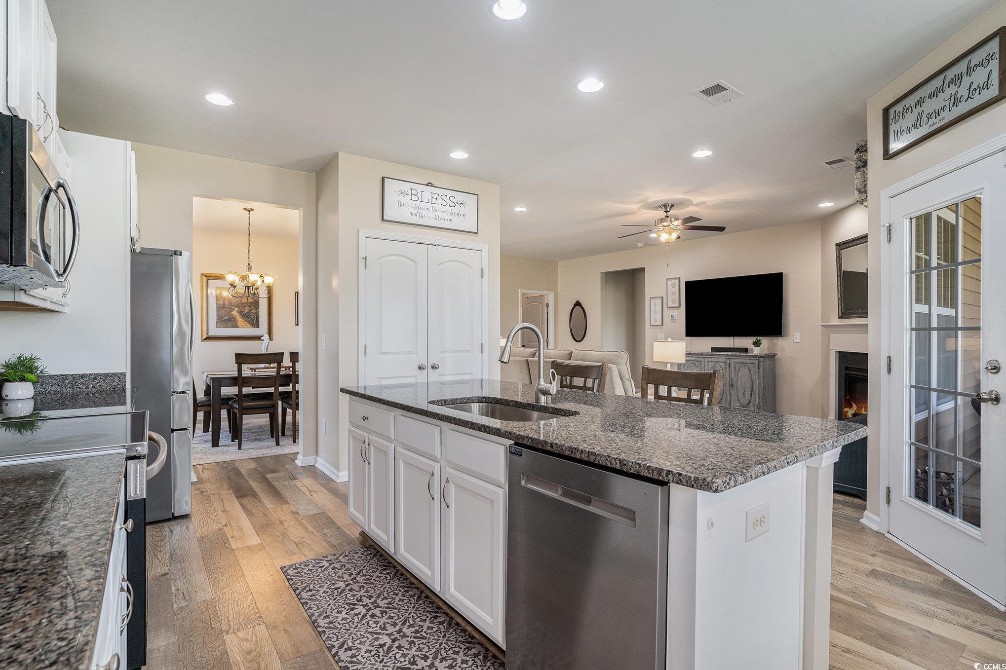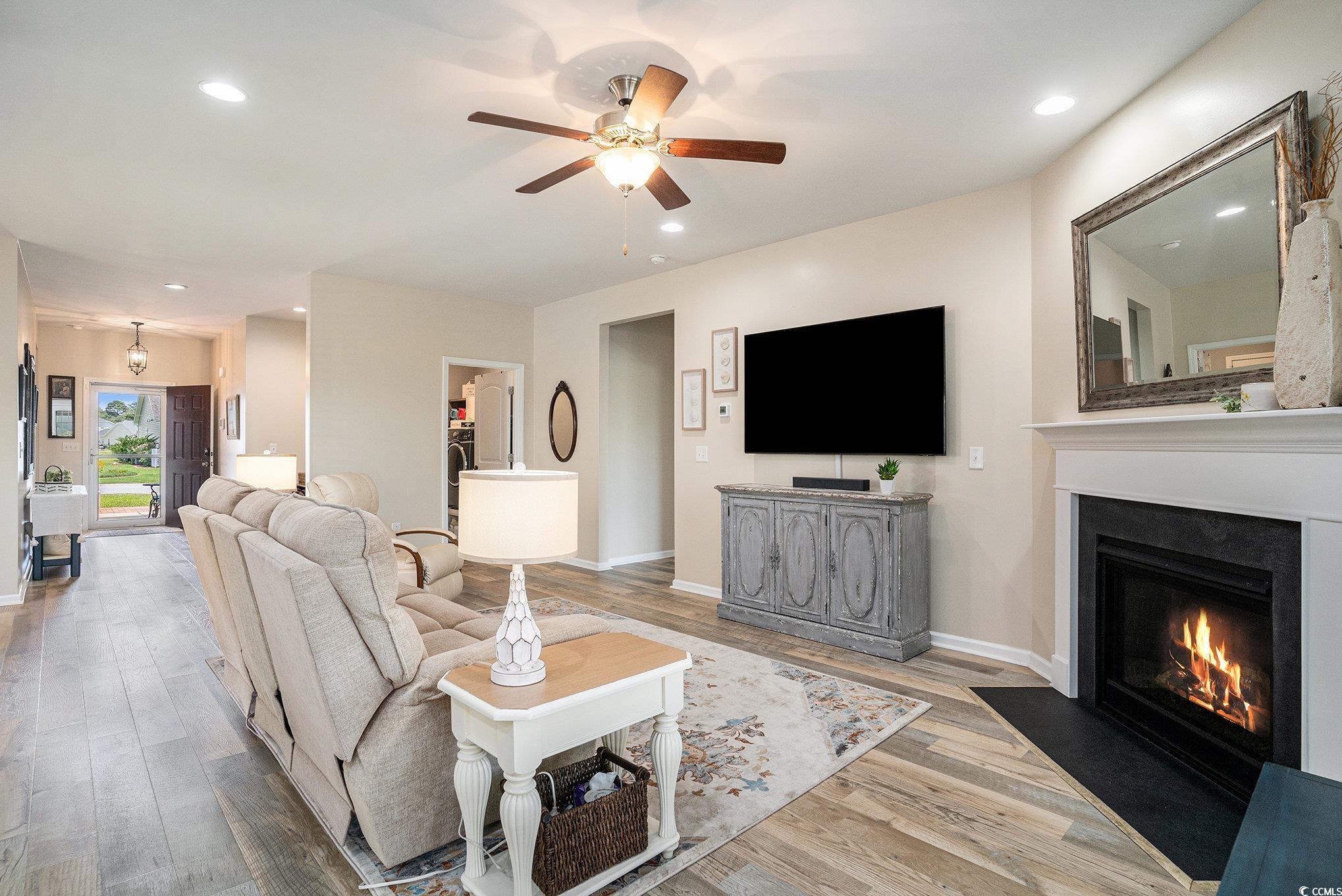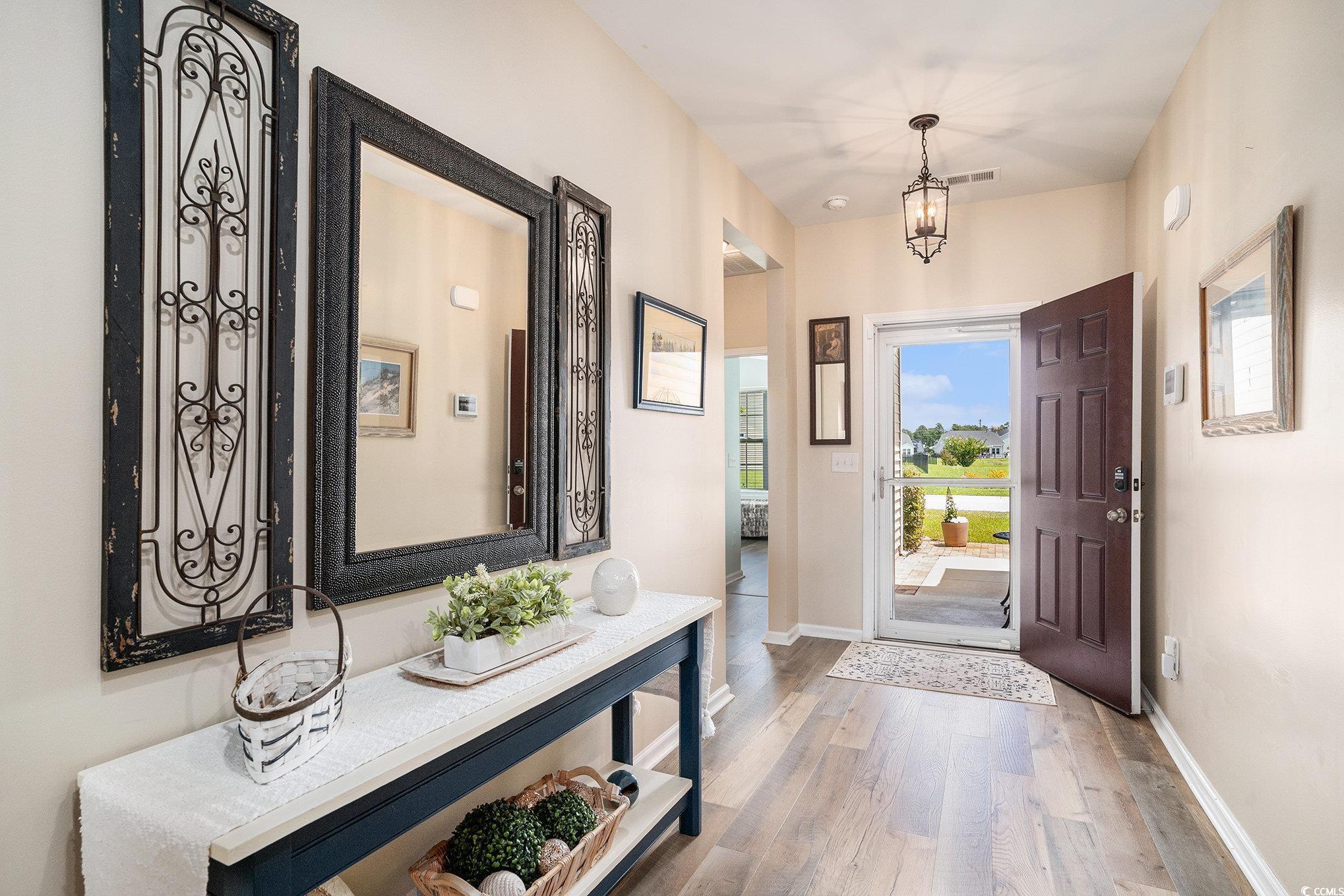 Discover this meticulously maintained 3-bedroom, 2-bathroom residence, perfectly situated on a tranquil side street within this highly desirable natural gas community, Glenmoor. This home offers an immediate sense of comfort and elegance, thoughtfully designed with an open concept floorplan that seamlessly blends modern living with timeless appeal. The main entryway provides ample space, allowing for personalized customization to welcome guests. A dedicated separate dining room offers an ideal setting for formal meals or intimate gatherings, complementing the home's versatile layout. The heart of this home is its inviting gathering room, an expansive space anchored by a beautiful fireplace, perfect for creating warm and cozy evenings. Adjacent to this, culinary enthusiasts will appreciate the kitchen, which boasts abundant counter space and a charming breakfast nook, making meal preparation and casual dining a delight. All stainless steel appliances, including the refrigerator, washer, and dryer, have been upgraded and convey with the home, ensuring a truly move-in ready experience. Experience the elegance and durability of luxury RevWood flooring throughout the entire residence, with no carpet to be found. This premium flooring combines the stunning visual appeal of hardwood with exceptional toughness, offering superior scratch and water resistance. Engineered for long-lasting performance, RevWood ensures lasting beauty and easy maintenance, an ideal choice for an active lifestyle. Step outside to a tranquil screened-in porch, where a truly amazing and private view of the lake's full length awaits. This serene panorama features graceful ducks and swans, ensuring peaceful moments without a neighbor in sight – a genuine backyard oasis designed for relaxation and enjoyment. Beyond the home's interior, practicality meets perfection within the garage, which is thoughtfully equipped with a utility sink, workbench, and cabinets, offering unmatched convenience for hobbies or storage. The property also boasts stunning curb appeal, featuring beautiful landscaping and curbscaping that reflect its meticulous care and enhance its overall aesthetic. Residents of the Glenmoor community enjoy exclusive access to a refreshing community pool, providing an additional avenue for leisure and recreation. The prime location on a quiet side street ensures a peaceful living environment while offering easy access to local amenities, dining, and entertainment, including the Conway Riverwalk and Myrtle Beach attractions.