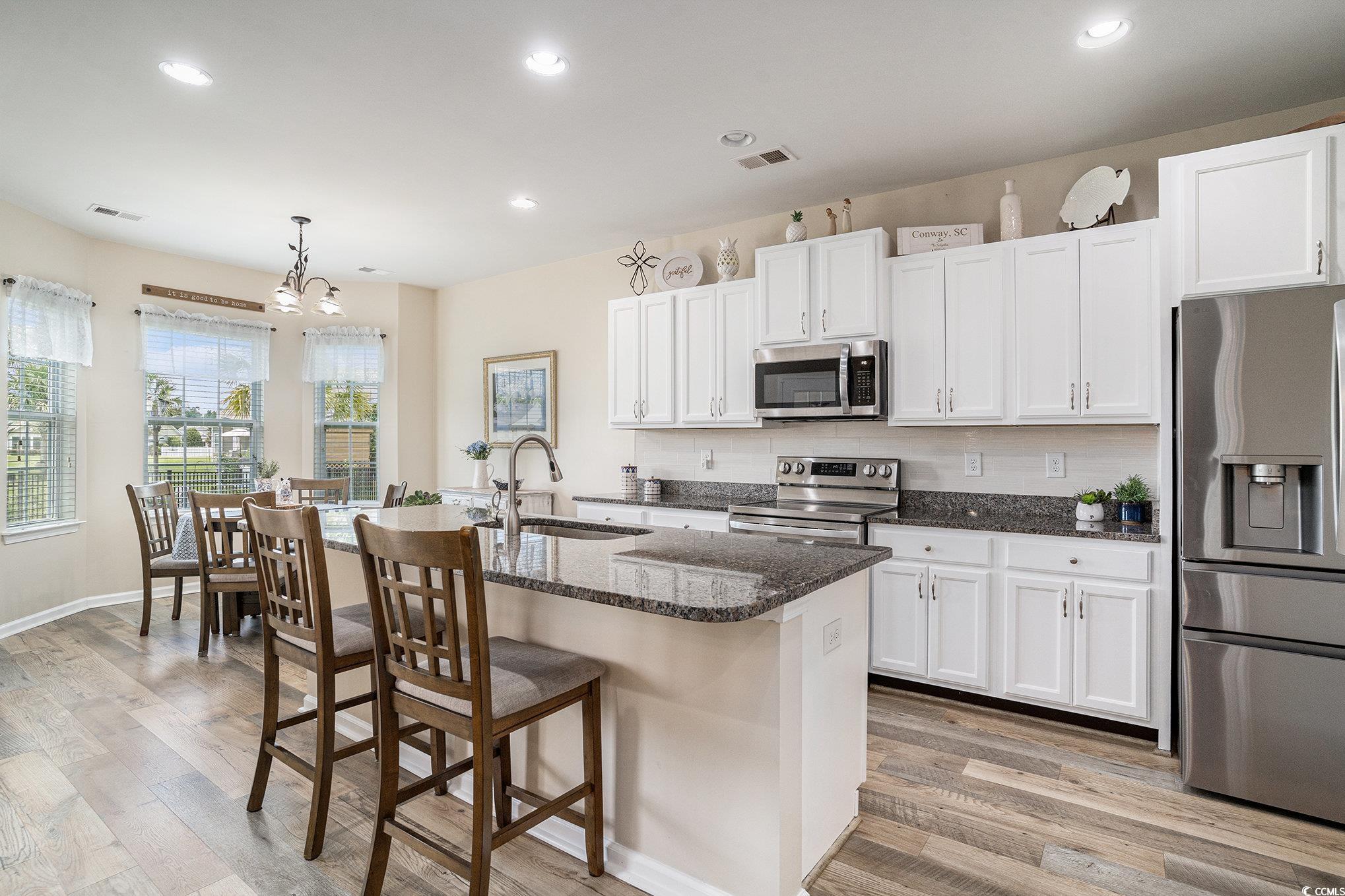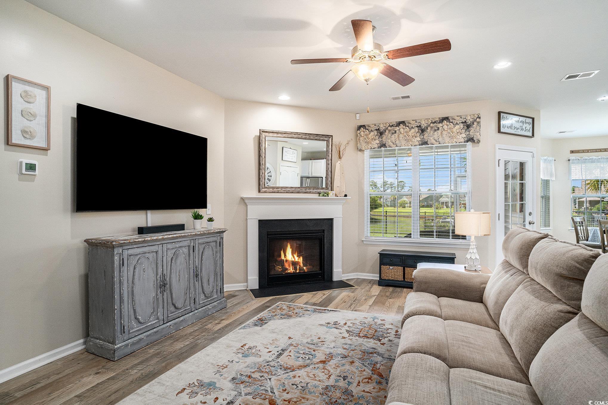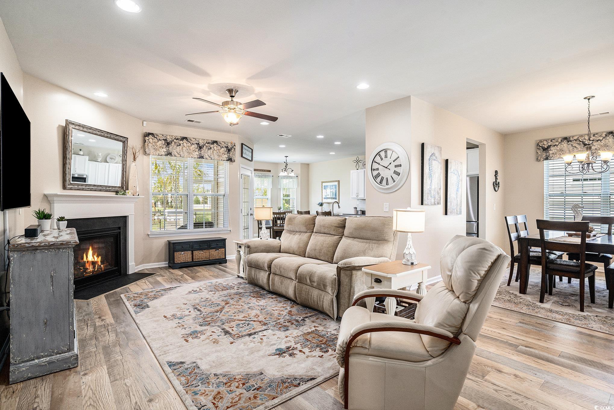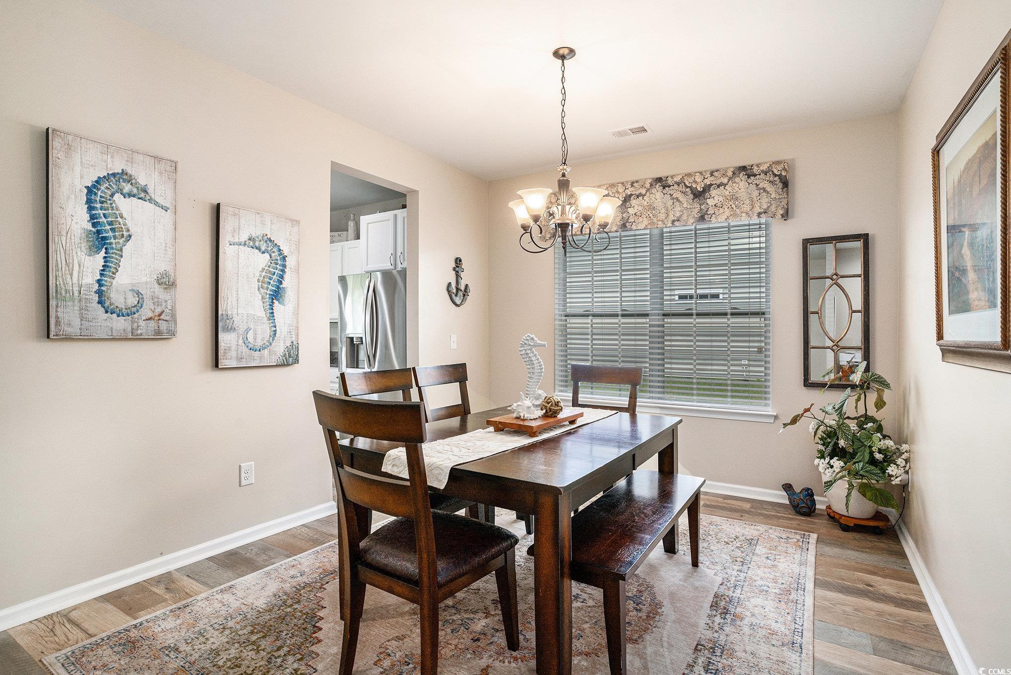 Discover this meticulously maintained 3-bedroom, 2-bathroom residence, perfectly situated on a tranquil side street within this highly desirable natural gas community, Glenmoor. This home offers an immediate sense of comfort and elegance, thoughtfully designed with an open concept floorplan that seamlessly blends modern living with timeless appeal. The main entryway provides ample space, allowing for personalized customization to welcome guests. A dedicated separate dining room offers an ideal setting for formal meals or intimate gatherings, complementing the home's versatile layout. The heart of this home is its inviting gathering room, an expansive space anchored by a beautiful fireplace, perfect for creating warm and cozy evenings. Adjacent to this, culinary enthusiasts will appreciate the kitchen, which boasts abundant counter space and a charming breakfast nook, making meal preparation and casual dining a delight. All stainless steel appliances, including the refrigerator, washer, and dryer, have been upgraded and convey with the home, ensuring a truly move-in ready experience. Experience the elegance and durability of luxury RevWood flooring throughout the entire residence, with no carpet to be found. This premium flooring combines the stunning visual appeal of hardwood with exceptional toughness, offering superior scratch and water resistance. Engineered for long-lasting performance, RevWood ensures lasting beauty and easy maintenance, an ideal choice for an active lifestyle. Step outside to a tranquil screened-in porch, where a truly amazing and private view of the lake's full length awaits. This serene panorama features graceful ducks and swans, ensuring peaceful moments without a neighbor in sight – a genuine backyard oasis designed for relaxation and enjoyment. Beyond the home's interior, practicality meets perfection within the garage, which is thoughtfully equipped with a utility sink, workbench, and cabinets, offering unmatched convenience for hobbies or storage. The property also boasts stunning curb appeal, featuring beautiful landscaping and curbscaping that reflect its meticulous care and enhance its overall aesthetic. Residents of the Glenmoor community enjoy exclusive access to a refreshing community pool, providing an additional avenue for leisure and recreation. The prime location on a quiet side street ensures a peaceful living environment while offering easy access to local amenities, dining, and entertainment, including the Conway Riverwalk and Myrtle Beach attractions.
