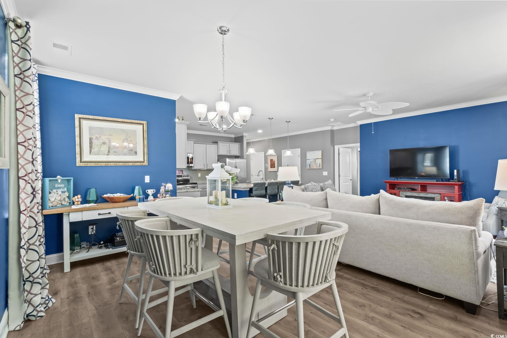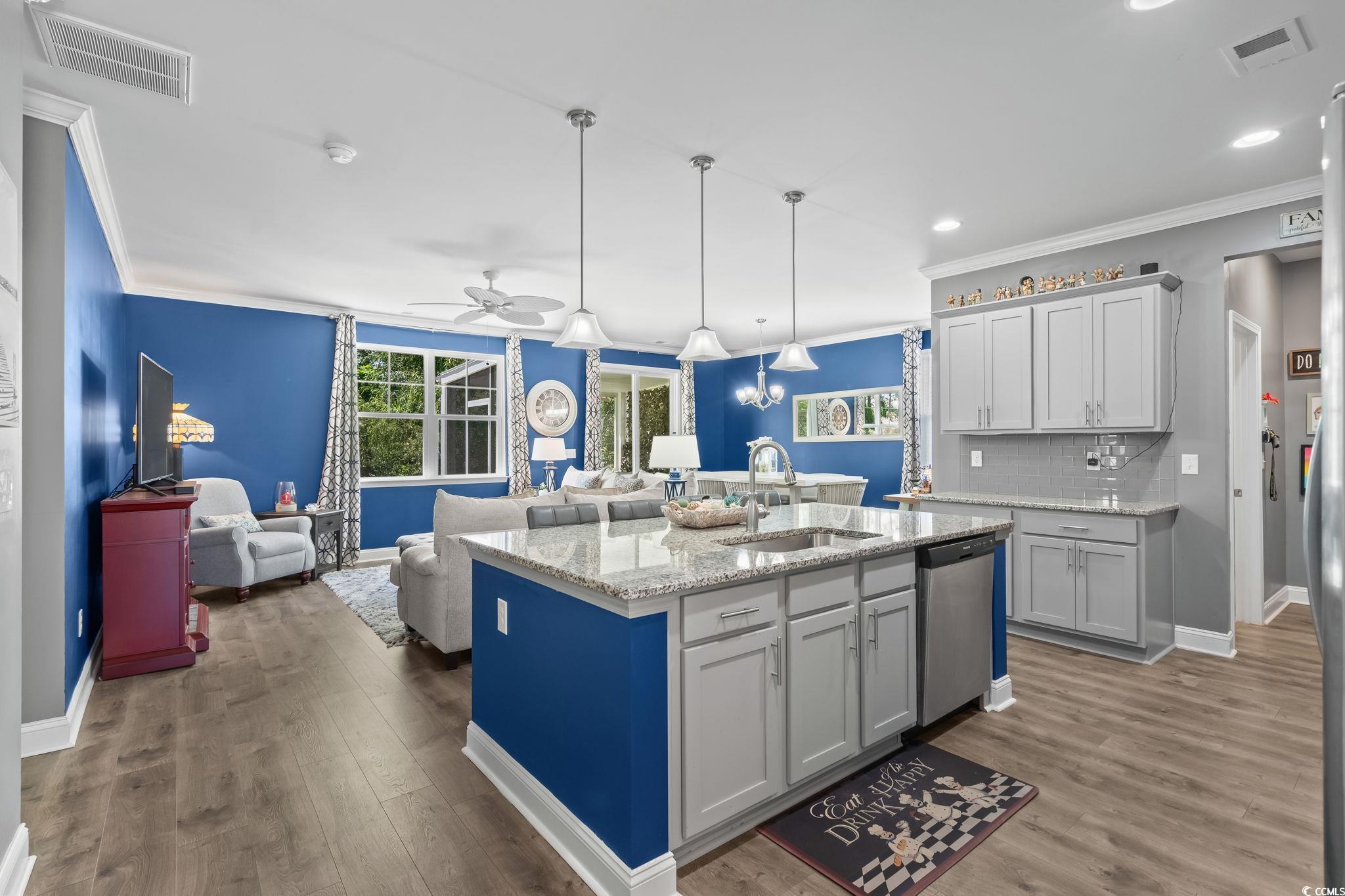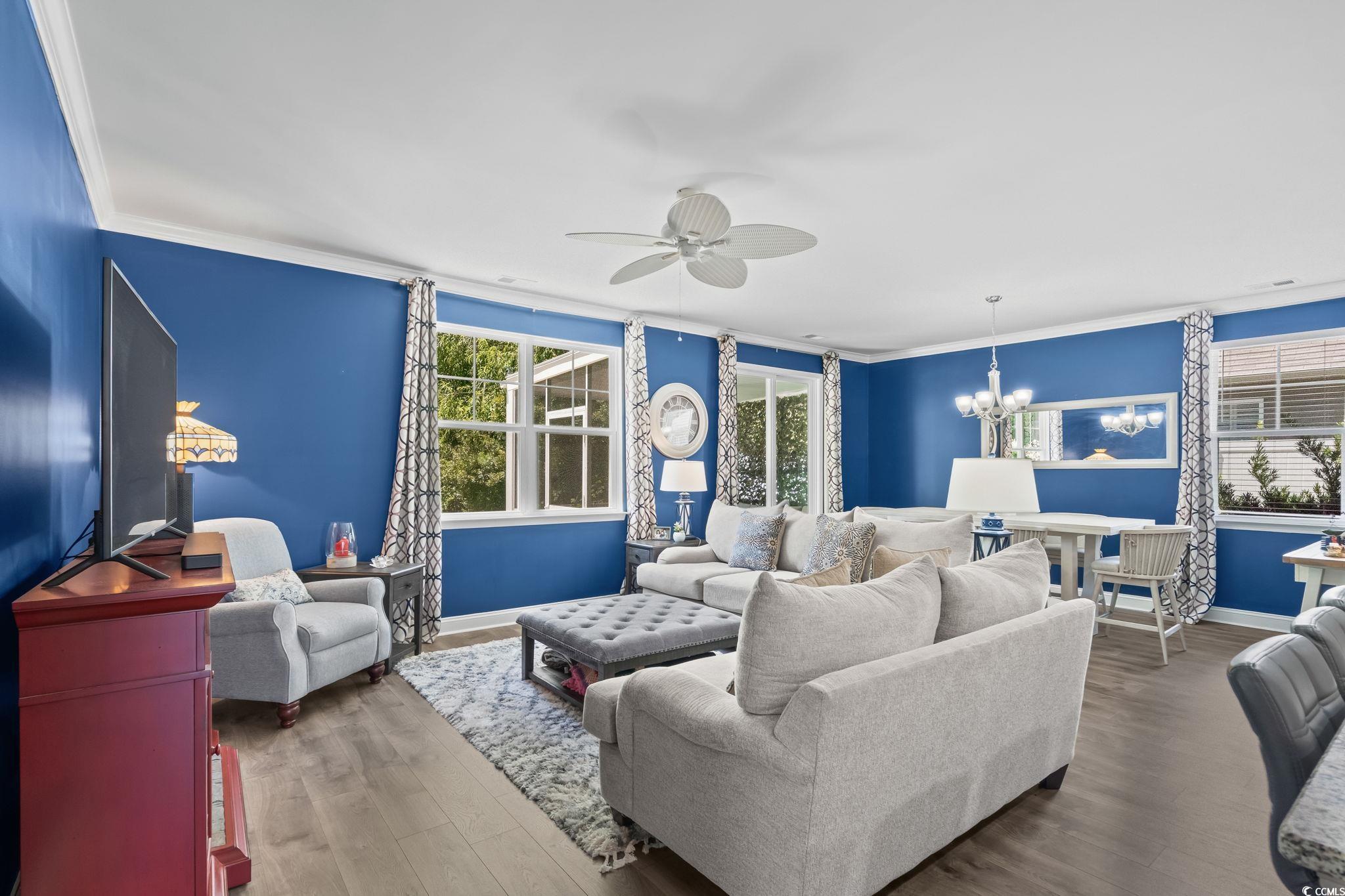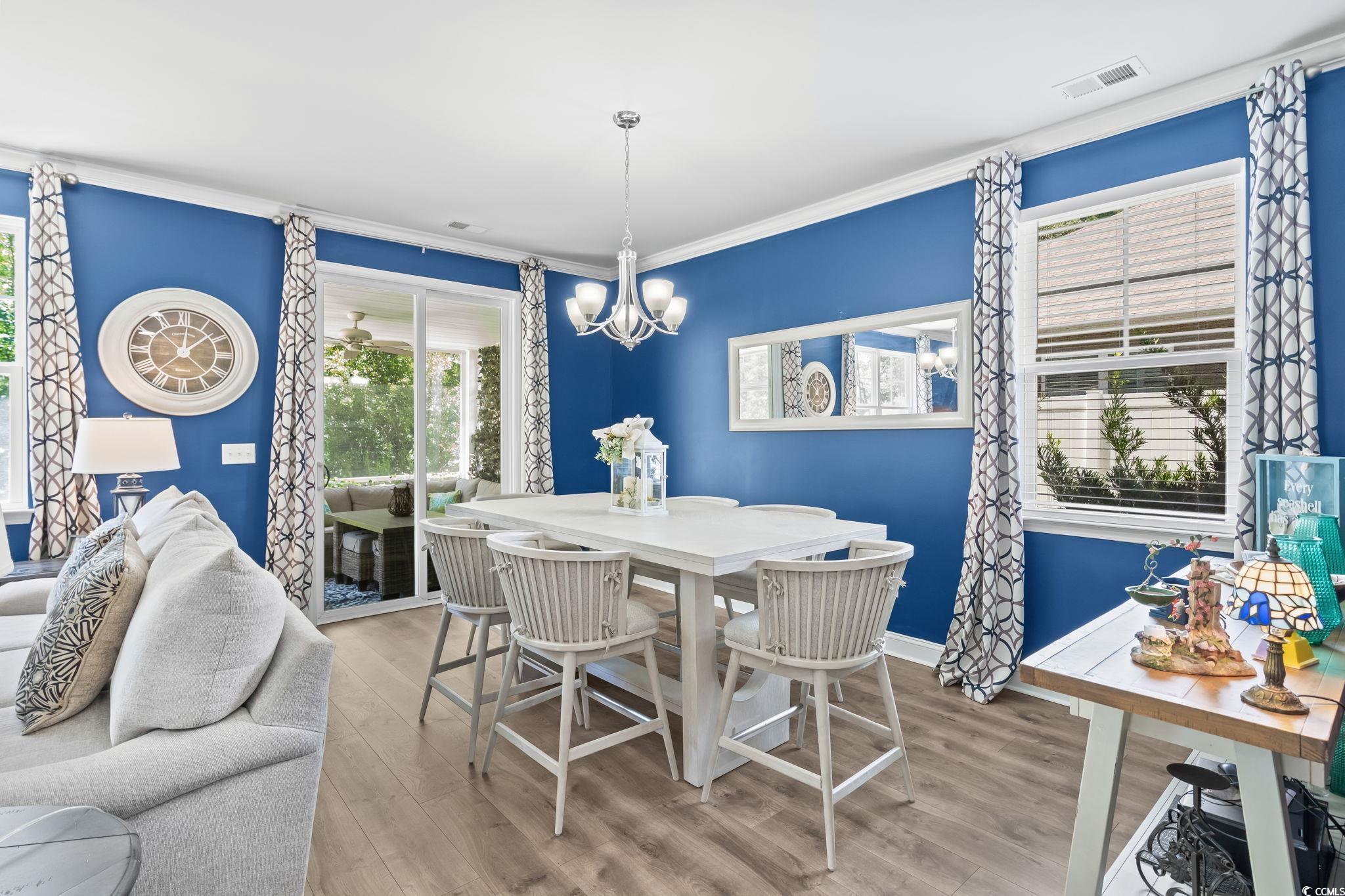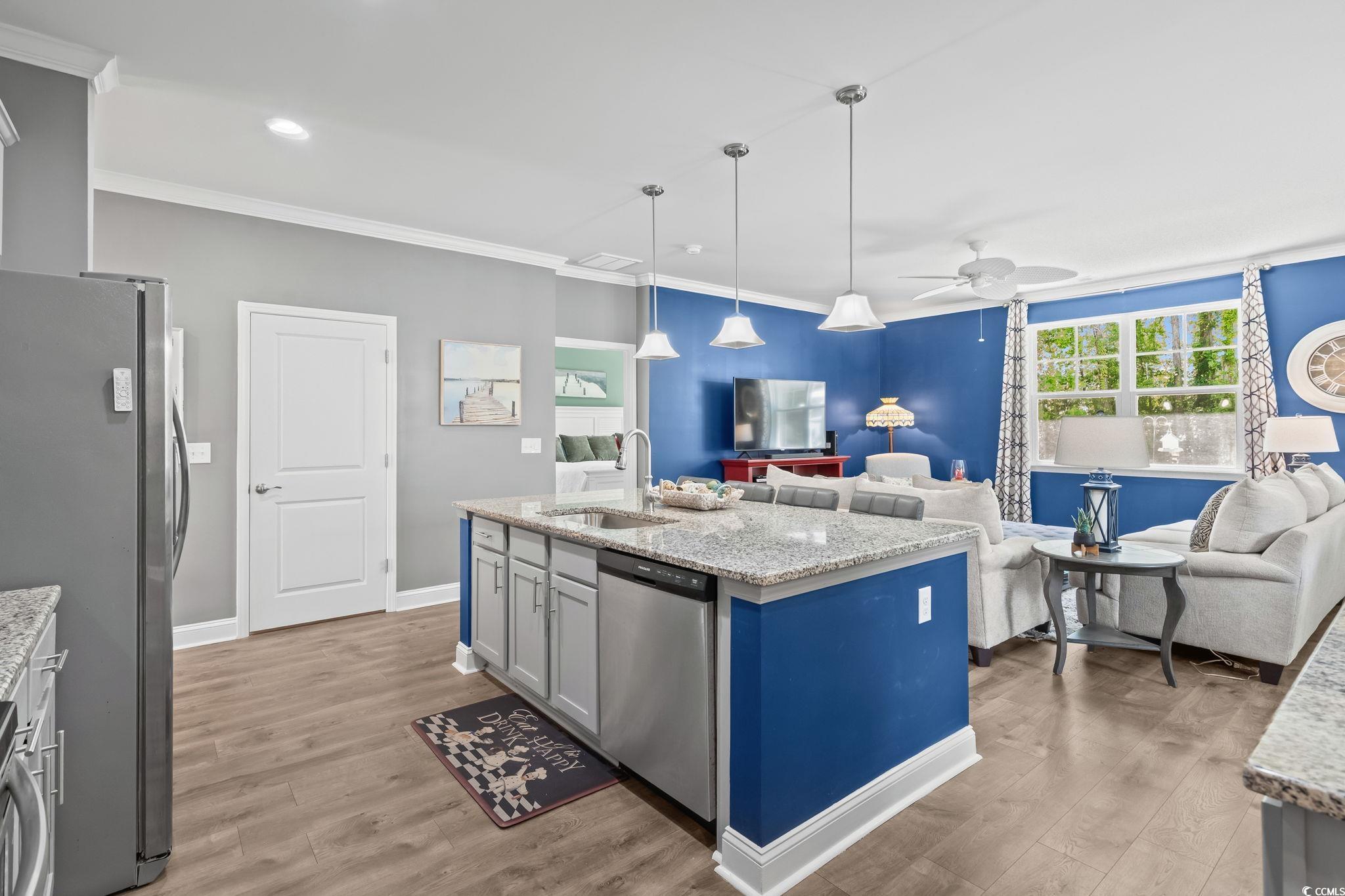 PREMIUM LOT, FULLY UPGRADED, POPULAR FLOOR PLAN, IDEAL LOCATION! GOLF CART RIDE TO THE BEACH! The community of Waters Edge is quietly tucked away near the sweet spot where Hoggs Inlet feeds the Atlantic Ocean to the Cherry Grove channels and you can literally hear the waves crash on quiet breezy evenings from your backyard oasis and from the upstairs bedroom you even get a slight ocean view. Every once in a while a property becomes available that truly has it all! The minute you walk into this meticulously maintained Belfort floorplan you will see that every detail was considered. This open concept floorplan not only gives you a master suite on the first floor but also delivers a huge, fully updated kitchen overlooking a spacious living area making this showstopper perfect for entertaining! Some of the countless upgrades include stainless steel appliances, granite countertops, subway tile backsplash, crown molding, ashen oak smooth laminate flooring, cultured marble countertops in bathrooms, Stefan brushed nickel lighting, cape coast tile in the baths and laundry room, fully screened in back patio, french doors added in the foyer and many more! Upstairs boasts an additional 3 bedrooms and a massive secondary living room area perfect for guests or kids. This home has numerous closet spaces for ample storage and 9-foot ceilings on the main level capitalize every heated square foot. This highly sought-after neighborhood puts you a golf cart ride to the beach or the shopping and dining that North Myrtle Beach is famous for. Waters Edge also has a wonderful community pool, and gym, and the HOA even includes your landscaping and internet!! The good ones never last so schedule your showing today and as always...WELCOME HOME