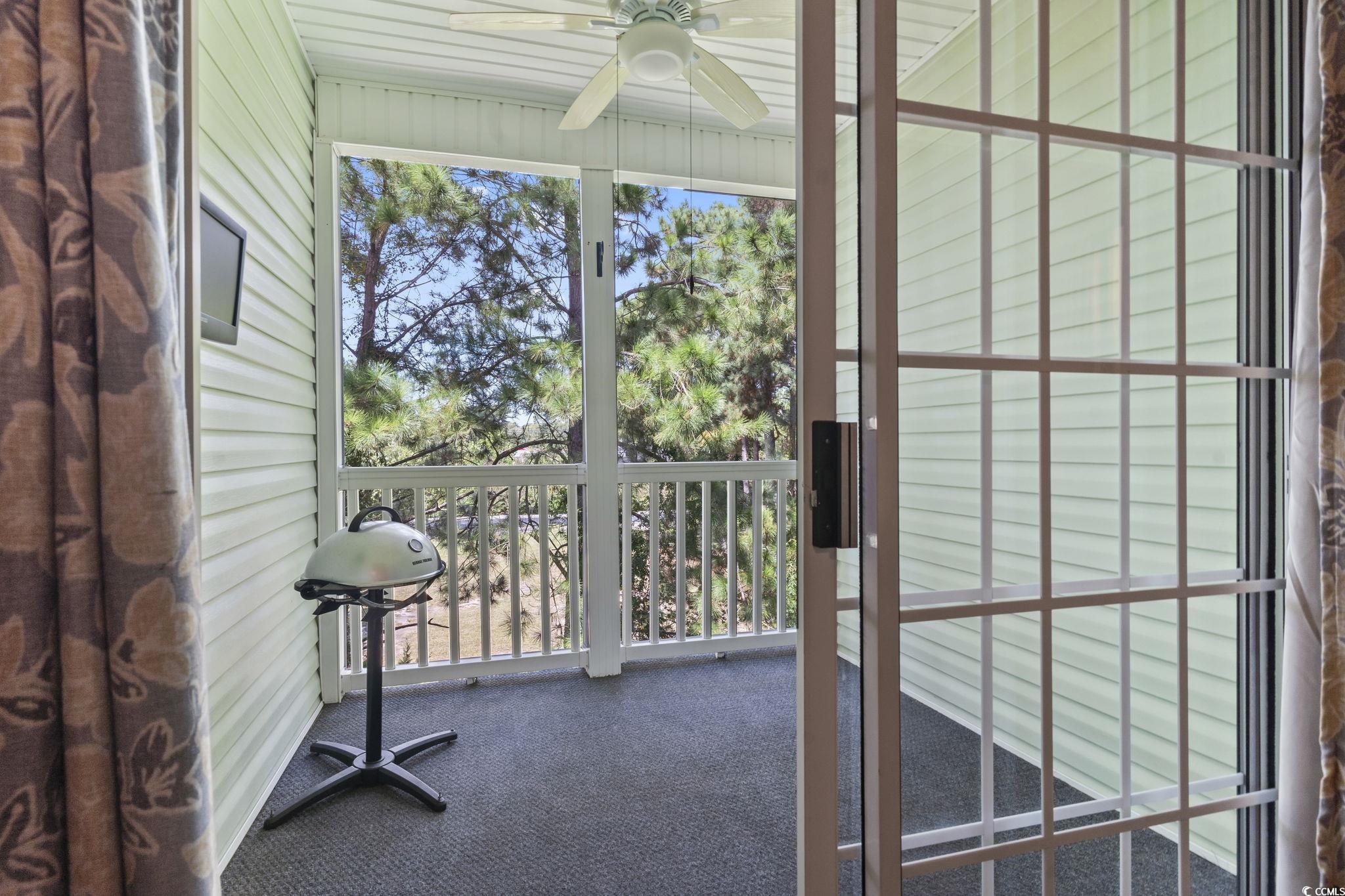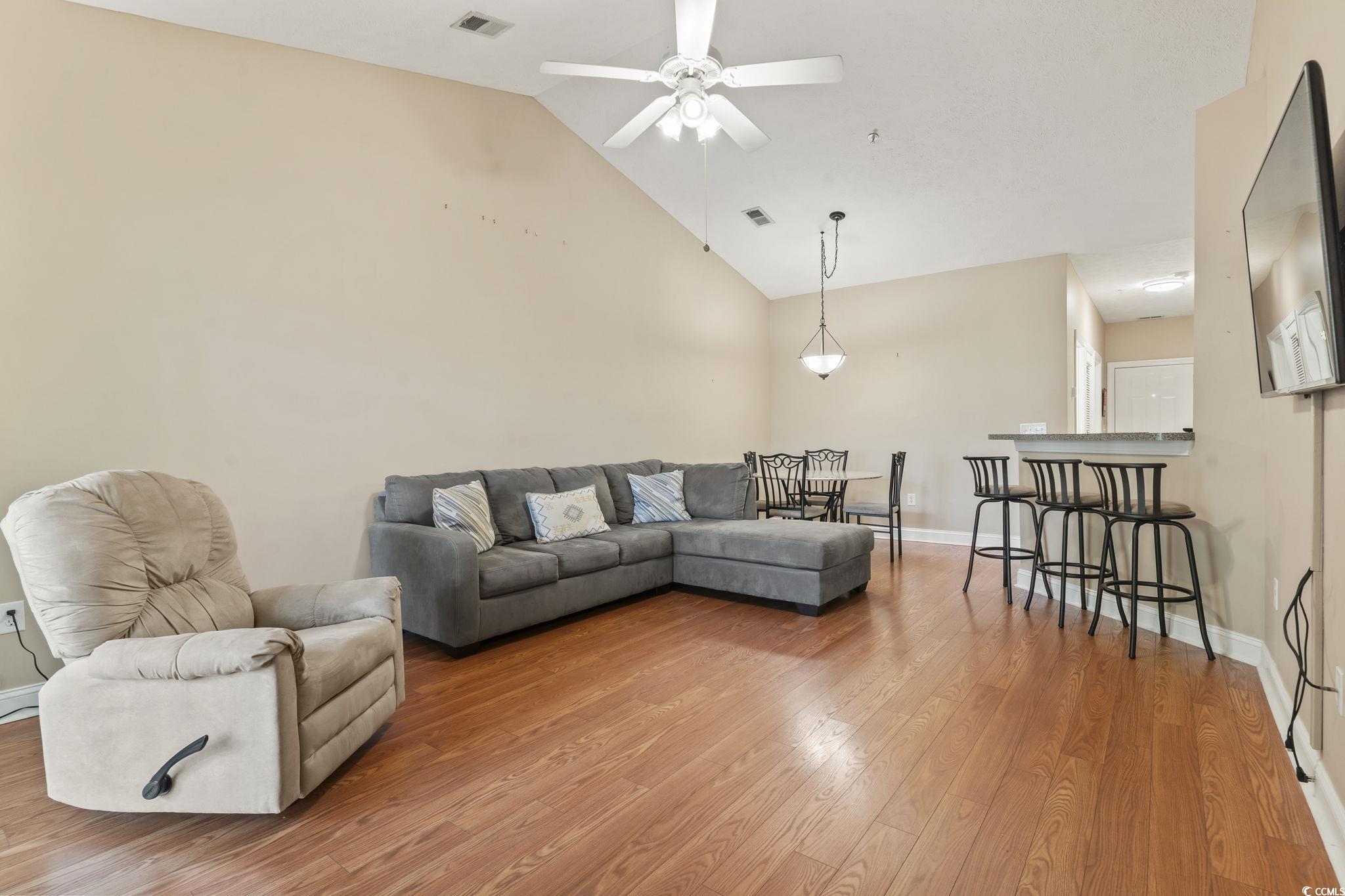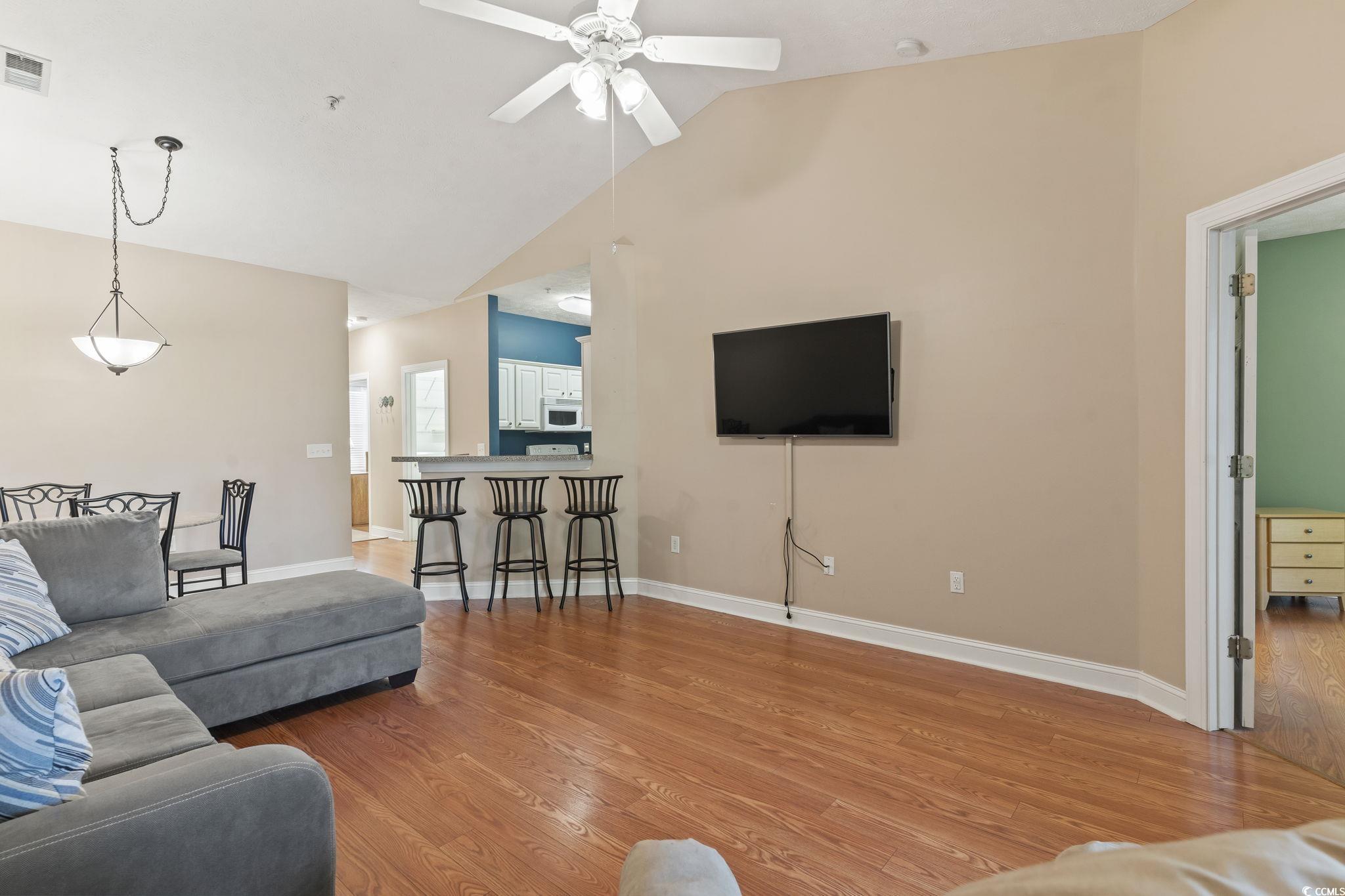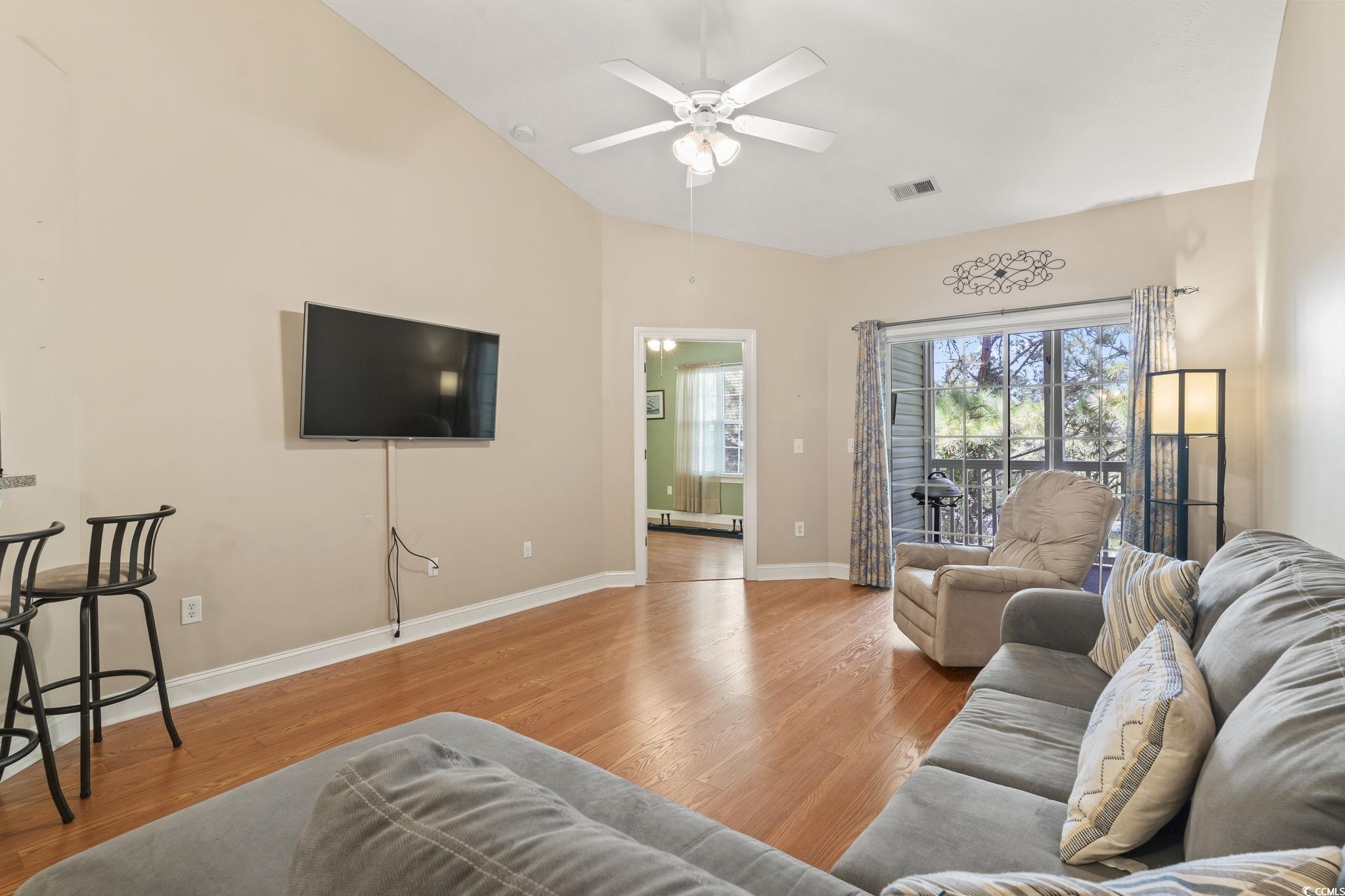 Welcome to this spacious Top-floor 3-bedroom, 2-bath condo, perfectly designed for entertaining with its open floor plan and vaulted ceilings. Natural light pours in through the sliding glass doors, which lead to a screened balcony—ideal for relaxing with your favorite beverage. This move-in-ready unit comes fully furnished and includes all appliances, including a stainless steel refrigerator that’s just three years old. The HVAC system is only two years old, and the hot water heater is three, offering peace of mind and efficiency. Each bedroom features ceiling fans for added comfort, and an exterior storage closet provides a convenient spot for beach gear, fishing equipment, and more. Located just 10 minutes from the airport, Coastal Grand Mall, and a wide array of restaurants—and only 17 minutes to the beach—this condo is a fantastic choice for a primary residence, investment property, or weekend getaway.