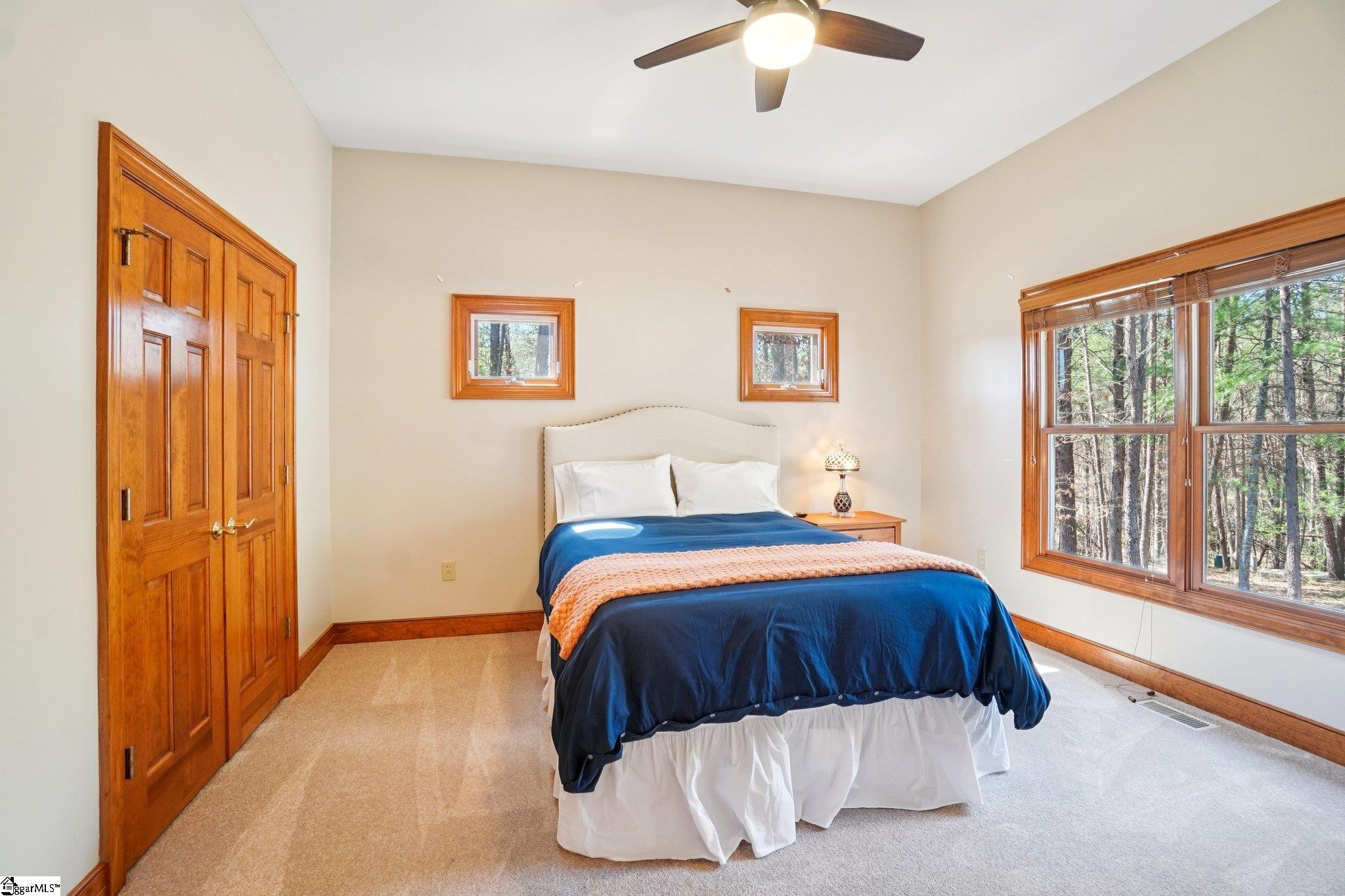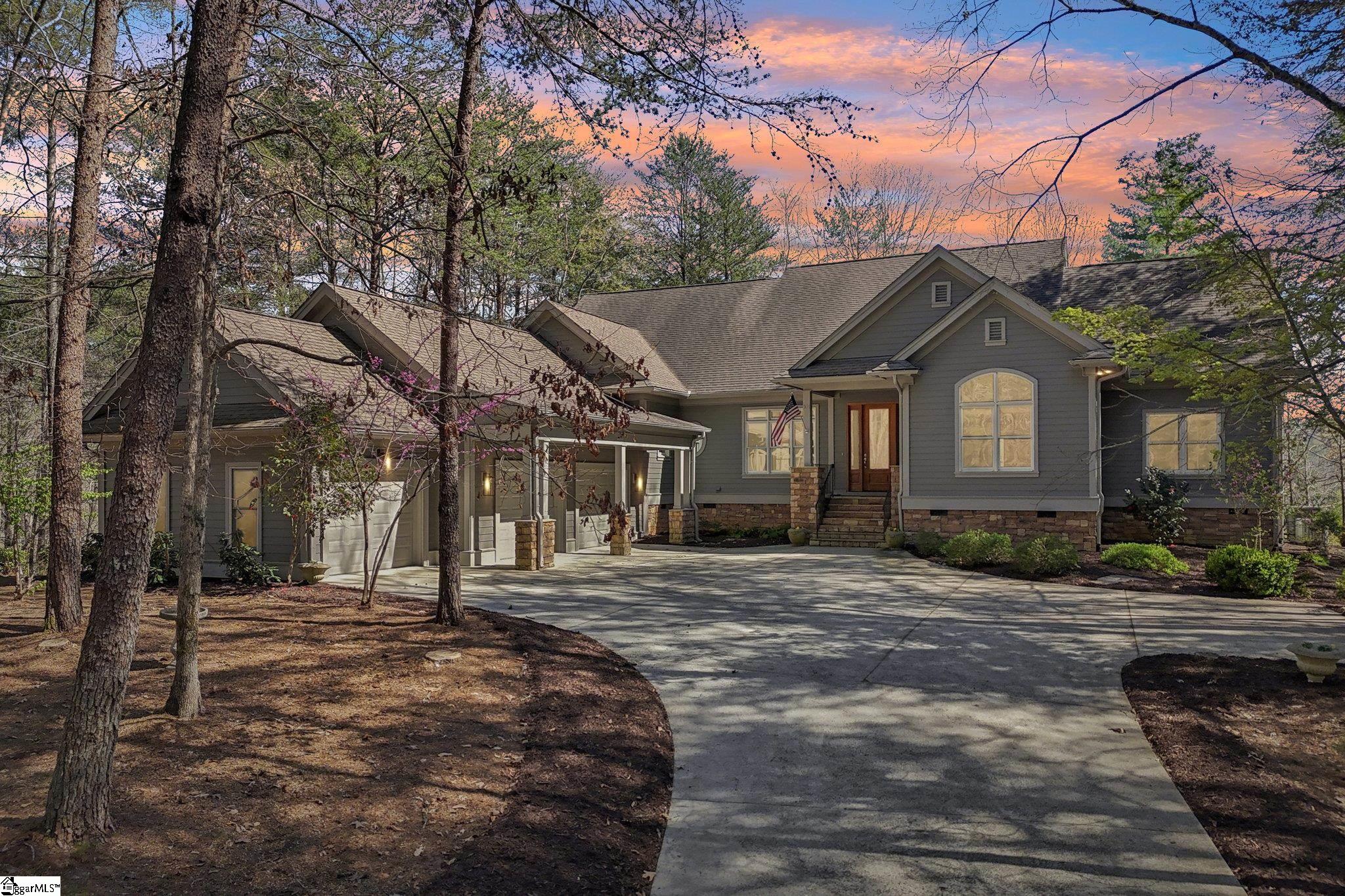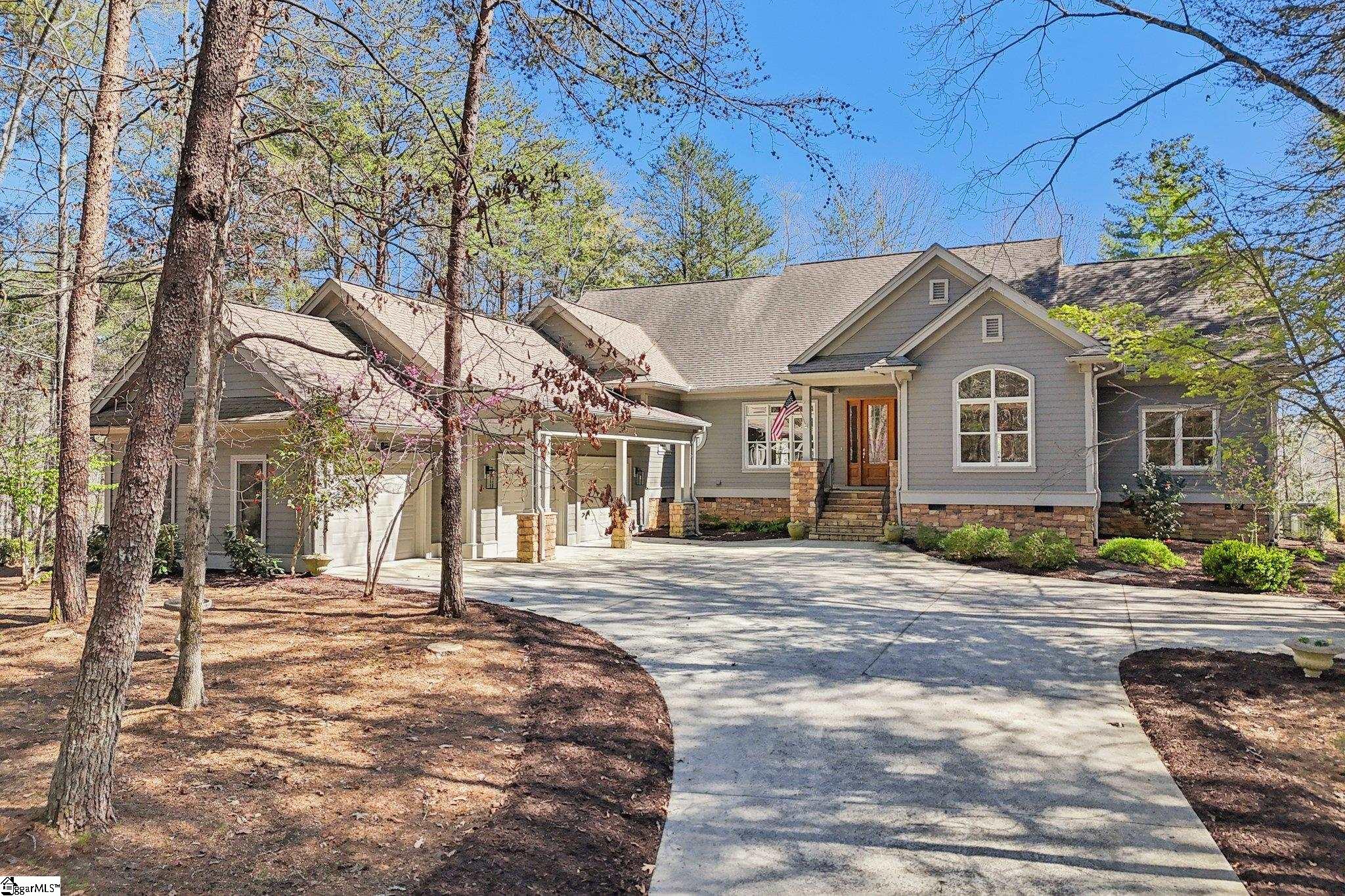 Nestled among the trees on a corner lot, this charming Vineyards residence offers picturesque views of a sprawling meadow and distant, seasonal lake vistas. The home is ideally suited as a primary residence, a weekend getaway, or a temporary retreat during construction. Designed entirely on one level and spanning over 3,400 square feet, the layout provides effortless accessibility and comfort. The open floor plan creates an inviting atmosphere, while each of the four bedroom suites enjoys its own sense of privacy. Notably, one suite is currently utilized as a dedicated office, adding flexibility to the home’s design. Upon entering, the office or bedroom is immediately to the right, offering tranquil views into the private courtyard. To the left, an informal dining area seamlessly transitions into a spacious great room. This central gathering space features a striking floor-to-ceiling stone fireplace and an abundance of windows that bathe the room in natural morning light. The adjacent kitchen is equipped with a walk-in pantry and a cozy breakfast nook, both of which anchor the left side of the open living area. French doors open onto a large deck, making this space perfect for entertaining guests. Overhead, a cathedral wood ceiling with beam accents adds warmth and character, complemented by rich heart pine flooring below. The master suite is discreetly located on the far-left side of the home, ensuring privacy and tranquility. The suite includes a welcoming bath, generous walk-in double closets, and a private deck for peaceful relaxation. Close by, an oversized laundry room with extensive cabinetry and a sink provides ample storage and utility. This area leads conveniently to the mudroom entry and the bonus of a three-car garage. At the opposite end of the house, two additional bedroom ensuites each feature walk-in closets, offering comfort and privacy for family or guests. The property enjoys an advantageous location near the lake house restaurant, community docks (available for lease), and the main entrance gate. This provides easy access to nearby towns and other Cliffs clubs, enhancing both convenience and community engagement. Certain items, such as a grill in the garage and select furnishings, are negotiable. This home presents exceptional value with entry-level pricing for the community and a wealth of desirable features.