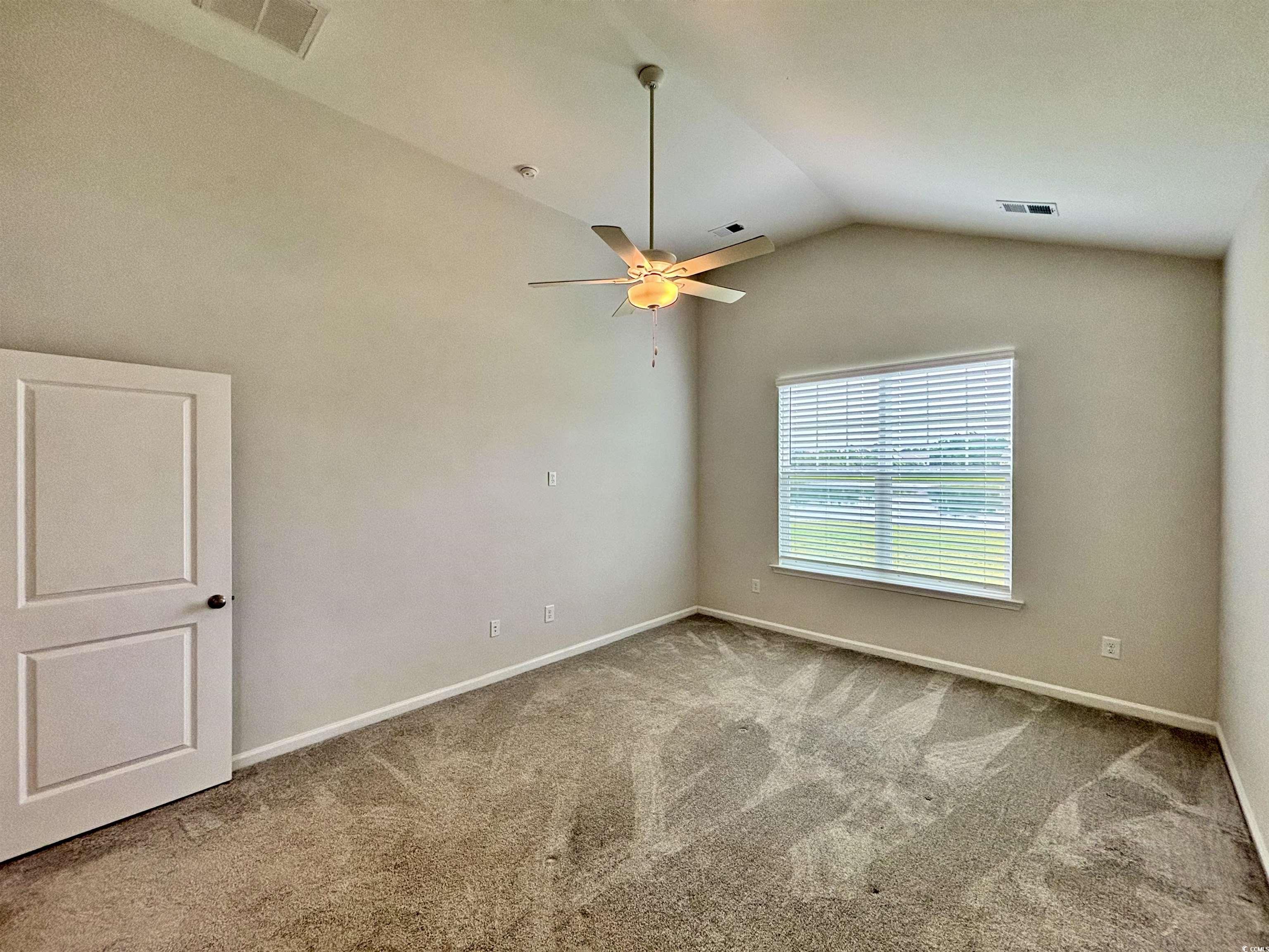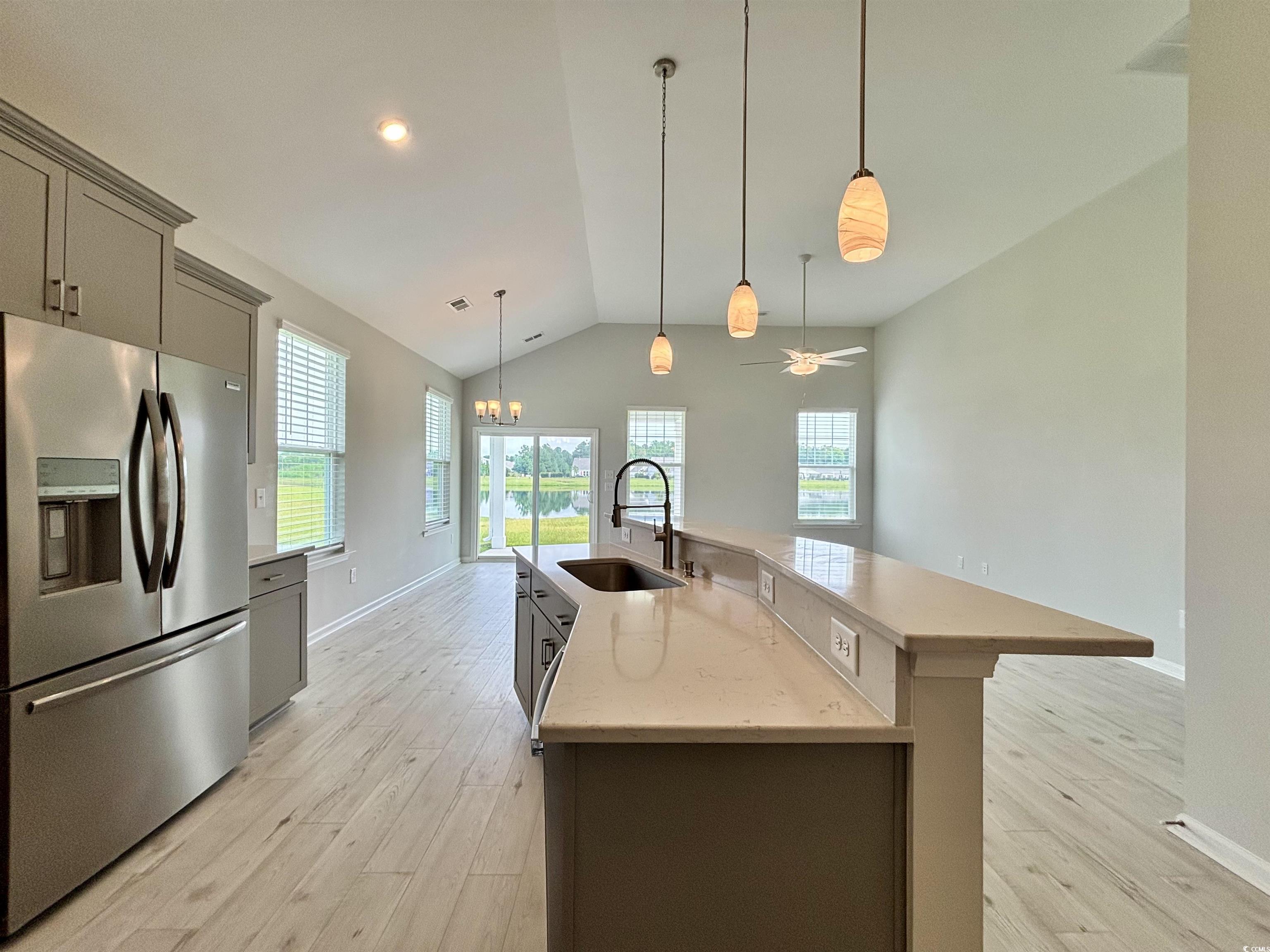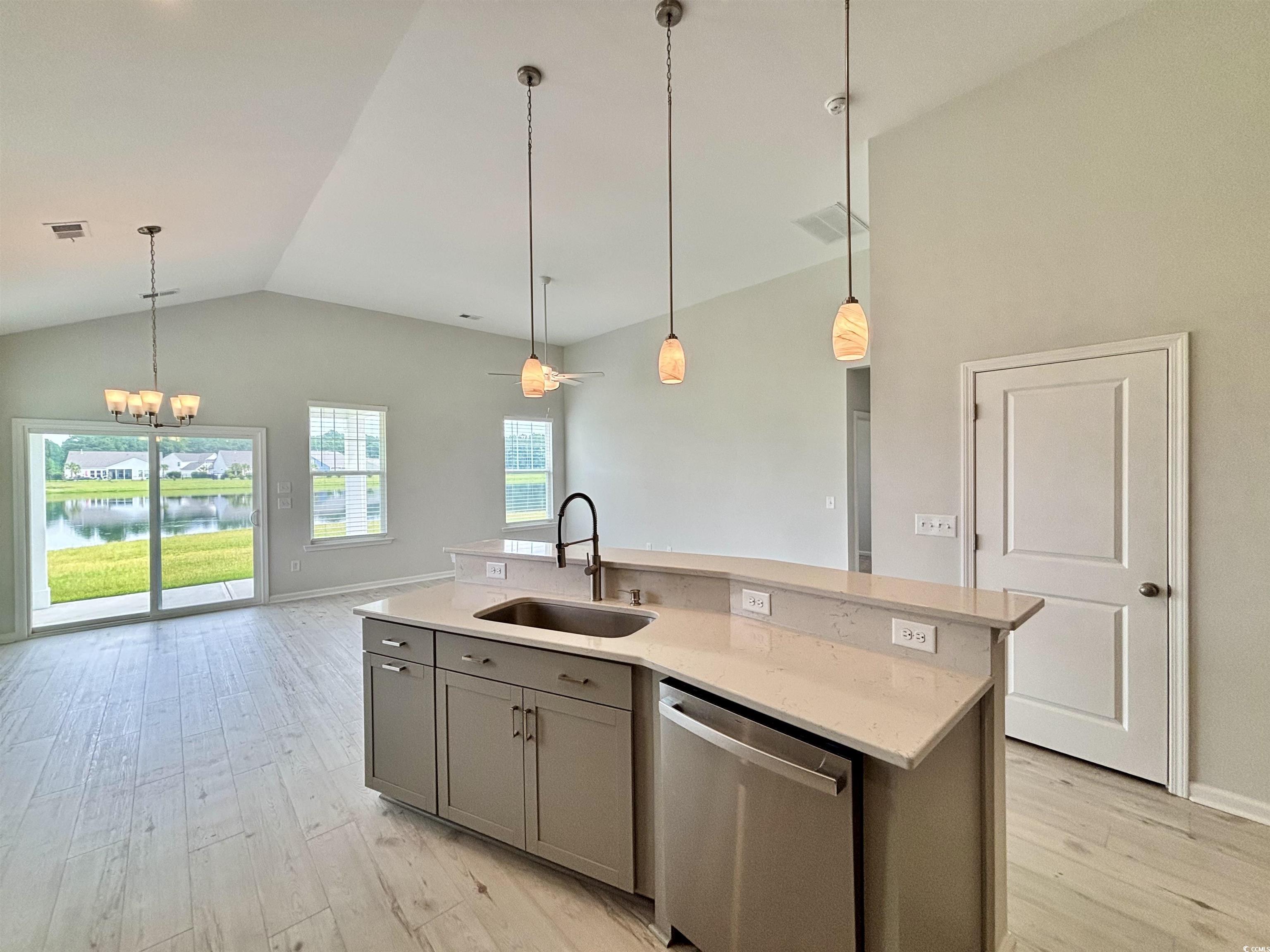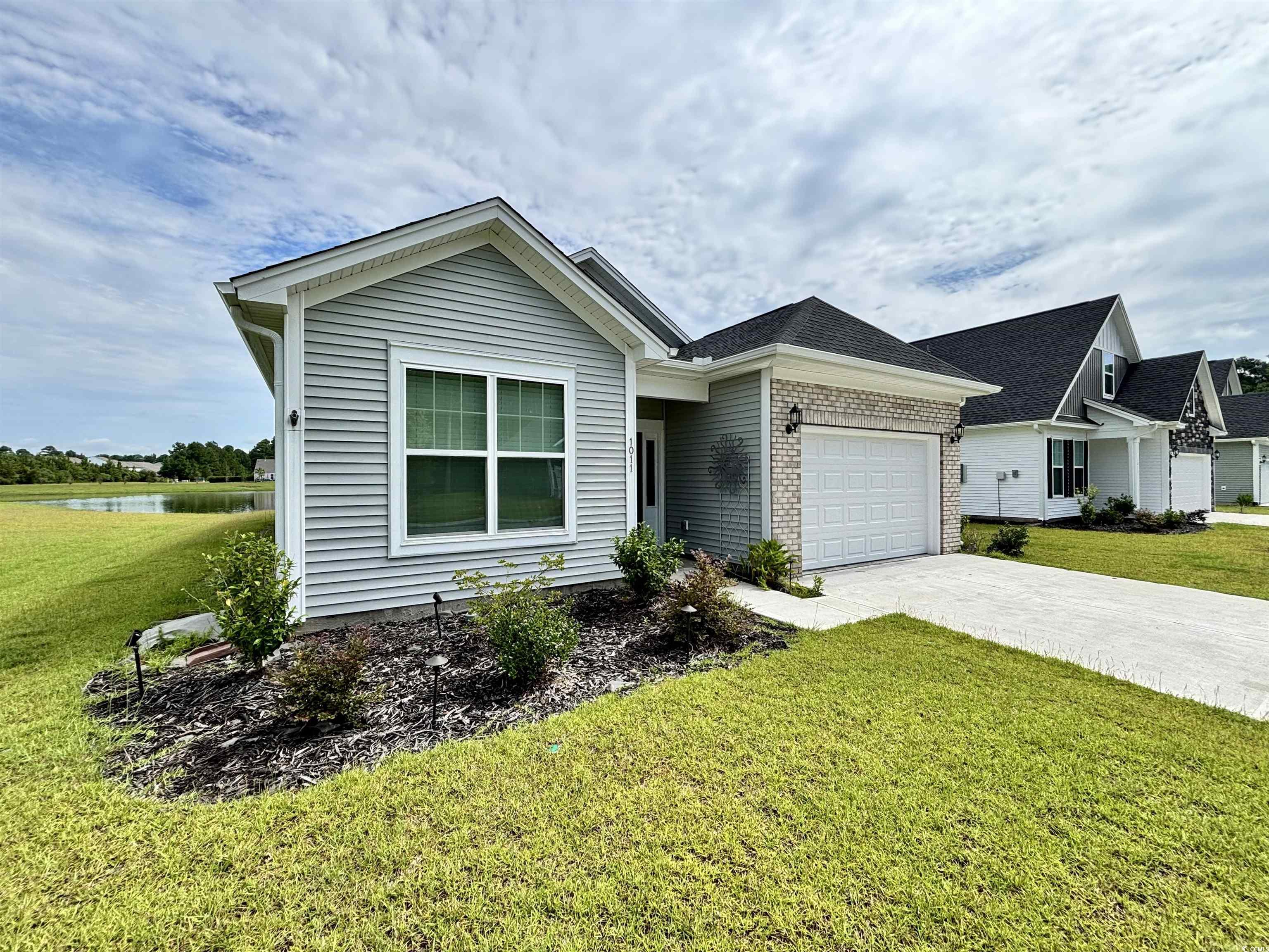 Beautiful Callaway Model in Merrill Villas – Water View Lot! Welcome to this stunning ranch-style home, perfectly situated on a private water lot in the desirable Merrill Villas community. This thoughtfully designed one-story, split-bedroom floor plan offers 3 bedrooms and 2 full bathrooms, combining comfort and style in a highly functional layout. At the front of the home, you’ll find two equally sized guest bedrooms that share a full bathroom conveniently located off the main hallway. The open-concept kitchen boasts upgraded gray cabinetry, a sleek gray tile backsplash, quartz countertops, and an upgraded gas range—ideal for any home chef. A large center island seamlessly connects the kitchen to the spacious great room and eat-in dining area, all enhanced by soaring 12-foot vaulted ceilings that fill the space with natural light and airiness. Step outside through the gathering area to a covered rear porch with an additional 12’ x 8’ uncovered patio extension—perfect for entertaining or simply enjoying the tranquil water views. The private primary suite is located just off the great room and features a generous walk-in closet, double-sink vanity with quartz counters, and a luxurious 5-foot tiled shower with a glass enclosure. Additional highlights include a laundry room just off the primary bedroom and a 1.5-car garage with a finished epoxy floor. Throughout the main living areas, you’ll enjoy low-maintenance luxury vinyl plank flooring, while the bedrooms are carpeted for comfort and the bathrooms are finished with stylish tile. Merrill Villas is ideally located in the heart of Carolina Forest, placing you minutes from shopping, dining, top-rated golf courses, the Myrtle Beach International Airport, and best of all—just under five miles to the beach!