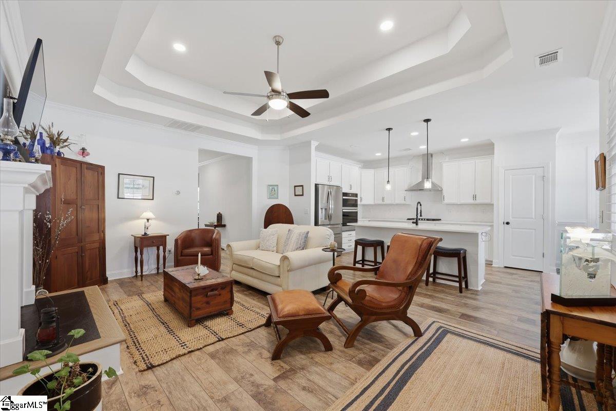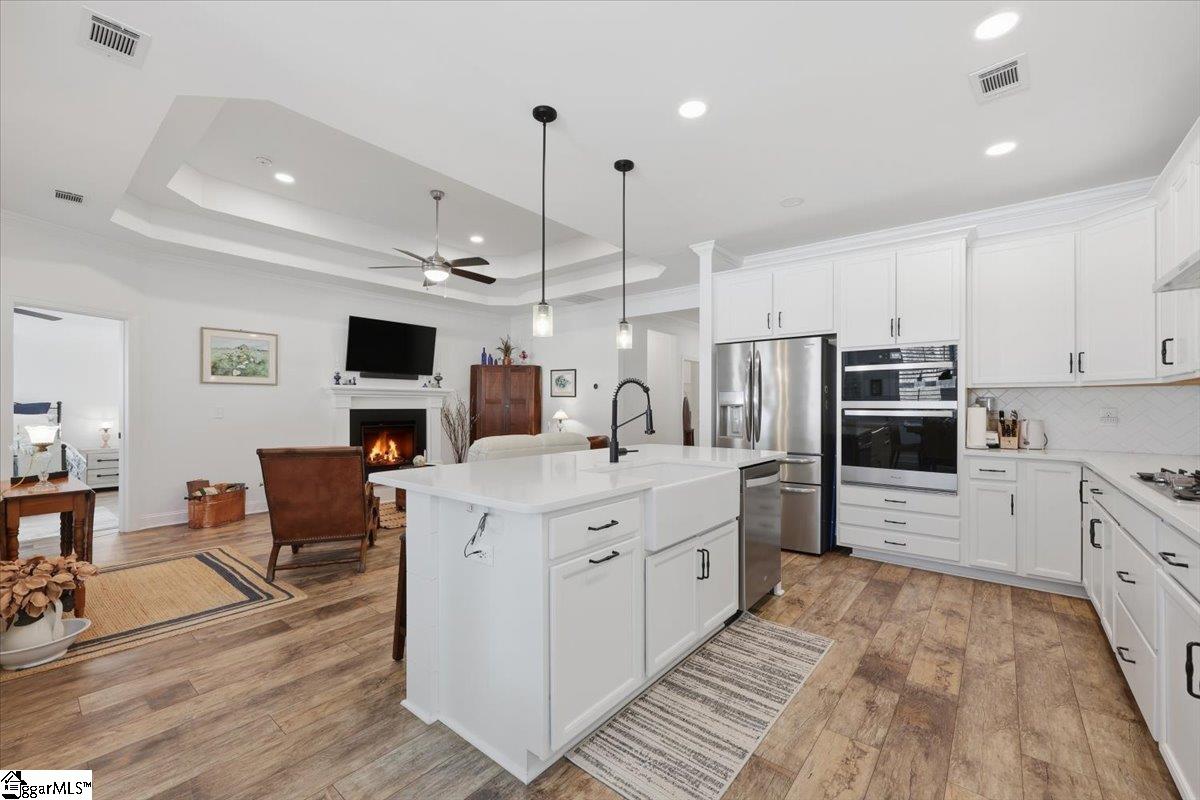 Welcome home to this beautifully designed 4-bedroom, 2-bath residence located in the heart of Duncan, just off Highway 101 and I-85, offering effortless access to Greenville and Spartanburg. Perfectly positioned in a vibrant community with District 5 schools, this home blends comfort, style, and convenience. Step inside to an inviting open yet split floor plan that perfectly balances connectivity and privacy. The primary suite is thoughtfully located on the main floor, creating a private retreat. Abundant natural light fills the home, highlighting custom details such as tray ceilings, luxury vinyl plank flooring throughout, and a cozy gas log fireplace that anchors the living space. The kitchen is both timeless and functional, featuring quartz countertops, a porcelain farmhouse sink, classic subway tile backsplash, a gas cooktop, wall oven, and built-in microwave—perfect for everyday living and entertaining alike. The primary suite offers a spa-inspired bathroom complete with double vanities, a garden tub, beautifully tiled walk-in shower with custom niches, ceramic tile flooring, and a spacious walk-in closet with built-in shelving. Unwind year-round in the enclosed porch with Easy Breeze-style windows or enjoy the thoughtfully designed outdoor spaces. The fenced backyard showcases extensive landscaping, stone pavers, two paver patios, and a stunning flagstone pathway that leads from the front of the home all the way to the back corner patio—creating multiple areas for relaxing and entertaining. Additional features include custom, top-down, bottom-up shades throughout the home and plantation shutters in the living areas of the home. Residents enjoy neighborhood amenities including a scenic pond, walking trails, and a playground—enhancing the community lifestyle. Centrally located in Duncan with quick interstate access, this home offers the perfect combination of thoughtful design, upscale finishes, and unbeatable convenience.