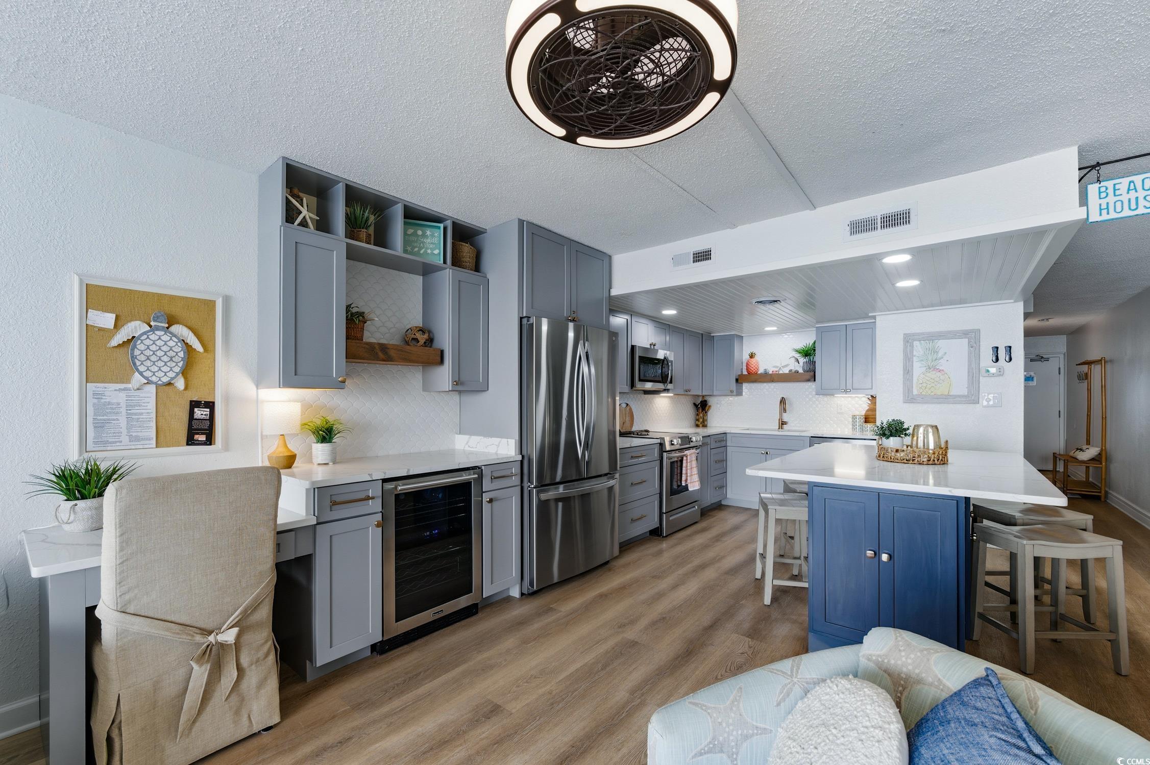 Elegantly coastal, perfectly appointed, and thoughtfully curated—407 Waters Edge Resort is a completely updated and spotlessly clean one-bedroom, two-full-bath direct oceanfront condo. Every space is intentionally functional while still open and inviting, and the renovation quality is immediately noticeable from the moment you walk down the hall and see the unobstructed ocean view through the full-wall glass slider. The kitchen with a large island features shaker cabinetry, quartz countertops, a fish-scale tile backsplash, stainless steel appliances—including a beverage fridge—brass hardware, under-cabinet lighting, and a built-in desk. Updated flooring extends throughout, creating a clean, cohesive coastal feel. The living area offers comfortable seating, dining space, and a tasteful Murphy bed that blends seamlessly with the décor—an excellent option for guests. Both full baths have been refreshed with modern vanities, fixtures, and finishes, and the in-unit washer and vented dryer add everyday convenience. The condo is being sold fully furnished, making it an easy turn-key option. It also has a proven track record of strong short-term rental income, with rental history available upon request. This unit is located just two floors above the top level of the parking garage, offering quick and easy access without relying on the elevator. Waters Edge Resort provides a strong amenity package, including indoor and outdoor pools, hot tubs, a fitness center, an oceanfront sundeck, the Rising Tides Lounge, a convenience store, covered parking, and security—all within a solid concrete and steel building. The location puts you within walking distance of Garden City Pier for fishing, arcade games, live music, karaoke, food, drinks, and classic beachside energy. You're minutes from Murrells Inlet—the “Seafood Capital of South Carolina”—and a short drive to Huntington Beach State Park, Brookgreen Gardens, the Myrtle Beach Boardwalk, and Myrtle Beach International Airport. Charleston and Wilmington are both within a comfortable two-hour drive. Be sure to view the walking tour and explore the immersive Matterport 3D Virtual Tour to experience the property as if you're already here: www.bit.ly/407WER