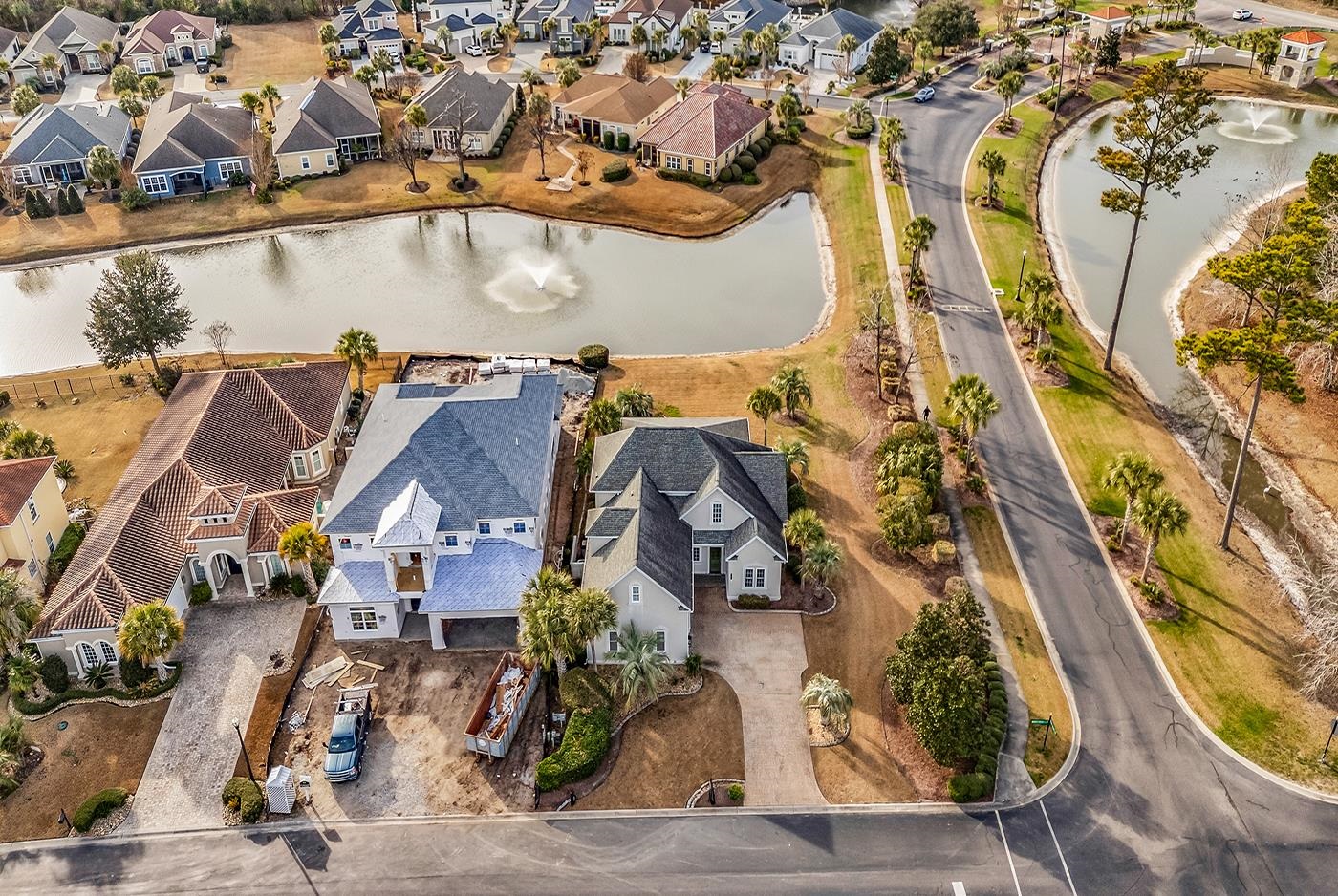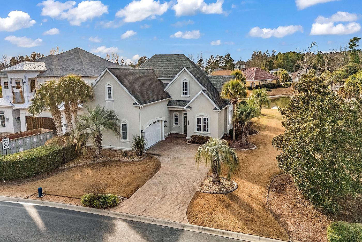 Custom built Mediterranean style home located in the gated community of The Bluffs on the Waterway, situated on a corner lot with serene pond and fountain views. This well designed home features hardwood floors, high ceilings, crown molding, and a flexible office or optional fourth bedroom on the main level. The open floor plan includes a bar, propane fireplace, abundant natural light, and a spacious kitchen with stainless steel appliances, granite countertops, pantry, and island. The first floor owner’s suite offers beautiful water views, private outdoor access, and a luxurious bath with dual vanities, jetted tub, tile shower, and walk-in closet. Upstairs features a sitting area, large bonus room, and guest suite with walk-in closet and bath. Recent updates include a Trane HVAC system and Rheem water heater. Fresh paint, professional cleaning, and refreshed landscaping make this home move in ready. Enjoy the inviting veranda, oversized garage, and irrigation system. Community amenities include clubhouses, boat ramp and dock, resort-style pool, tennis and pickleball courts, and close proximity to beaches, golf, dining, and shopping. Located in the Carolina Forest school district. Square footage approximate; buyer to verify.