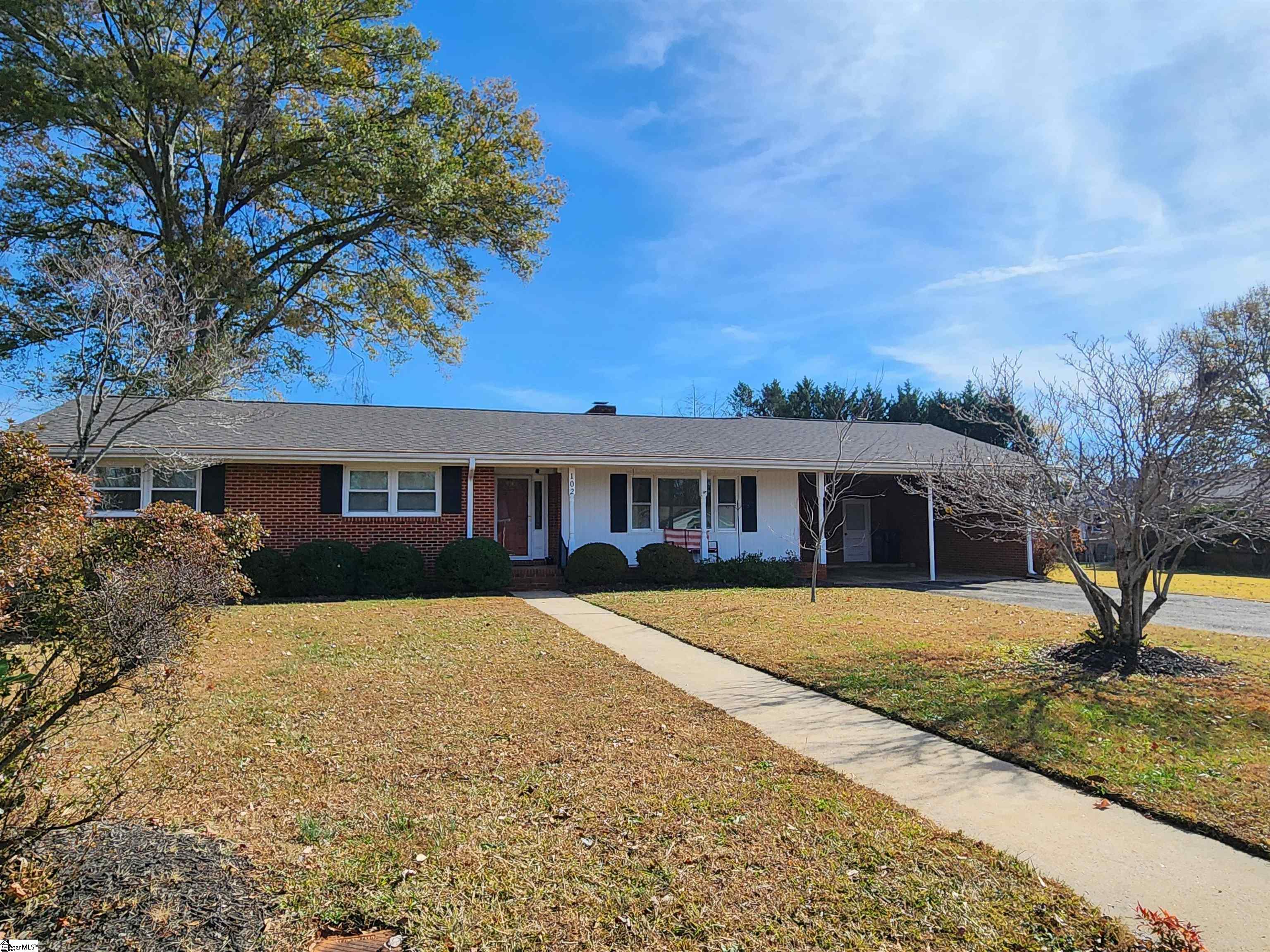 The highly sought after ranch style home is now available in an established Easley neighborhood. Even though this 3 bedroom, 2 full bathroom home is completely updated, it still retains several aspects of it's 1960's charm like the crown molding, large entryway, breakfast room built-in, 2 car carport and natural brick exterior. Super convenient location to Highways 8 and 123. Large, quiet fenced in lot. This home features an open concept kitchen and living area, stainless steel appliances, granite counter tops, new high efficiency windows, new flooring, bar/breakfast area as well as an extra living space with fireplace. The primary ensuite has just been renovated with new shower, vanity and flooring. The HVAC was replaced in 2019 and the roof in 2023. Large laundry room. Additional storage room in the carport area. The property has been well-maintained. Recent inspection report with repairs available.