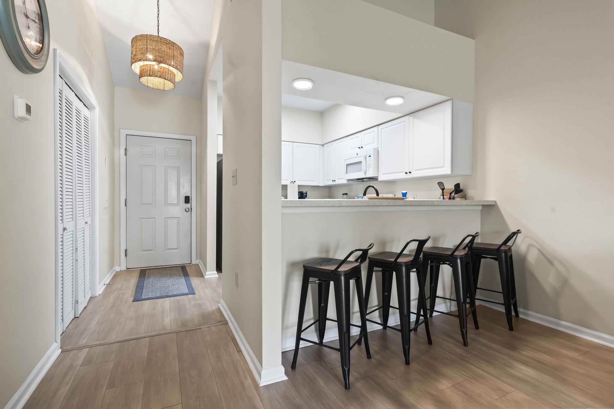 Turnkey Top-Floor Condo — Fully Furnished 2BR with Screened Balcony at Village at the Glens Move right in and start enjoying the coastal lifestyle. This fully furnished 2-bedroom, 2-bath top-floor condo offers low-maintenance living in a peaceful golf-side setting—perfect as a primary residence, vacation retreat, or income-ready investment. Inside, vaulted ceilings and abundant natural light create a bright, open atmosphere from the moment you enter. Wide-plank Light Grey Oak LVP flooring gives the main living area a clean, modern feel that complements the coastal furnishings. The kitchen is designed for easy living, featuring full-size appliances, a stainless steel Frigidaire refrigerator, bold black hardware, and a breakfast bar that connects seamlessly to the dining and living spaces. Sliding glass doors lead to a private screened balcony overlooking green space, an ideal spot for morning coffee, afternoon relaxation, or unwinding in the evening after a day at the beach or on the course. The primary suite offers a comfortable retreat with a queen bed, dual closets, ceiling fan, and a private en-suite bath. A second bedroom and full guest bath provide flexibility for guests or rental use. Recent updates include a 2019 HVAC system, in-unit washer and dryer, and a brand-new roof in 2025, adding long-term value and peace of mind. Village at the Glens features a sparkling pool, shaded seating areas, and convenient parking within a quiet, well-maintained community. You’re just a short drive from Cherry Grove Beach, with easy access to Hwy 31, shopping, dining, and all the attractions of North Myrtle Beach. If you’ve been searching for a move-in-ready condo near the coast, this top-floor unit deserves a closer look. Schedule your private showing today.