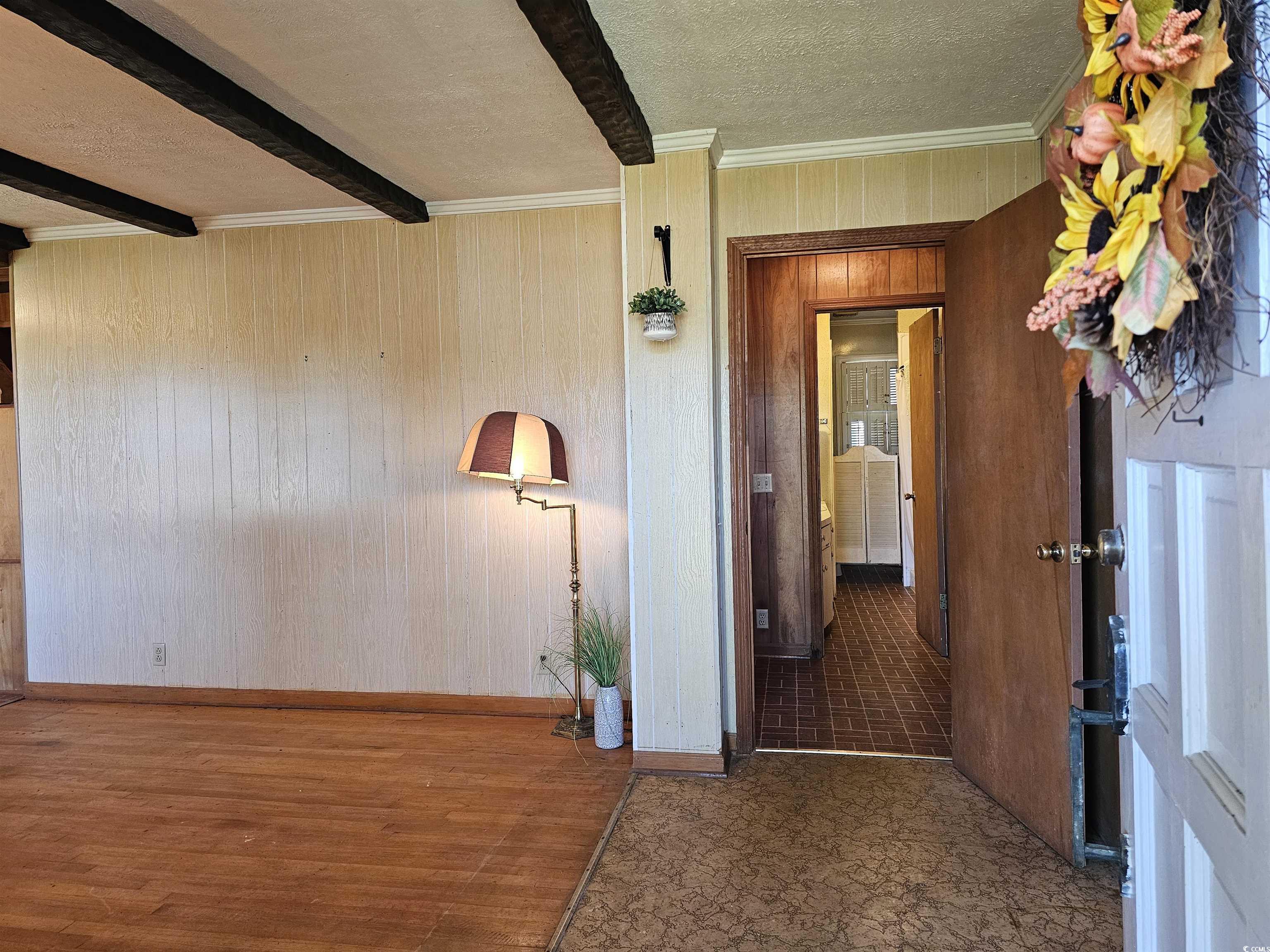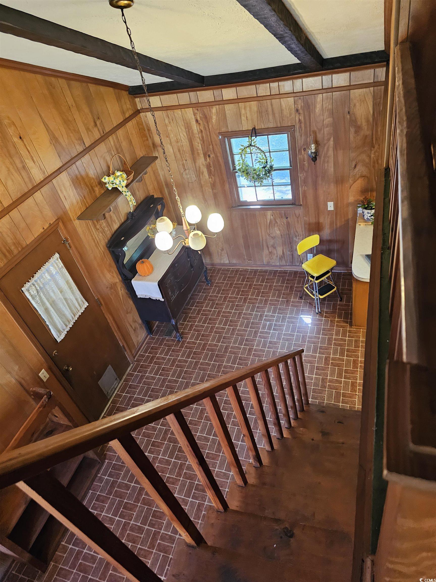 Welcome to this charming 1 1/2 story brick country home located on .87 acres of peaceful, serene land outside city limits. This cozy home features 2 bedrooms with a possible 3rd bedroom or bonus room upstairs, complete with a huge walk-in closet. The main level boasts cathedral ceilings in the living room and dining area, and faux wood beams throughout the den, living room, dining room, and kitchen. Enjoy the natural light that shines through the stunning stainglass window in the mornings, as well as the bay window, brick fireplace, and custom built-in bookcases and desks. The kitchen offers plenty of cabinet space, while plantation shutter blinds and hardwood floors add to the home's charm. Outside, you'll find a detached cinderblock building with electricity, as well as a detached metal building with electricity, a 220 outlet, and a garage bay door on a concrete pad with a porch. This property is perfect for those looking for a quiet retreat with no HOA, yet still just a quick drive to Myrtle Beach or Florence. Don't miss out on this unique opportunity to own a piece of country paradise! **SELLER IS OFFERING AN ADDITIONAL CREDIT TOWARDS BUYERS CLOSING COSTS!**