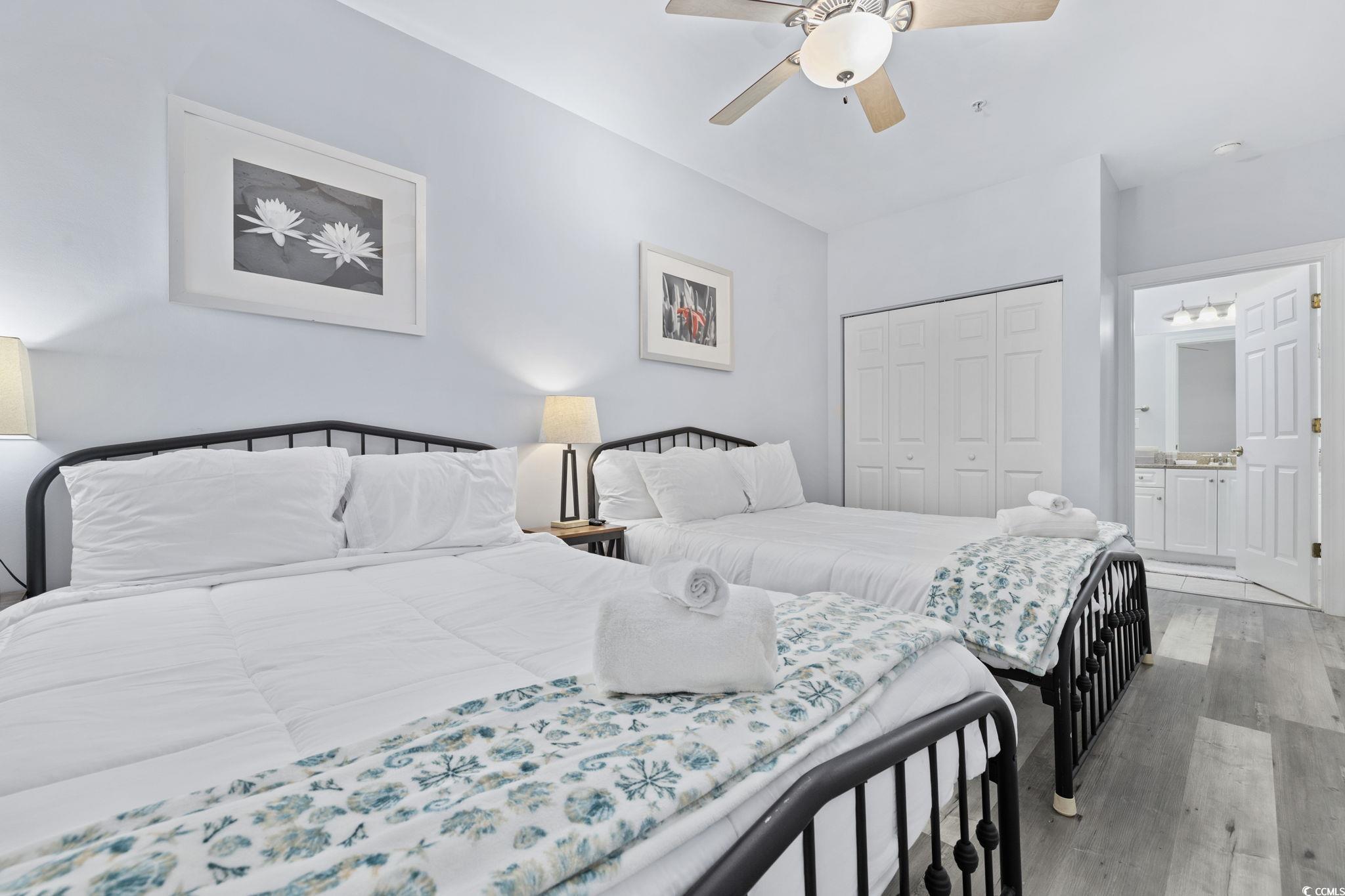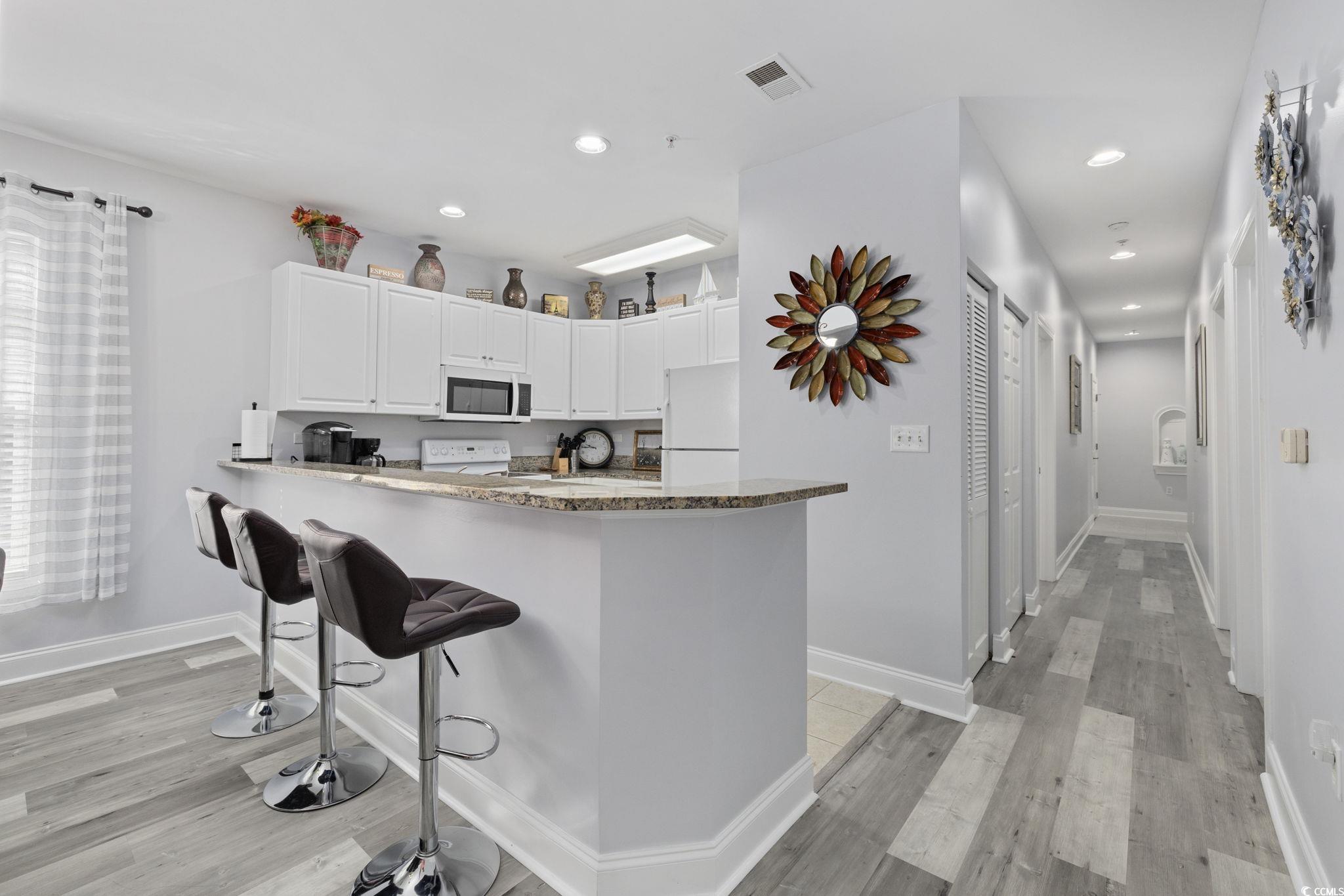 Prestigious Living at World Tour!!! - Spacious First-Floor Corner Condo. Totally furnished and turnkey! World Tour is a very popular and sought-after Myrtle Beach golf course designed by Mel Graham. This home has a serene view sitting right across from the course. This nicely furnished and spacious 3-bedroom, 2-bathroom condo is beautifully furnished and balanced floorplan with easy access on the first floor. (no stairs or waiting for an elevator) A well-defined foyer entry as you step inside leading into an open and airy living space. Owner has just installed brand-new LVP flooring in the main areas including the bedrooms. The kitchen features granite countertops, white cabinets and a breakfast bar with bar stools. The Master suite has a beautiful king bed complete and private access to the back porch-the perfect place to unwind. The Master bathroom has double vanities and a tub/shower combo, providing both convenience and luxury. The two Guest bedrooms are generously sized, ensuring plenty of space for visitors or family. A washer and dryer is also included. Additional updates include a new hot water heater (2024), new garbage disposal, and freshly painted throughout. New furnishings purchased in living room and Master Bedroom were all in the last 6 months. (LR sofa has a pull out bed) Residents have access to a large community pool, a fitness center, and an elegant clubhouse. Golf enthusiasts will love being just steps away from the World Tour Golf Club (Public course but offers memberships for preferred tee times.) residents can easily walk over and enjoy breakfast or lunch in the “above par” old-style pub known as the Player’s Grille or dine on the large veranda overlooking the water-guarded green of Championship #9. World tour is located just 15 minutes to the beach and airport. Shopping, fine dining, Broadway at the Beach and Myrtle Beach big shows are all within a short drive. Property can be rented short term if desired and would make an excellent airbnb. Owner allowed a pet. Come take a tour as this fabulouse golf villa!