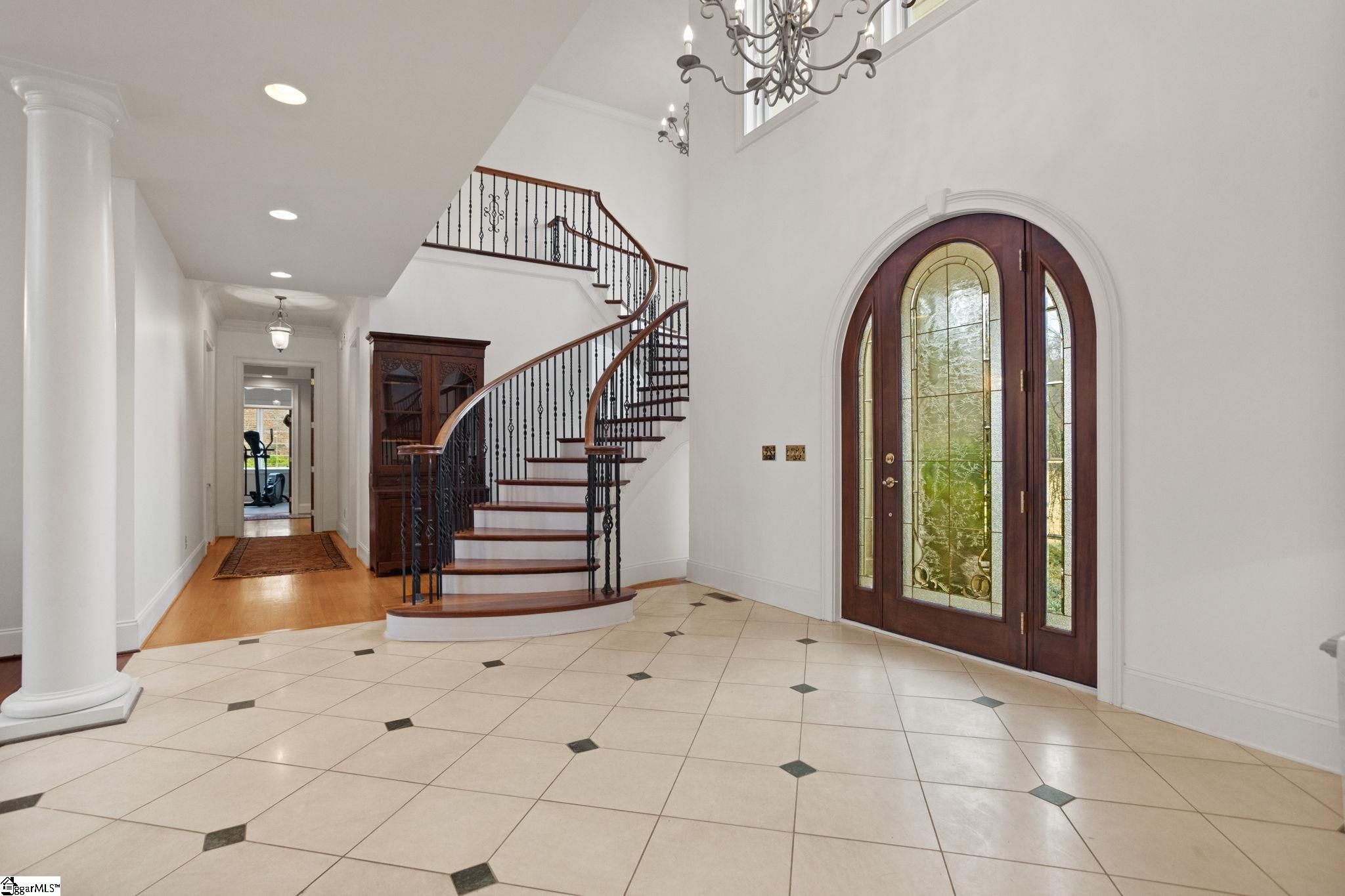 Exceptional equestrian estate on 27.19 acres located on Spartanburg’s desirable Westside. A tree-lined circular drive leads to an elegant European-style residence, beautifully positioned between expansive pastureland. The property is thoughtfully designed for both refined living and equestrian use, featuring a multi-stall barn complete with feed and tack rooms, bathroom, hayloft, and additional storage. Inside, a dramatic two-story foyer opens to a stunning sunken great room with soaring ceilings, fireplace, and floor-to-ceiling windows that flood the space with natural light. A breathtaking circular staircase anchors the entry and leads to the upper level. The formal dining room is ideal for large gatherings and flows seamlessly into the chef’s kitchen, which is appointed with custom cabinetry, granite countertops, a large center island, Thermador gas range, Sub-Zero refrigerator, Bosch dishwasher, and a walk-in pantry. A breakfast area overlooks the outdoor patio and pool. The keeping room offers raised ceilings, a cozy fireplace, and a full wet bar, creating an inviting space for entertaining. Additional living areas include a private home theater with bar, projector, and surround sound, as well as dedicated home office and hobby spaces. The main-level owner’s suite is a true retreat, featuring a fireplace, sitting area, workout room, two walk-in closets, and access to the covered rear porch. The spa-like primary bath includes a jetted tub, walk-in shower, double vanity, private water closet, and bidet. Two staircases lead to the second level, where four additional bedrooms each offer private bathrooms, private closets, and hardwood floors. The upper level also includes a home office area, ample storage, and an impressive oversized FROG room offering endless possibilities. This home showcases timeless craftsmanship with extensive moldings, 8-foot solid wood doors, Brazilian cherry hardwood floors, Pella windows, and custom cabinetry throughout. Storage is abundant, and comfort is enhanced by multiple HVAC zones, surround sound, two gas water heaters, and a private well used for irrigation. Outdoor amenities include a heated in-ground saltwater pool with expansive decking and a pool house with full bath and storage. A four-car garage with workshop is connected to the home by a breezeway and paver patio, creating additional space for entertaining. The barn is just a short walk from the home, with ample room for gardening, chickens, and covered equipment storage. This remarkable estate offers a rare combination of luxury, land, and limitless potential—an experience that must be seen to be fully appreciated.