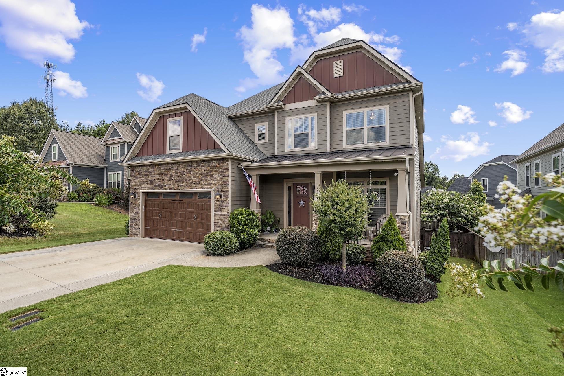 Luxury living meets everyday comfort. Welcome to 104 Bold Slope, a custom-built Craftsman home just minutes from Downtown Greenville. Located in the prestigious Enclave at River Reserve, this home combines beautiful design with functional spaces, featuring four bedrooms, two owner’s suites, a chef’s kitchen, open living areas, and a layout made for family, friends, and everyday life. From the inviting front porch to the light-filled foyer with 10-foot ceilings and wainscoting, every corner balances style and practicality, making this home perfect for gatherings, quiet retreats, and everything in between. This home features four spacious bedrooms, including two private owner’s suites—one on each level—ideal for multigenerational living, guests, or a quiet personal retreat. Each suite includes spa-inspired bathrooms with granite vanities, tiled showers, and generous walk-in closets, while the main-level suite offers a garden tub for true relaxation. At the heart of the home, a bright open concept living area centers around a stunning stone fireplace and soaring two-story ceilings that fill the space with natural light. The chef’s kitchen delivers both beauty and function, with granite countertops, soft-close cabinetry, a gas cooktop, wall oven, built-in microwave, and an oversized island perfect for entertaining. A dedicated home office, an upstairs flex room, and a laundry area with sink add convenience and practicality for everyday living. Step outside to your private outdoor retreat—complete with a screened deck with Trek flooring, a stone patio with fire pit, and lush landscaping with a privacy fence. It’s the perfect setting for quiet mornings, weekend get-togethers, or evenings under the stars. Tucked away on a quiet cul-de-sac, surrounded by scenic walking trails and zoned for the award-winning Powdersville schools, this home offers both connection and calm. With quick access to I-85, you’re just minutes from shopping, dining, and Greenville’s vibrant downtown—yet you’ll always return to your own sanctuary. 104 Bold Slope isn’t just a home—it’s a lifestyle built for those who value beauty, functionality, and meaningful moments with friends and family. Schedule your private tour today and experience it for yourself.
