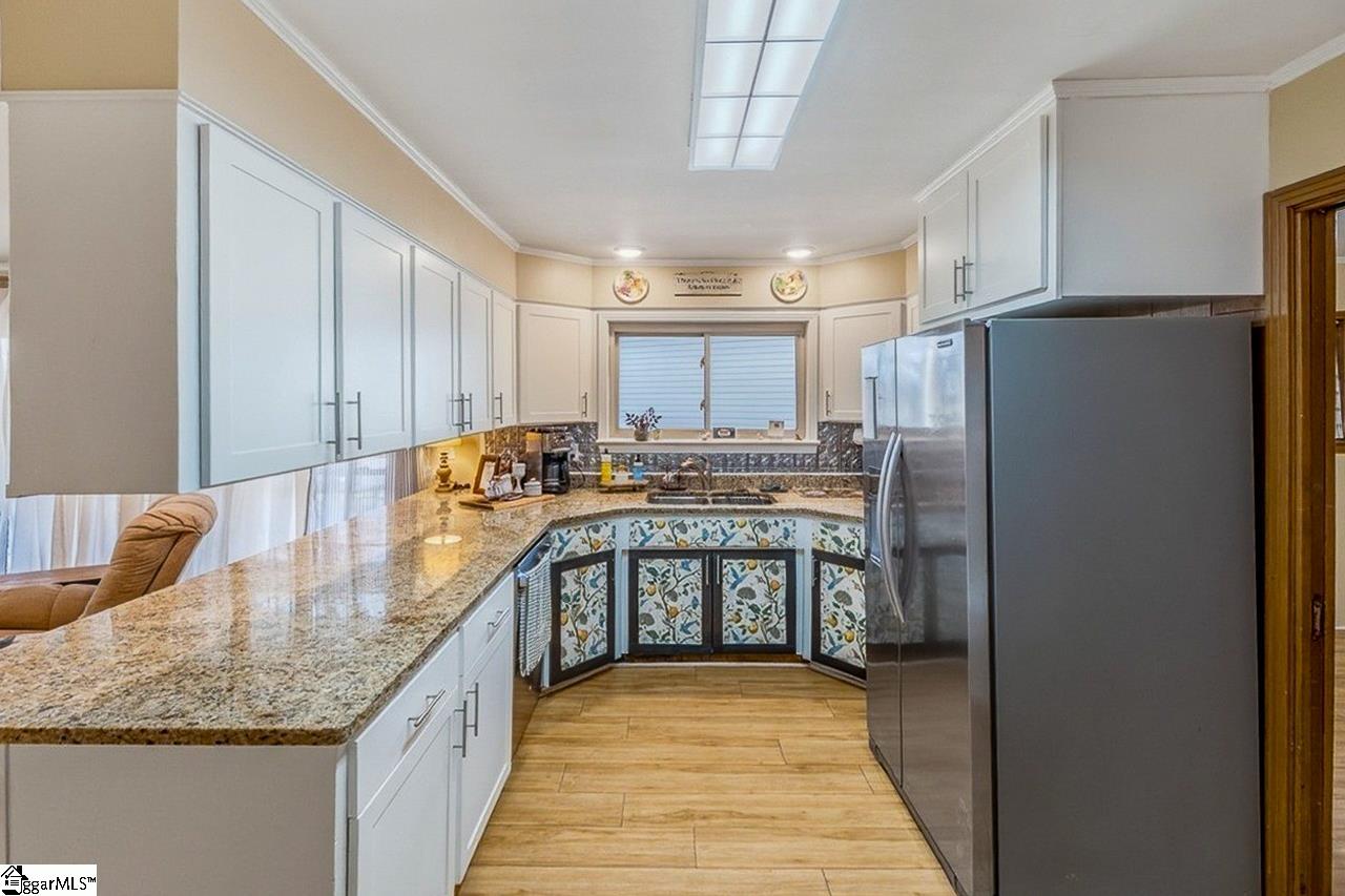 If you have been looking for a 2000+ square foot home with no HOA AND a detached garage workshop, this one is made for you! This brick ranch-style home offers over 2,000 square feet of single-level living space. The interior layout is designed with distinct yet connected spaces, beginning with a foyer that leads into a formal living room featuring a large bank of windows and hardwood flooring. A separate family room serves as a central gathering point, highlighted by a white brick fireplace with a wood mantel and direct sightlines into the kitchen. The kitchen features white cabinetry, granite countertops, and a suite of stainless steel appliances, including a built-in wall oven and microwave. A breakfast bar provides casual seating and separates the kitchen from the family room, while an adjacent dining room offers space for more formal meals. The primary suite includes a walk-in closet and a private en-suite bathroom. Two additional bedrooms and a second full bath are located down a central hallway, and a substantial laundry room provides ample utility space and exterior access. Outside, a half-acre fenced-in yard with a covered patio is situated in a quiet, no-HOA location. The property offers significant vehicle storage and workspace, including an attached two-car garage plus a large, 3-bay detached garage and shop. This secondary structure is wired for a full-sized car lift and includes an additional workshop, offering substantial capacity for an RV, boat, and multiple vehicles.