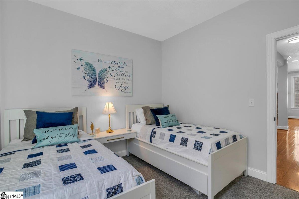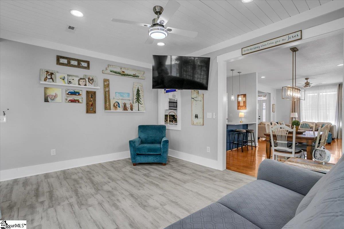 Welcome to 105 Runamo Way, located in the sought-after, low-maintenance Bluestone Cottages community. This beautifully maintained single-level home pairs classic curb appeal with stylish, high-quality updates throughout. A generous covered front porch sets the tone, leading into a bright, open foyer that immediately feels warm and inviting. Rich hardwood floors flow effortlessly through the open-concept great room, dining area, and kitchen, continuing down the hall into all three bedrooms for a seamless and cohesive design. The updated kitchen is both functional and eye-catching, featuring quartz countertops, an enlarged island, new sink and faucet, updated hardware, a crisp white backsplash, and a convenient pass-through window to the sunroom—perfect for entertaining. One of the home’s true highlights is the stunning sunroom addition, complete with thermal windows, durable LVP flooring, and a charming shiplap ceiling. Bathed in natural light, this space is ideal for morning coffee, relaxing evenings, or simply enjoying the view, and it offers direct access to the primary suite for added ease. The primary bedroom is a serene retreat, boasting a private ensuite with dual vanities, a garden tub, separate shower, and a walk-in closet with custom organizational shelving. Two additional bedrooms provide comfortable living space and share a well-appointed full bath. All bedrooms feature new carpet installed in 2023. Thoughtful upgrades continue throughout the home, including added cabinetry in the laundry room, epoxy-coated garage flooring, and a utility sink. Additional features include a gas log, stone-accented fireplace, smooth ceilings, fresh neutral paint, an architectural shingle roof, low-maintenance siding, a back patio, and an inviting covered front porch. With HOA-provided lawn maintenance, this home offers true lock-and-leave living. Perfectly situated just minutes from downtown Greer and Greenville, GSP Airport, shopping, and dining, this exceptional home delivers comfort, convenience, and effortless style in an unbeatable location.