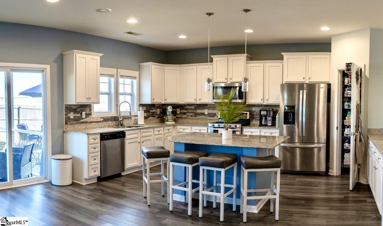 Welcome to Wilson Farms, conveniently located between Greenville & Spartanburg! This lovely 4 Bd, 2.5 Ba home is truly better than new with a fenced backyard, custom landscaping, a screened porch & fresh paint! Enjoy the upgraded flooring on the main level offering a seamless, easy to clean luxury throughout all of the living spaces. The beautiful Living Room & Dining Room greet you as you enter and invite you down the hall to the main open living area as well as access to the 2 Car Garage and 1/2 Bath making this a great space for hosting friends & family. The beautiful Kitchen is equipped with an island for extra seating & work space, a corner pantry closet & an extra counter space next to the dining room, great for serving meals & beverages. This opens to the Den & Screened Porch for an easy flow between living areas. The Den offers year round comfort with a ceiling fan for the warmer months and gas logs to keep you cozy during the cooler months. From the Screened Porch you will enjoy the custom landscaped backyard with privacy fence. For extra privacy of your personal space, all of the bedrooms are located upstairs. Also upstairs is a great Flex Room offering the great option to use as you wish for a home office, play room, movie room or home gym. The Primary Suite includes dual walk-in closets & 2 separate vanities so owners can each have their own dressing space. There are 3 additional Bedrooms, a Flex Room and a Laundry Room on the 2nd level to save you from carrying laundry baskets up & down the stairs. This wonderful home is well cared for, move-in ready and super convenient to schools, shops & restaurants in the Upstate!