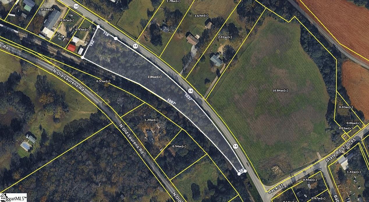 2.86 acres with extensive road frontage along Highway 14 and N Old Laurens Road in unincorporated Laurens County. This corner tract offers excellent visibility, flexible access points, and a highly convenient location just minutes from major highways. Approximate drive times: • 5 minutes to I-385 • 15 minutes to Simpsonville • 20 minutes to Fountain Inn • 25–30 minutes to Greenville • Quick access to I-85 via I-385 The property includes an existing concrete pad, on-site septic system (condition to be verified), and public water and electricity available at the road. Mature trees provide natural buffering while still allowing multiple site layout options. The lot is wide with substantial frontage, offering flexibility for driveway placement and future plans. Surrounded by residential and rural properties, this tract presents potential for residential construction or other permitted uses. Buyer to confirm zoning and permitted uses with Laurens County Assessor's Department. We have called, and they said it should not be an issue, but please confirm. If you’re looking for acreage with utilities in place, strong road exposure, and quick interstate access at an attractive price point, this property deserves a closer look.