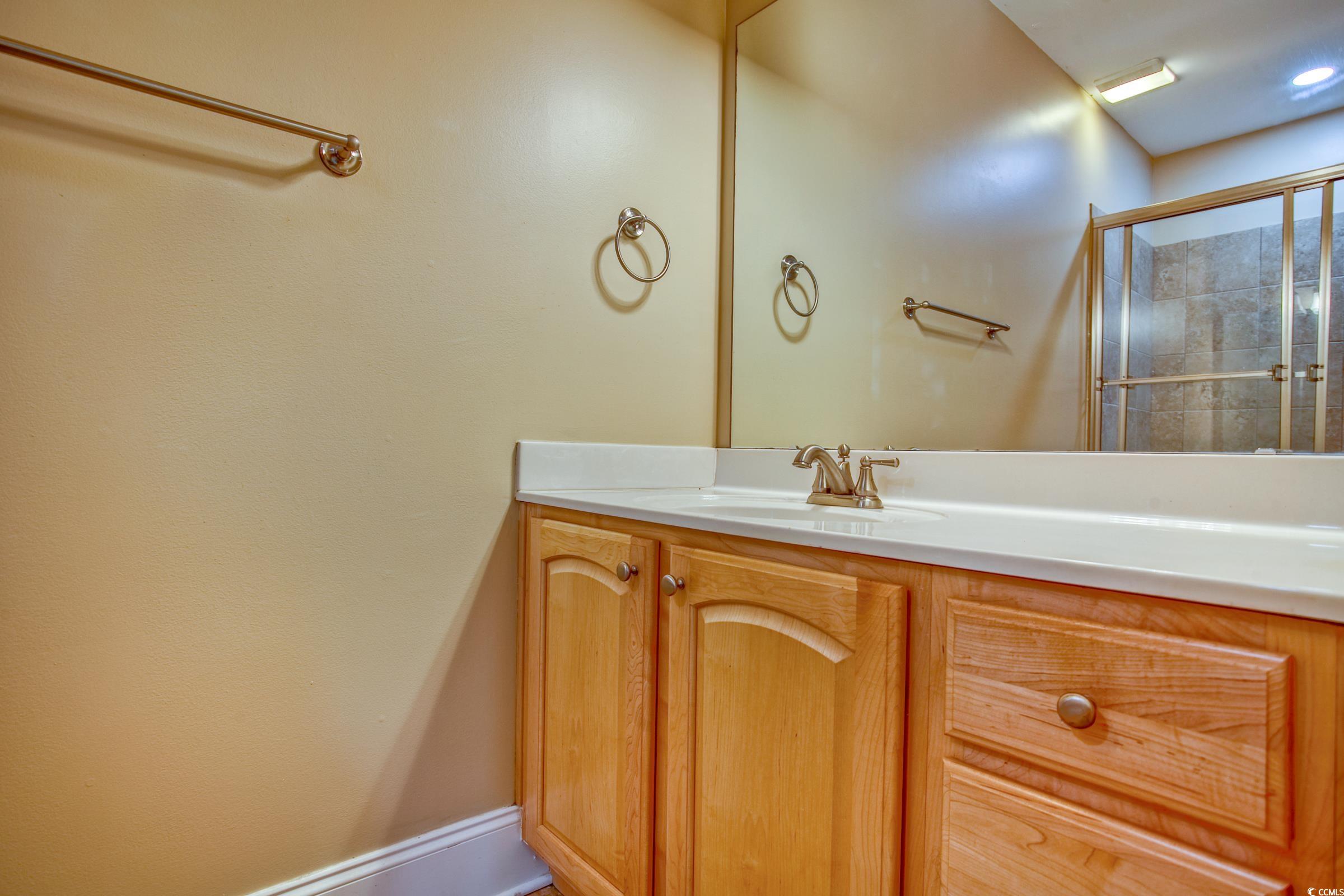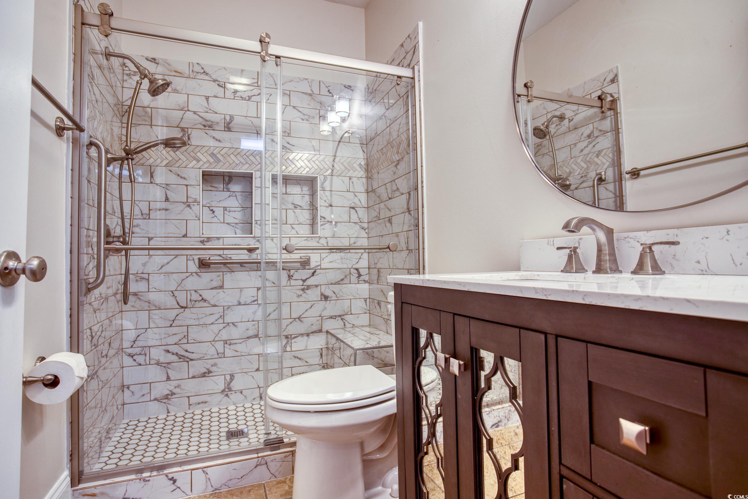 Welcome home to Southern Living at the Beach! This immaculate 3-bedroom, 2.5-bathroom residence in the heart of Surfside Beach, SC offers a spacious open floor plan with a split-bedroom layout and a long list of impressive upgrades. The guest bathroom has been completely renovated with a new tiled shower, vanity, mirror, light fixture, toilet, faucets, and fresh paint. One guest bedroom now features a newly added half bath with a stylish vanity, tiled flooring, shiplap accent wall, updated lighting, and a custom-built closet with shelving and illumination. All bedrooms boast brand-new carpet, while the screened porch features luxury vinyl plank flooring. The entire unit has been freshly painted, and additional enhancements include a newer hot water heater (approximately five years old), a new microwave vented to the exterior, and a new ceiling fan in the living room. Located just minutes from the Atlantic Ocean, this first-floor unit offers easy access and includes a private detached storage unit near the front door—perfect for beach or pool gear. The community amenity center features a sparkling pool, outdoor fireplace, and gas grill, ideal for relaxing summer evenings with friends and family. Priced to sell quickly, this coastal gem won’t last long—schedule your showing today!