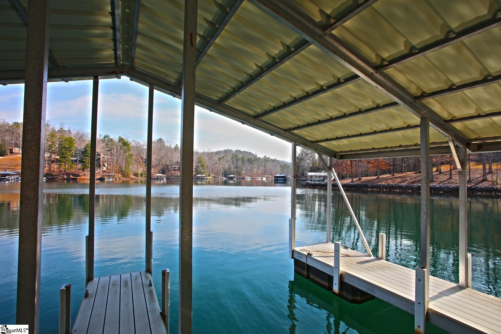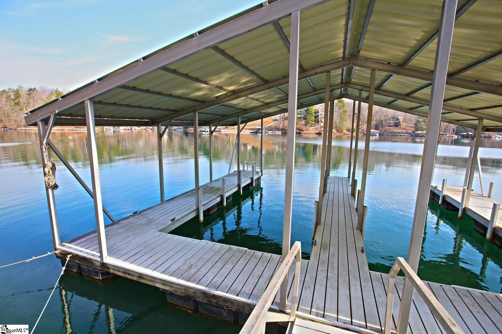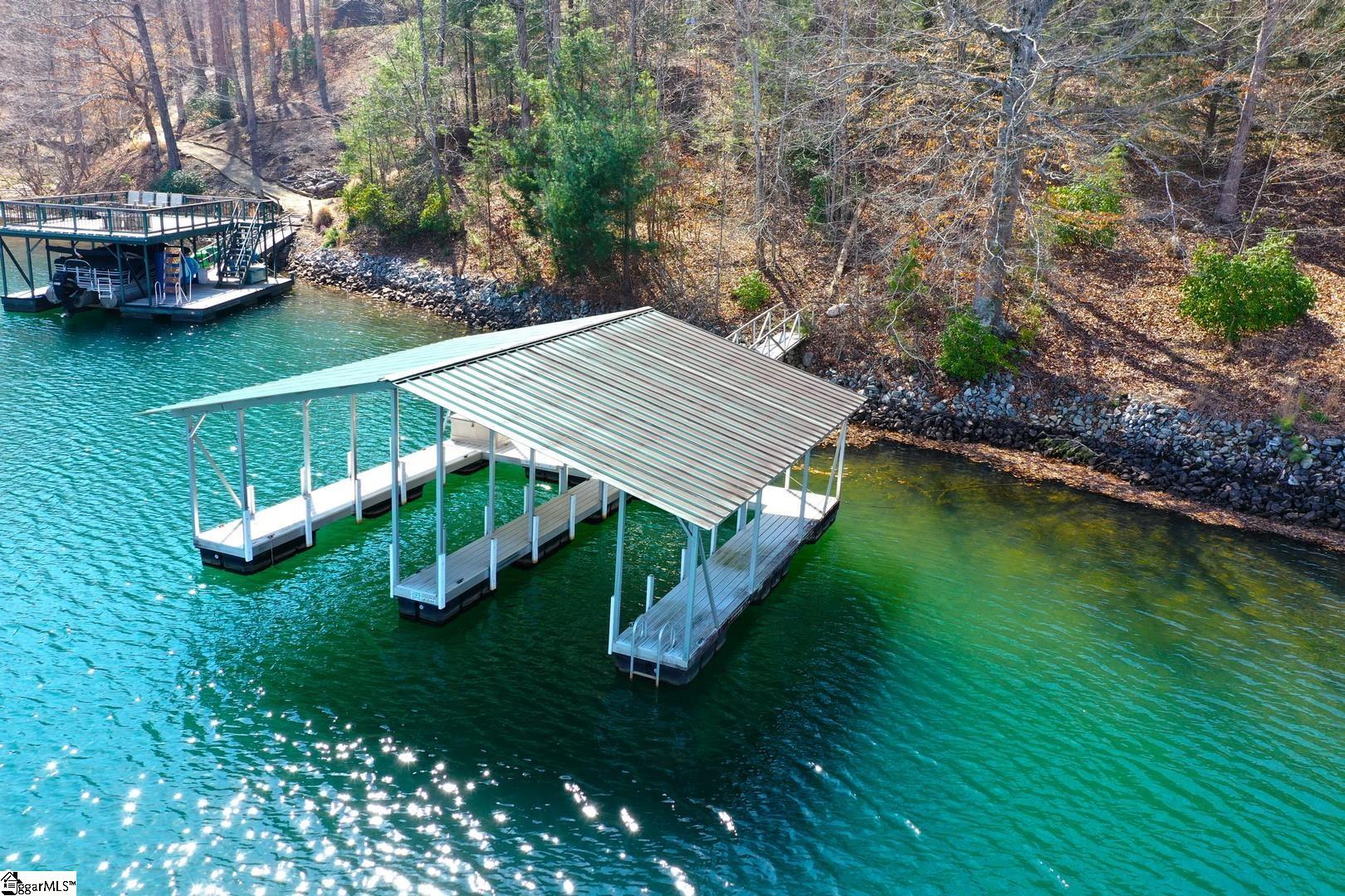 This beautiful lot features a double slip covered dock on deep water! Driveway already cut into building site. From there you have large stone steps leading you to the dock. This community has it's own boat ramp and will allow short term rentals!