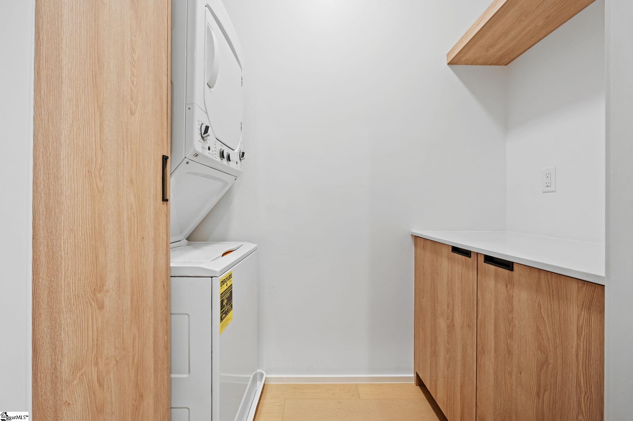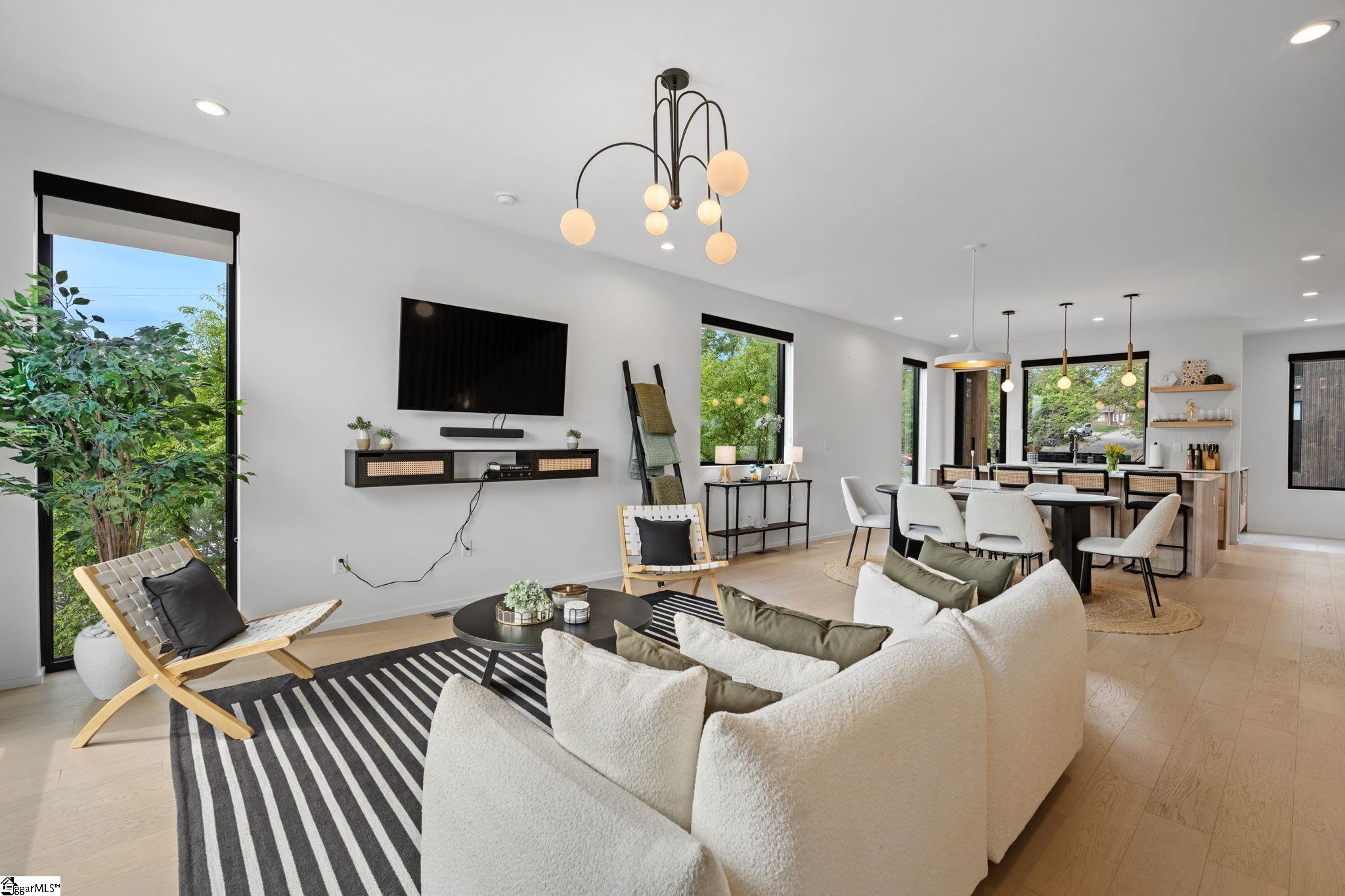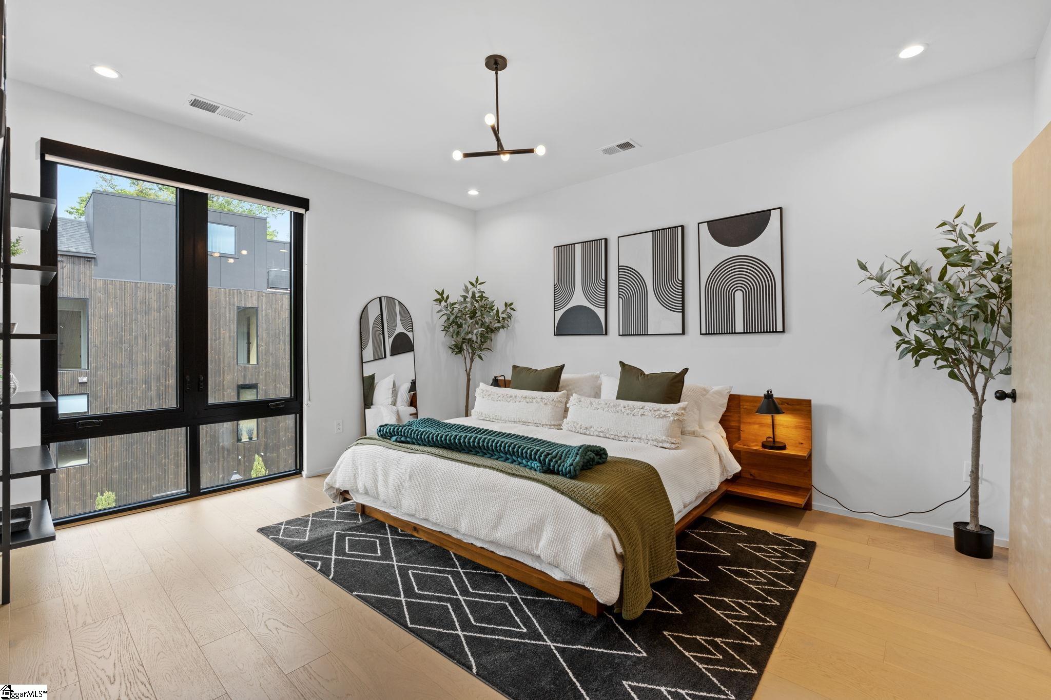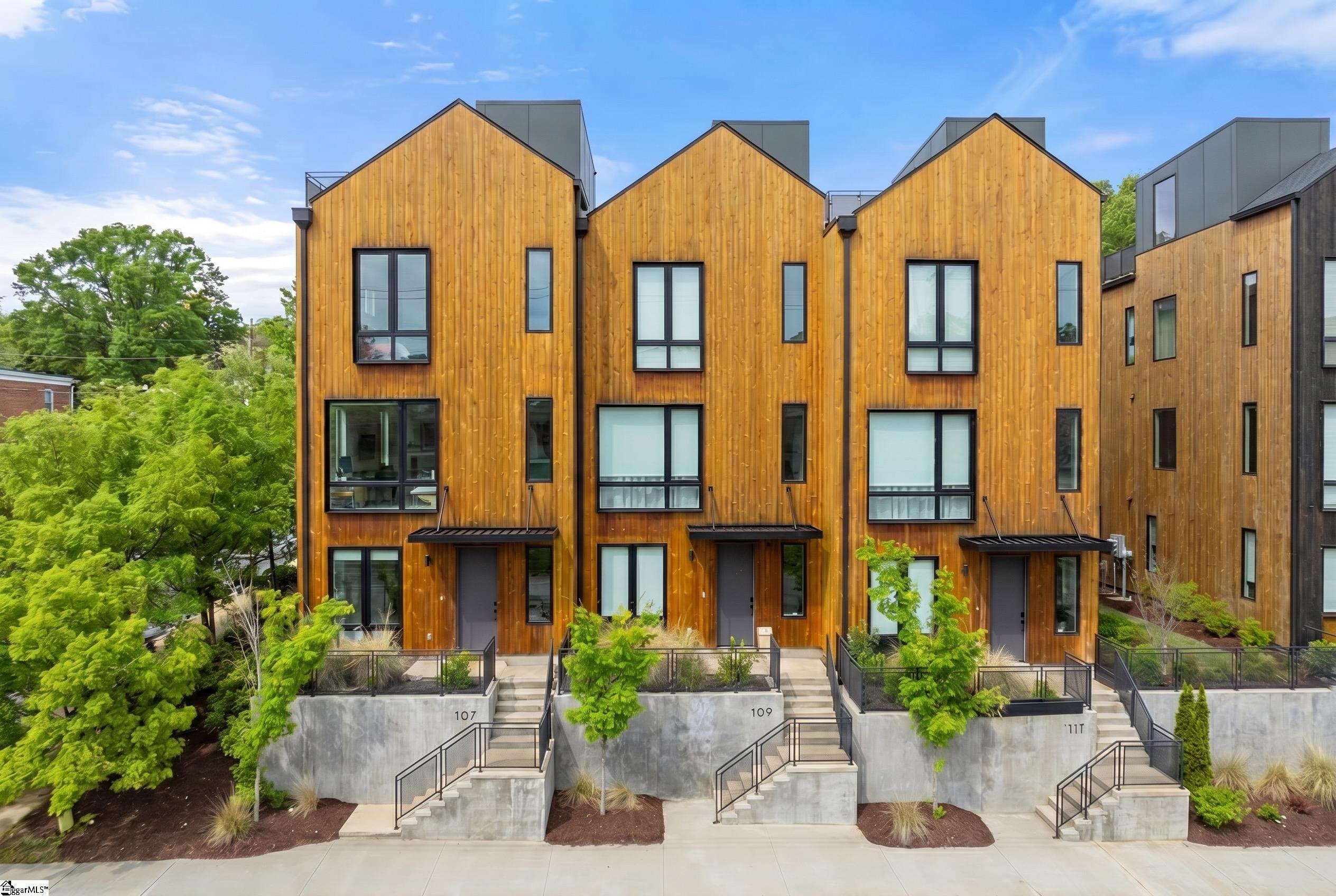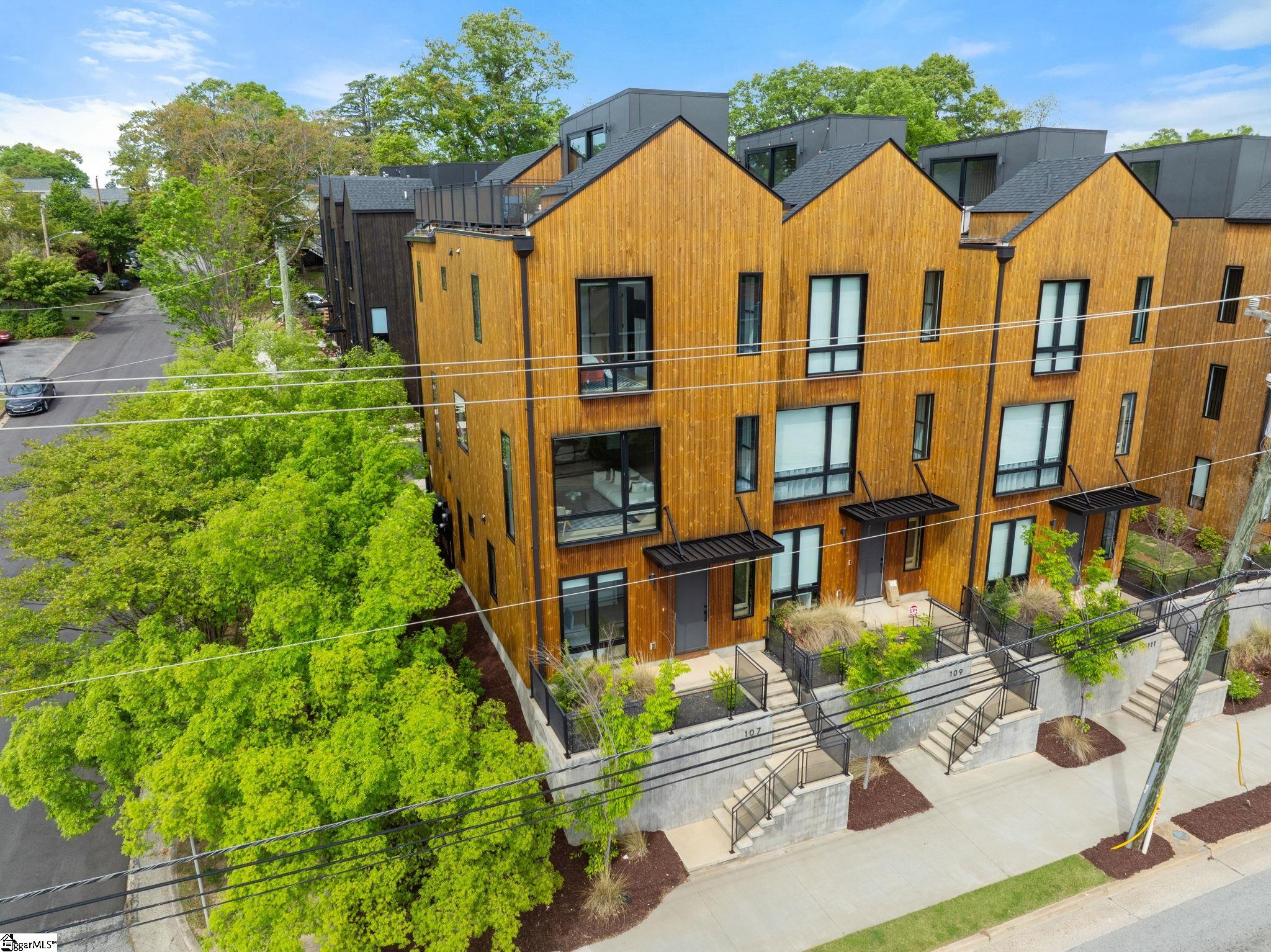 Elevated Scandinavian-inspired urban living meets a calm, modern retreat in this end-unit Downtown Greenville townhome, offered fully furnished and move-in ready. As a second residence, this home is basically a brand new construction. This 3 bedroom, 3.5 bath, 2,081 sqft home features a private elevator, bespoke cabinetry, and high-end thermally broken aluminum windows that fill the home with natural light. You can feel the intention in the curated interior design of the home, designed from the furniture to the dinnerware. The layout offers flexible living, a two-car garage, and HOA-maintained exterior for low-maintenance ownership. A rooftop terrace showcases stunning sunset views over downtown—perfect for entertaining or unwinding above the city. Ideally located between Earle Street and Main Street, this property is well-suited as a primary residence, lock and leave second home or investment opportunity. Coffee shops, restaurants, grocery store and even boutique shopping all walkable from this home. Morning walks on Earle and downtown walks for dinner, what could be better?