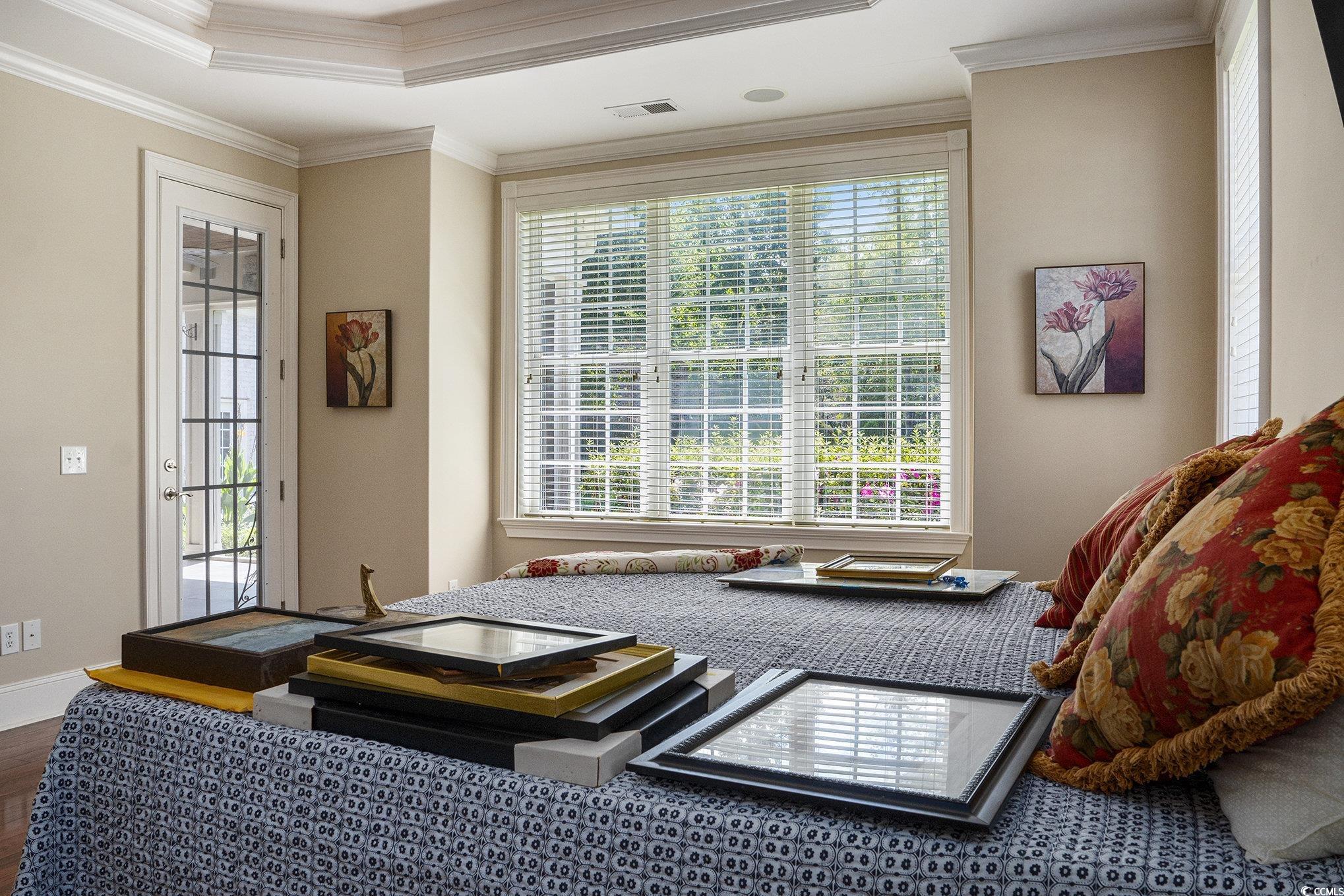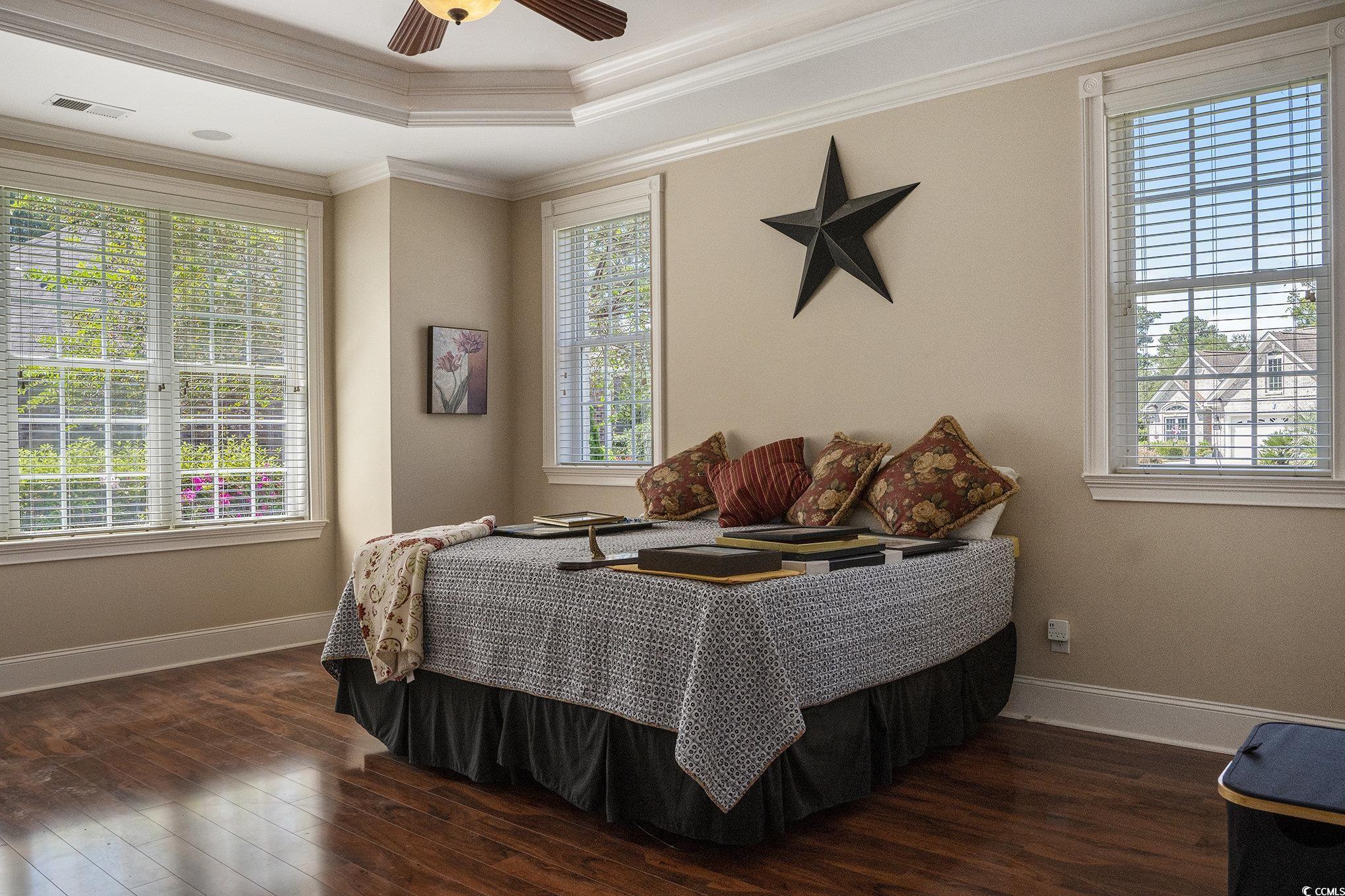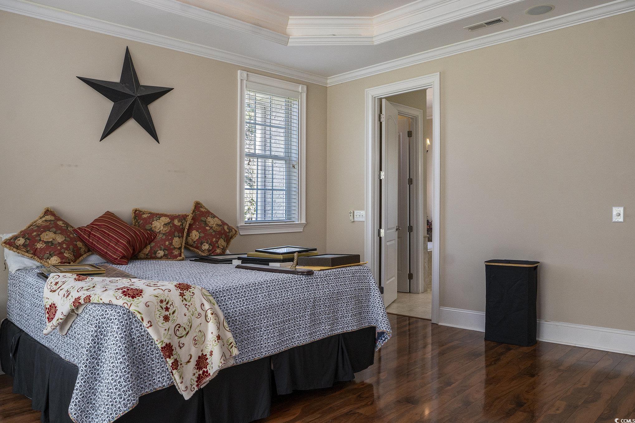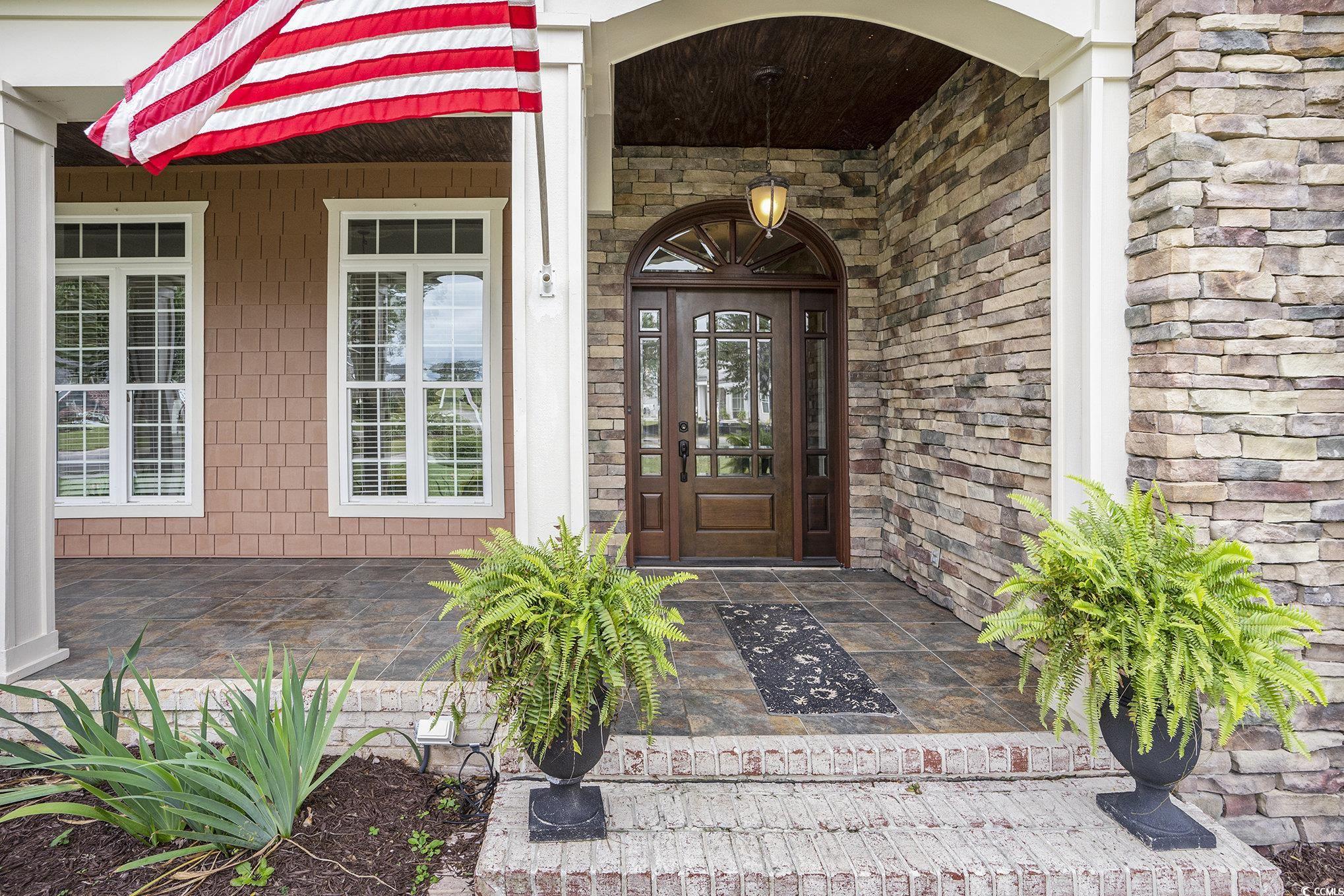 This custom-built 4-bedroom, 4.5-bathroom home sits on a corner lot in the desirable Long Bay golf community. It features a 2+ car garage with golf cart storage and a finished living space above. Inside, you'll find coffered and tray ceilings, hardwood floors, and high-end custom finishes throughout. The gourmet kitchen includes an island and handcrafted cabinetry, complemented by a formal dining room, home office, and a main-level primary suite with dual vanities and his-and-hers walk-in closets. Enjoy outdoor living with a charming front porch, two spacious driveways, a large screened-in patio, and a beautifully landscaped backyard with a fountain. This property is ideal as a primary residence, vacation home, or investment opportunity. Located just 20 minutes from the beach, Long Bay is a quiet, established golf community with low HOA fees, a clubhouse, and a community pool. Conveniently accessible via Highways 9 and 31, it's close to North Myrtle Beach and all the attractions of the Grand Strand.