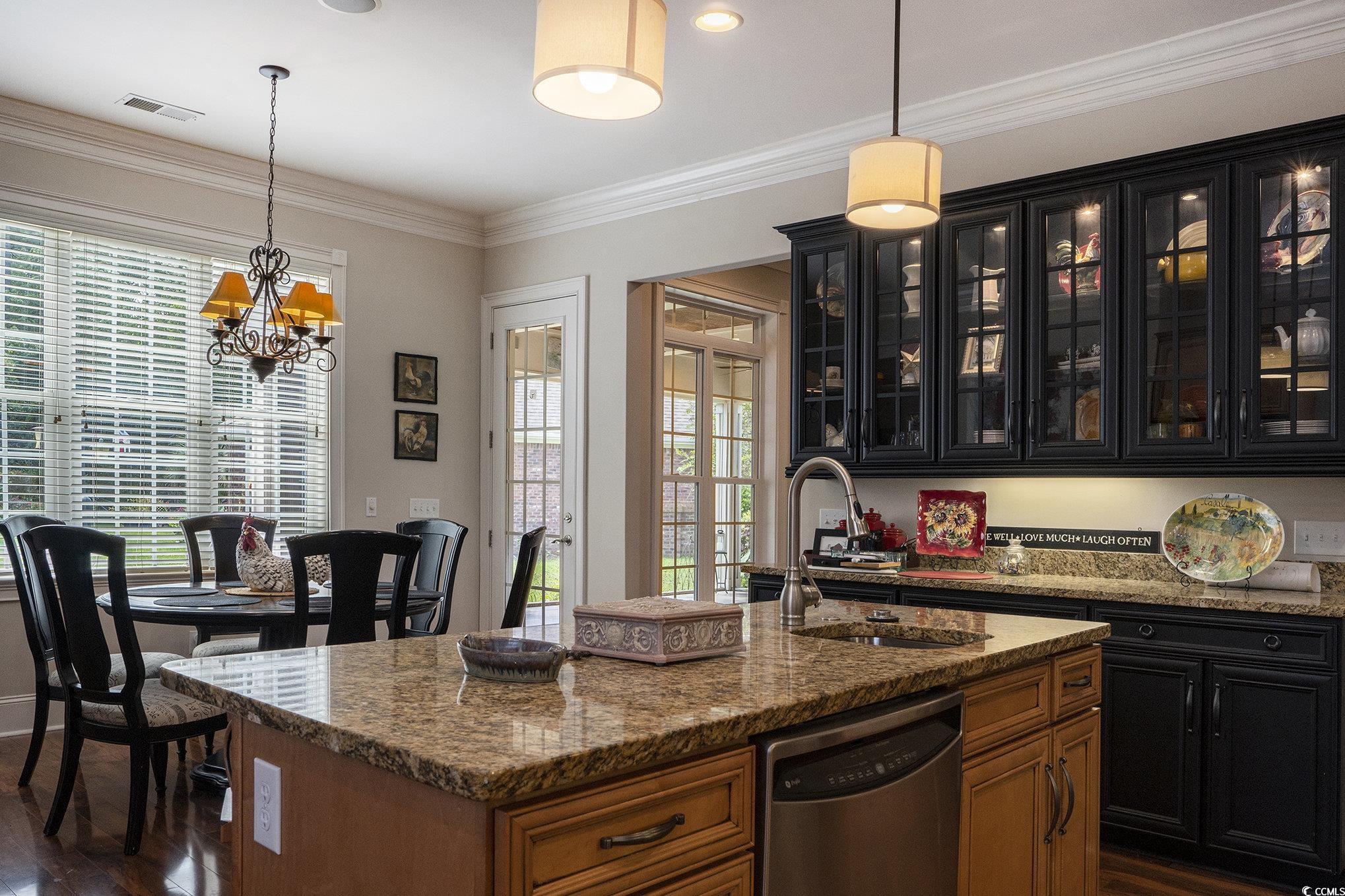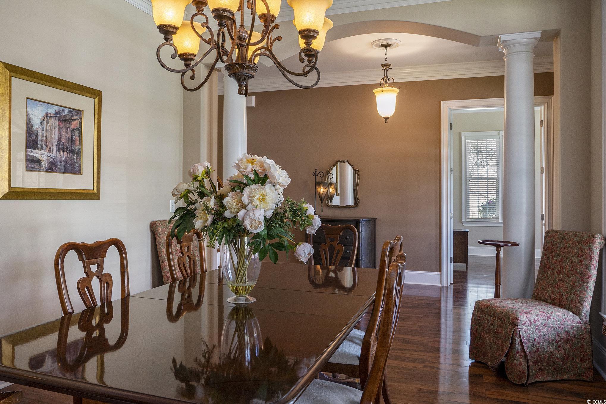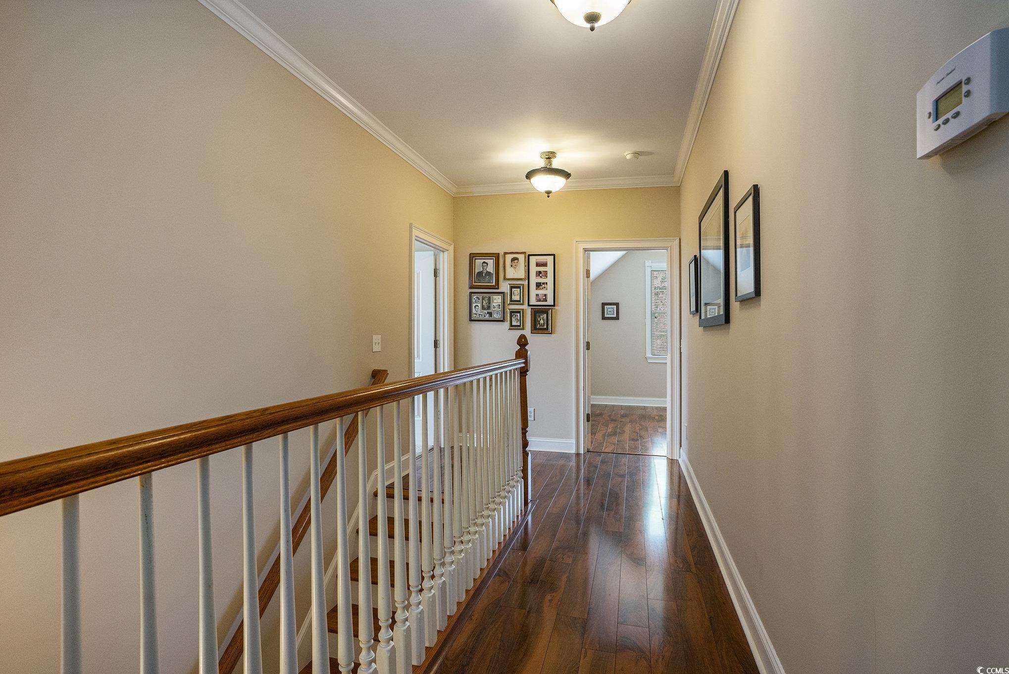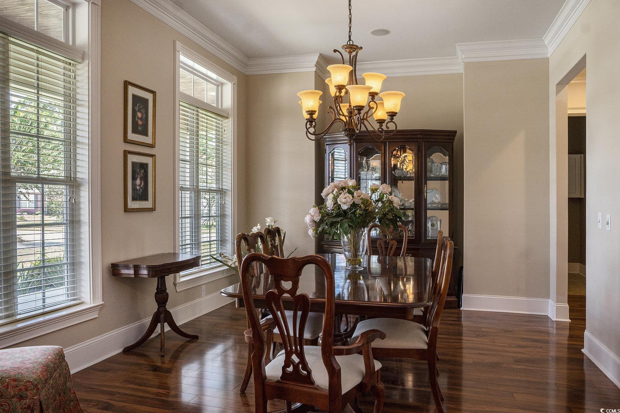 This custom-built 4-bedroom, 4.5-bathroom home sits on a corner lot in the desirable Long Bay golf community. It features a 2+ car garage with golf cart storage and a finished living space above. Inside, you'll find coffered and tray ceilings, hardwood floors, and high-end custom finishes throughout. The gourmet kitchen includes an island and handcrafted cabinetry, complemented by a formal dining room, home office, and a main-level primary suite with dual vanities and his-and-hers walk-in closets. Enjoy outdoor living with a charming front porch, two spacious driveways, a large screened-in patio, and a beautifully landscaped backyard with a fountain. This property is ideal as a primary residence, vacation home, or investment opportunity. Located just 20 minutes from the beach, Long Bay is a quiet, established golf community with low HOA fees, a clubhouse, and a community pool. Conveniently accessible via Highways 9 and 31, it's close to North Myrtle Beach and all the attractions of the Grand Strand.