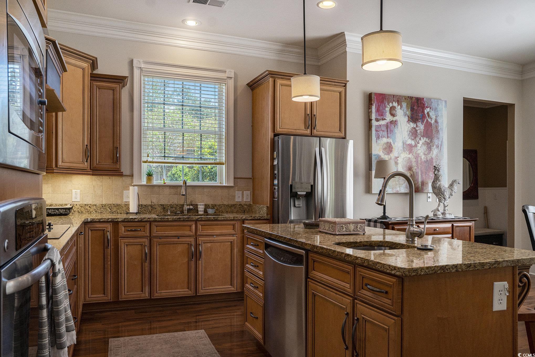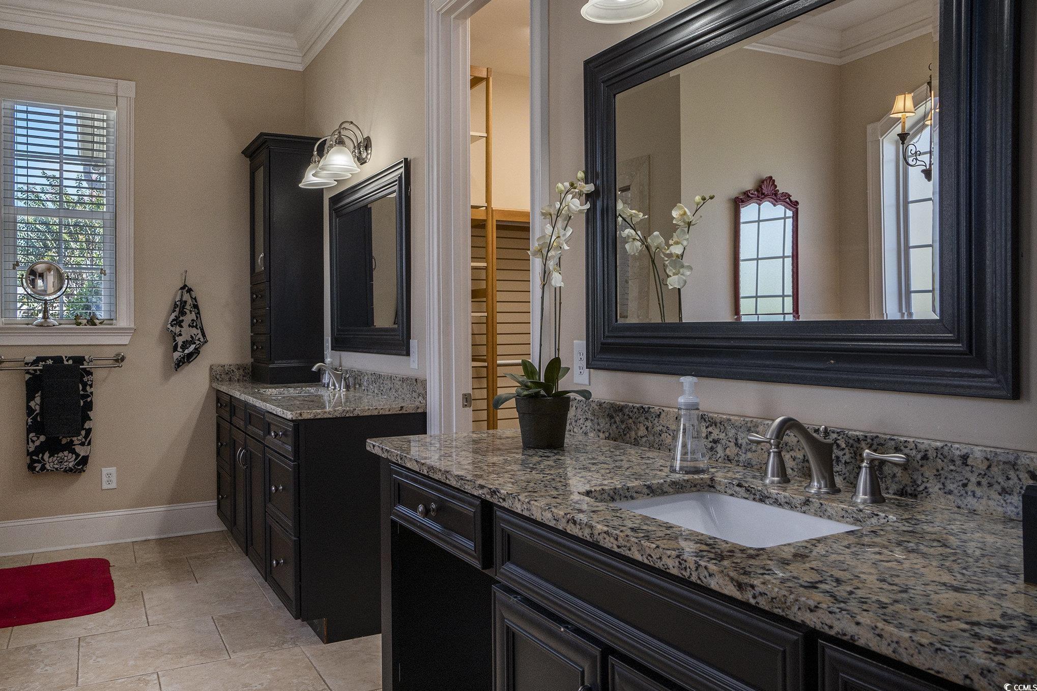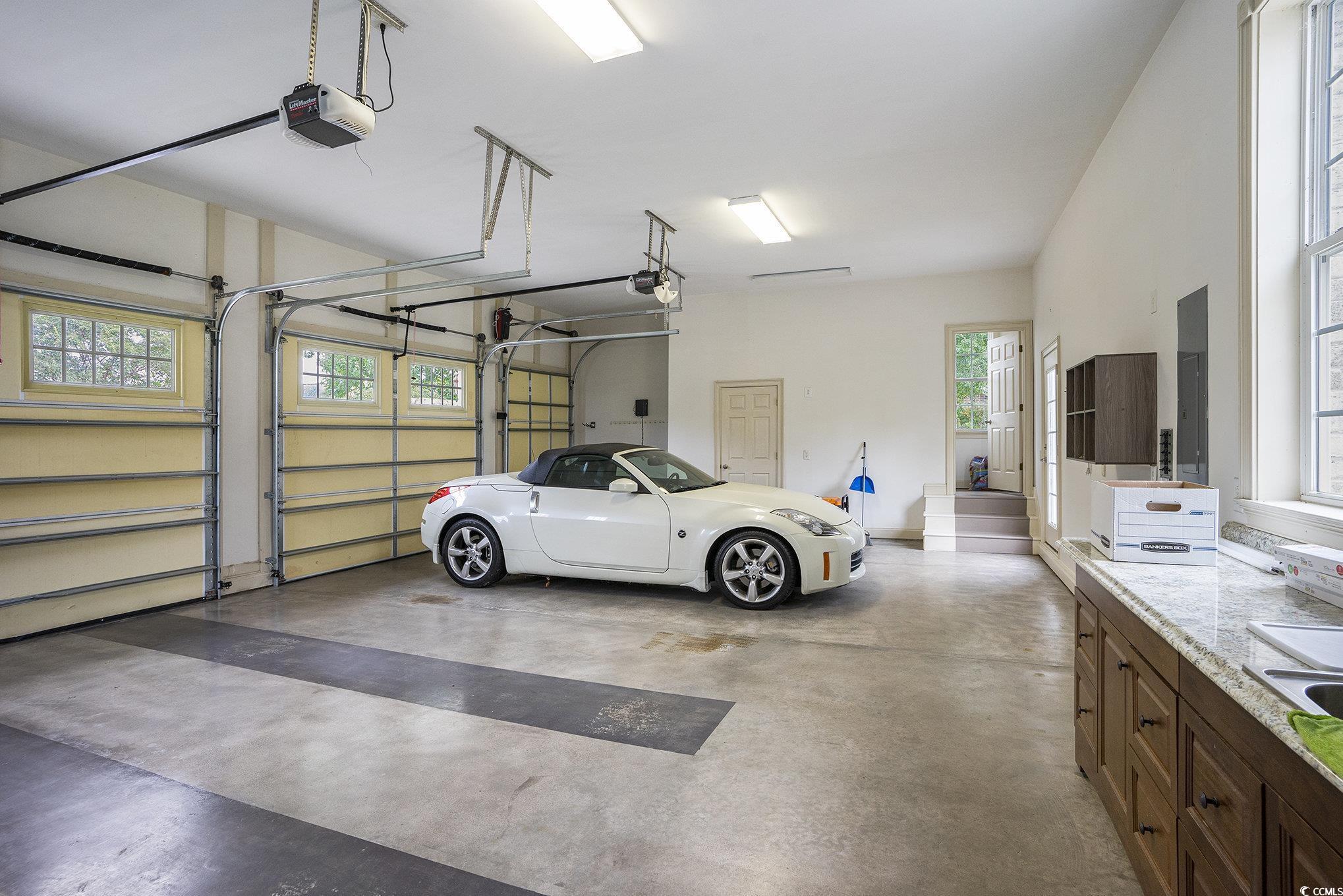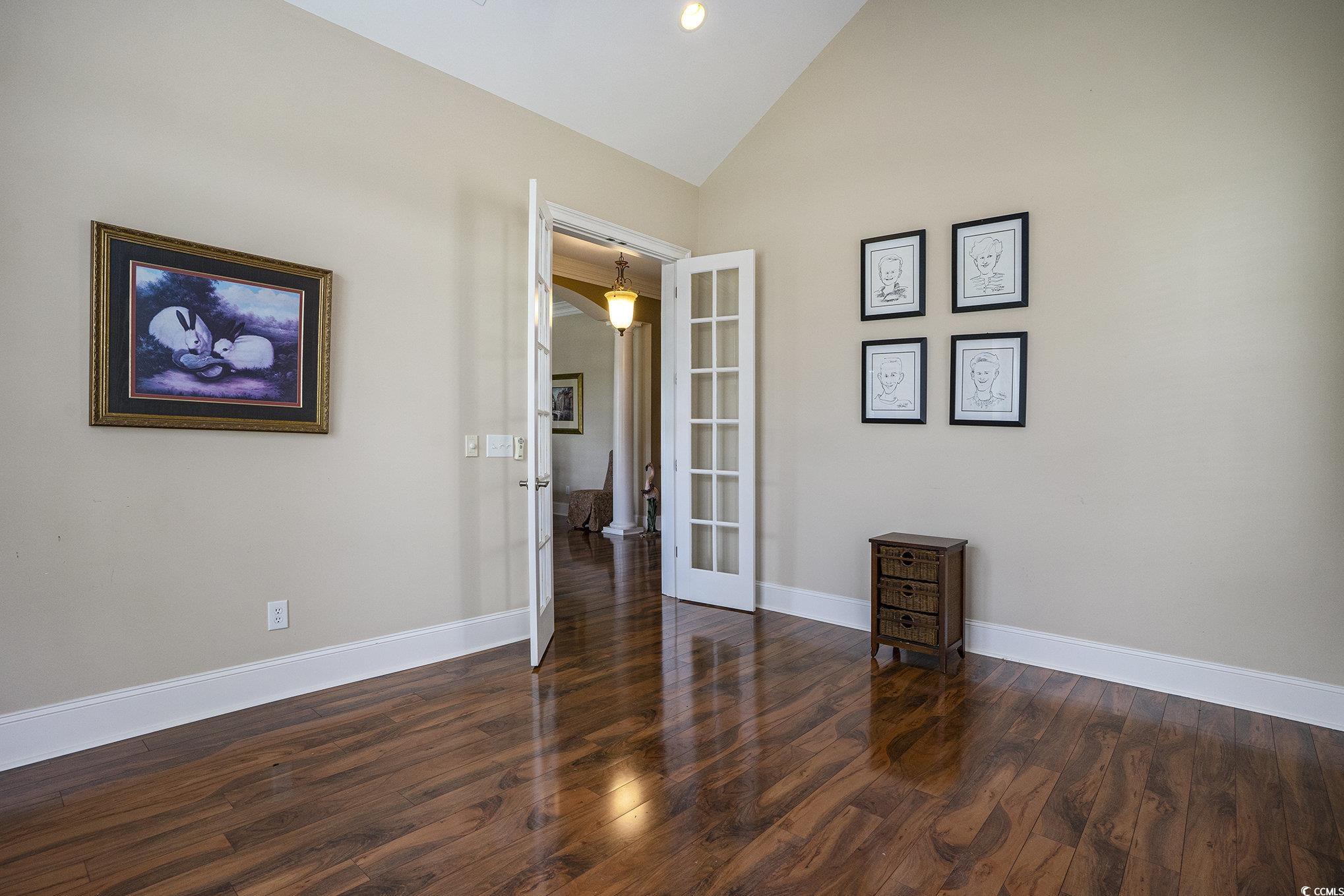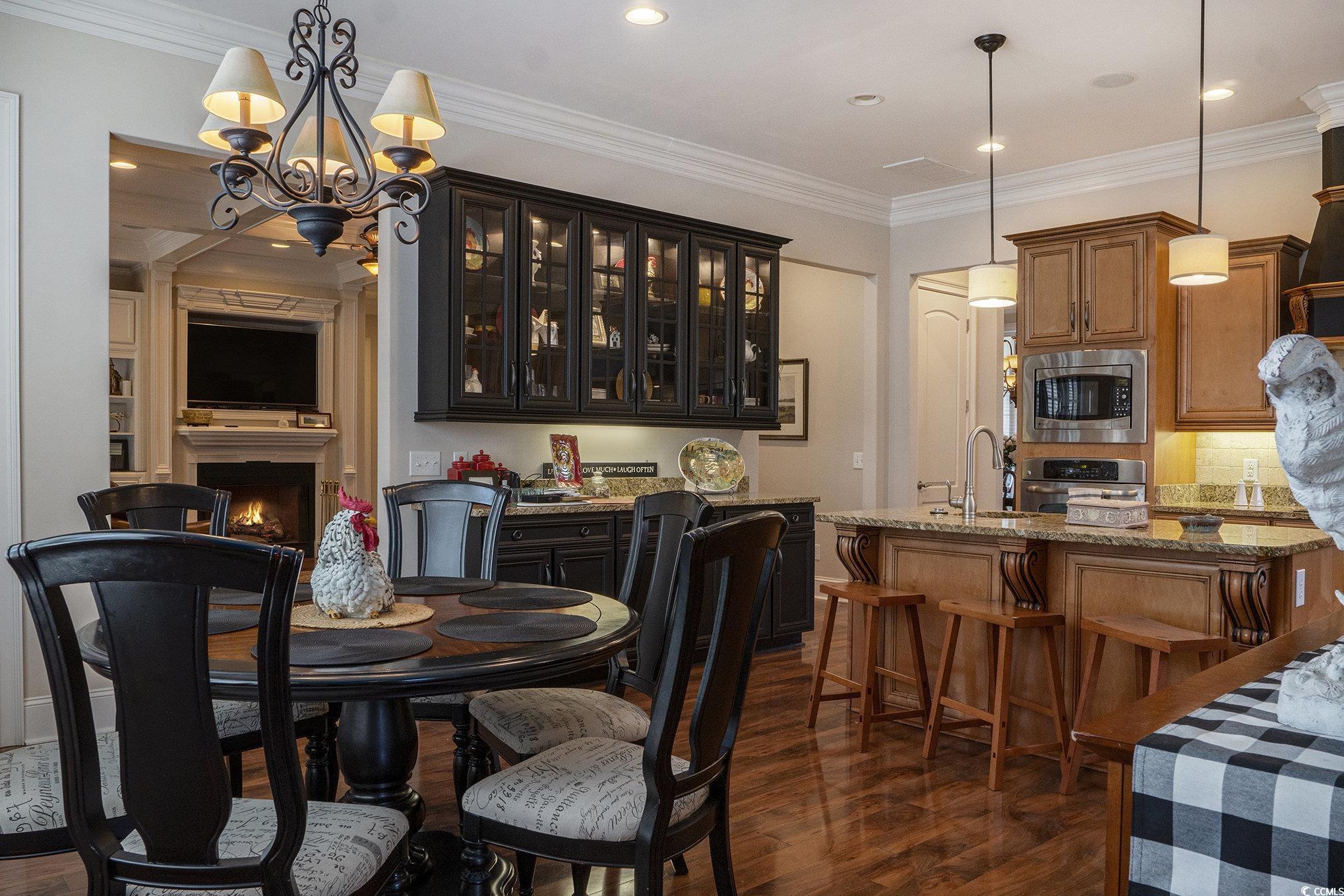 This custom-built 4-bedroom, 4.5-bathroom home sits on a corner lot in the desirable Long Bay golf community. It features a 2+ car garage with golf cart storage and a finished living space above. Inside, you'll find coffered and tray ceilings, hardwood floors, and high-end custom finishes throughout. The gourmet kitchen includes an island and handcrafted cabinetry, complemented by a formal dining room, home office, and a main-level primary suite with dual vanities and his-and-hers walk-in closets. Enjoy outdoor living with a charming front porch, two spacious driveways, a large screened-in patio, and a beautifully landscaped backyard with a fountain. This property is ideal as a primary residence, vacation home, or investment opportunity. Located just 20 minutes from the beach, Long Bay is a quiet, established golf community with low HOA fees, a clubhouse, and a community pool. Conveniently accessible via Highways 9 and 31, it's close to North Myrtle Beach and all the attractions of the Grand Strand.