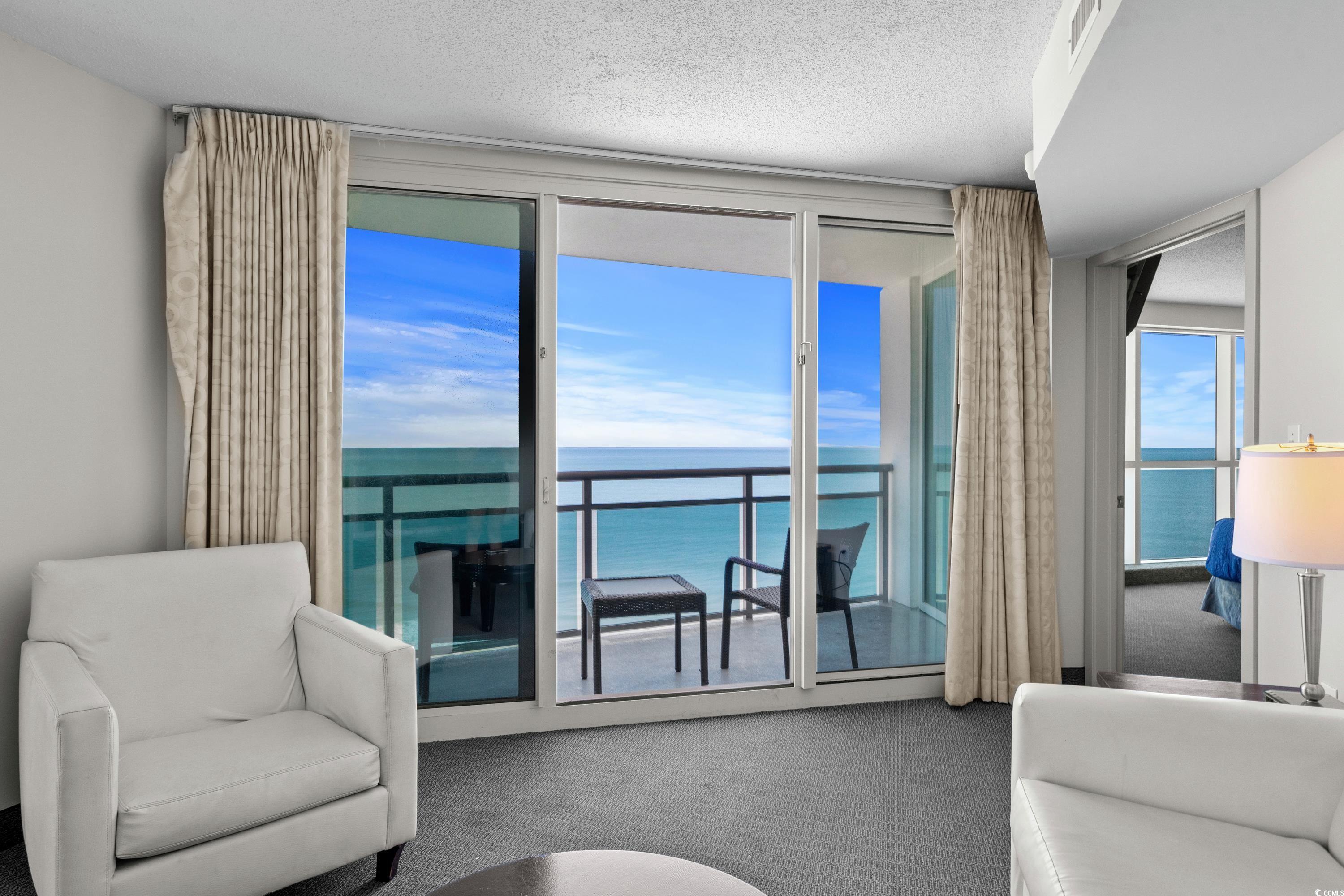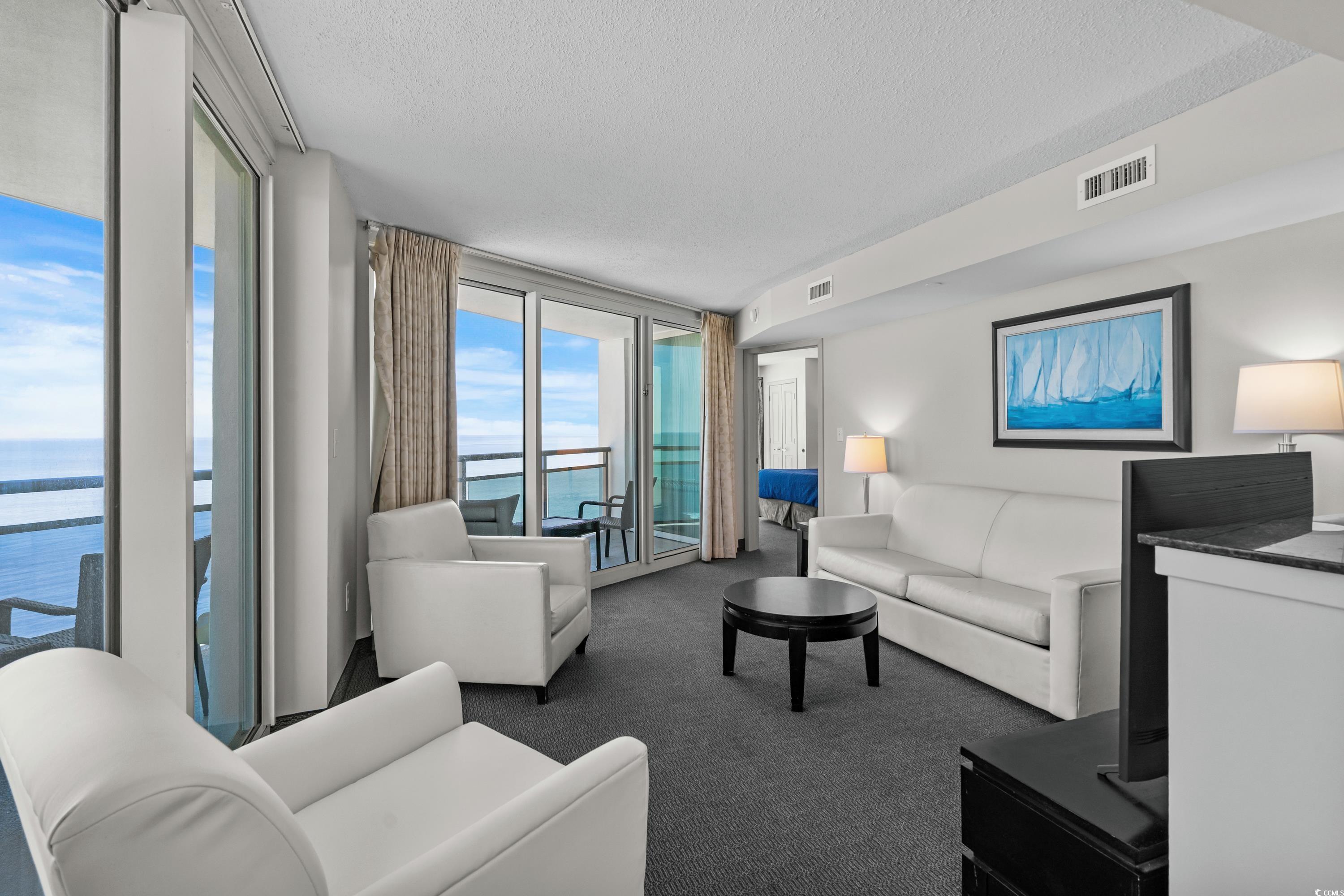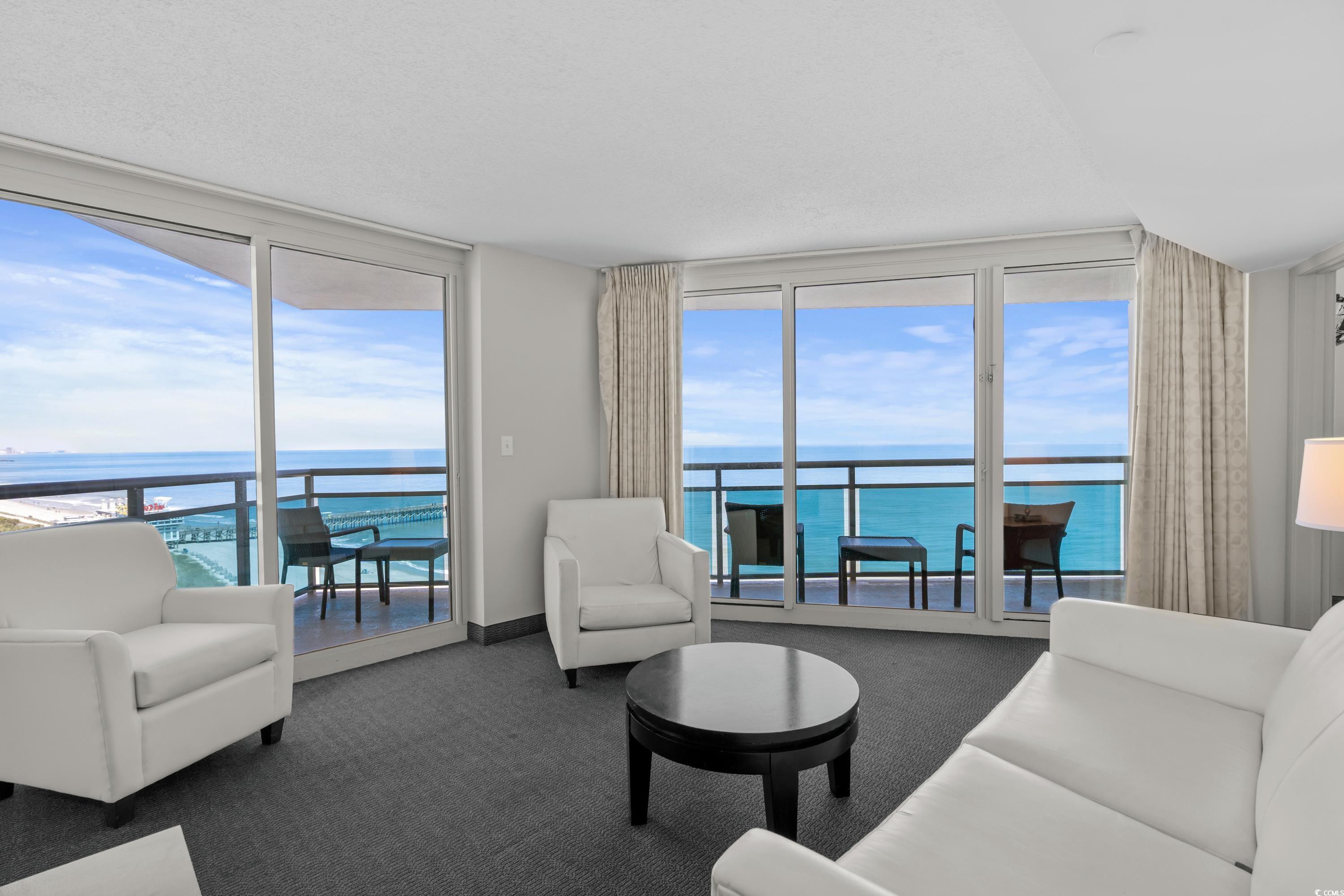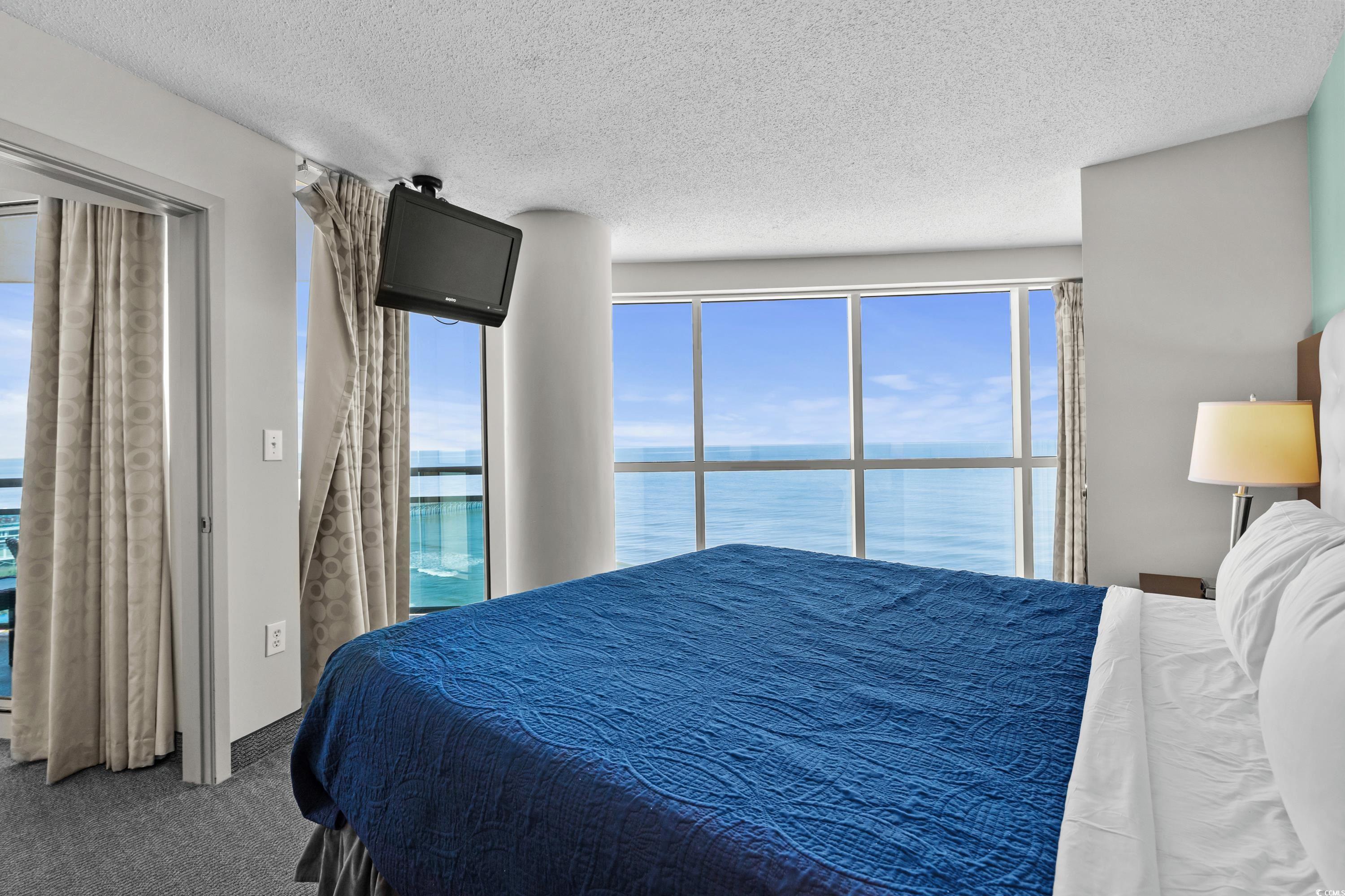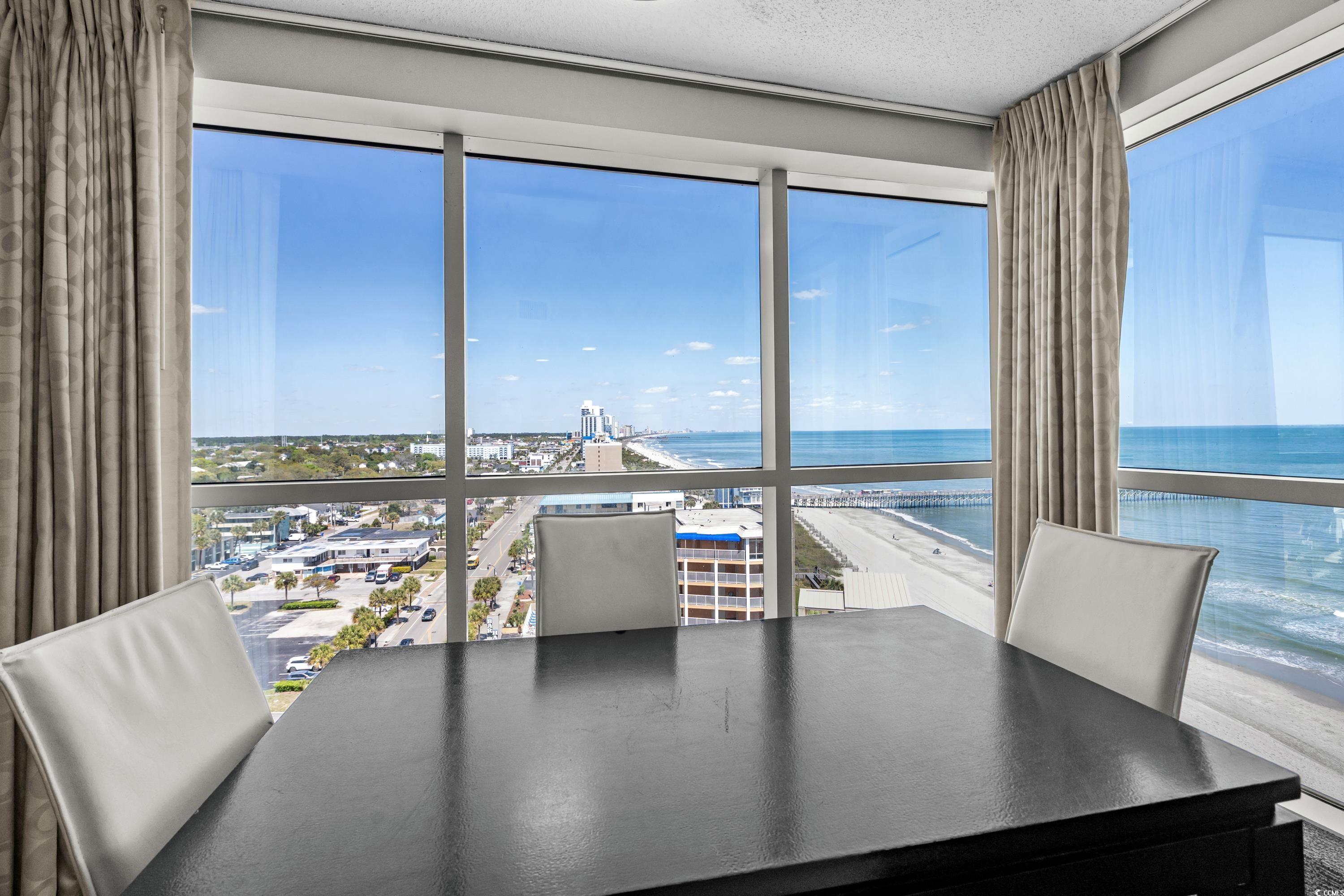 Welcome to this luxurious and versatile 2-bedroom, 2-bathroom oceanfront lockout condo located in the heart of Myrtle Beach. Situated on a prime end unit, this stunning property boasts floor-to-ceiling windows offering uninterrupted panoramic views of the Atlantic Ocean, coastline, and cityscape — truly a front-row seat to some of the most breathtaking sunrises on the East Coast. This thoughtfully designed condo can be used as a spacious 2-bedroom unit or locked out into two separate accommodations: a 1-bedroom, 1-bathroom condo with a full kitchen and living area, and a private studio with its own bathroom as well. Whether you're seeking a personal retreat, vacation home, or a high-performing investment property with flexible rental options, this unit delivers exceptional value and appeal. The interiors feature a sleek, contemporary aesthetic with clean lines, soft coastal hues, and upscale furnishings. The main living space opens to a private balcony through sliding glass doors, offering expansive views that stretch up and down the coast. Natural light floods the space, creating a bright and airy ambiance that perfectly complements the oceanfront setting. The fully equipped kitchen is outfitted with stainless steel appliances, wood cabinetry, and plenty of counter space ideal for entertaining or preparing meals after a day on the beach. The adjacent dining area is framed by wraparound windows, allowing you to dine with an unforgettable backdrop of sea and sky. The primary bedroom features its own sweeping ocean views. A private en-suite bathroom offers ample storage, and a shower/tub combo. The second bedroom — part of the lockout studio — also features ocean views, its own sitting area, and a bathroom, making it ideal for guests or potential rental clients seeking privacy and comfort. Oceans One Resort offers access to a wide array of resort-style amenities that cater to all ages. Enjoy an outdoor pool, an indoor pool, a relaxing hot tub, and a lazy river that winds through a beautifully landscaped sun deck. Little ones will love the outdoor kiddie pool and splash features, while adults can unwind with a drink in hand as they lounge by the water, all with the sounds of the surf as a backdrop. Located just minutes from Myrtle Beach’s most iconic attractions, including the Boardwalk, SkyWheel, Market Common, and a variety of golf courses, dining, and entertainment options, this unit offers the perfect blend of convenience and coastal luxury. Whether you're looking for a second home, a beachfront getaway, or an income-producing property this location is hard to beat. Don’t miss this rare opportunity to own a modern, oceanfront condo in one of Myrtle Beach’s most sought-after high-rise resorts. Buyer is responsible for verification.