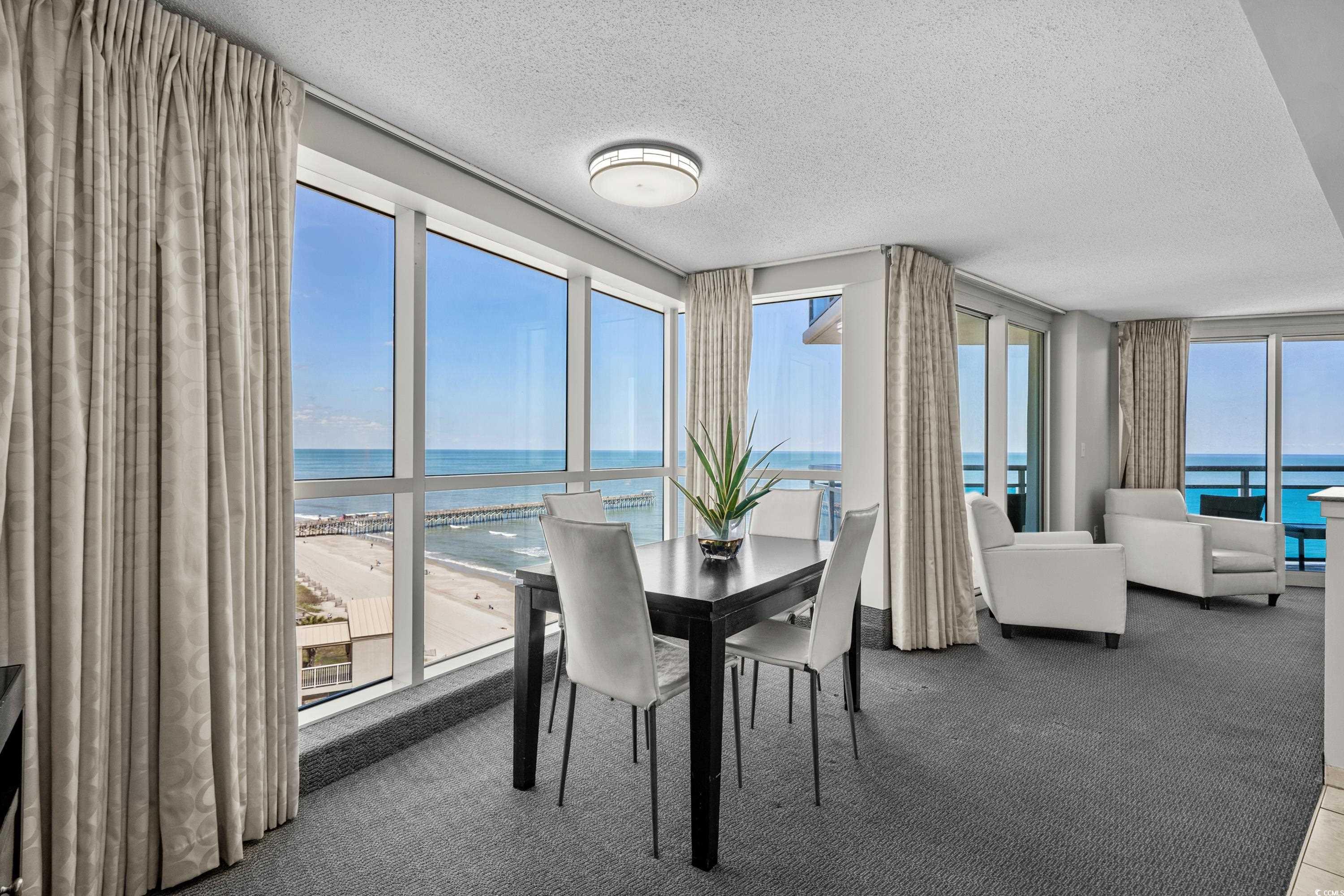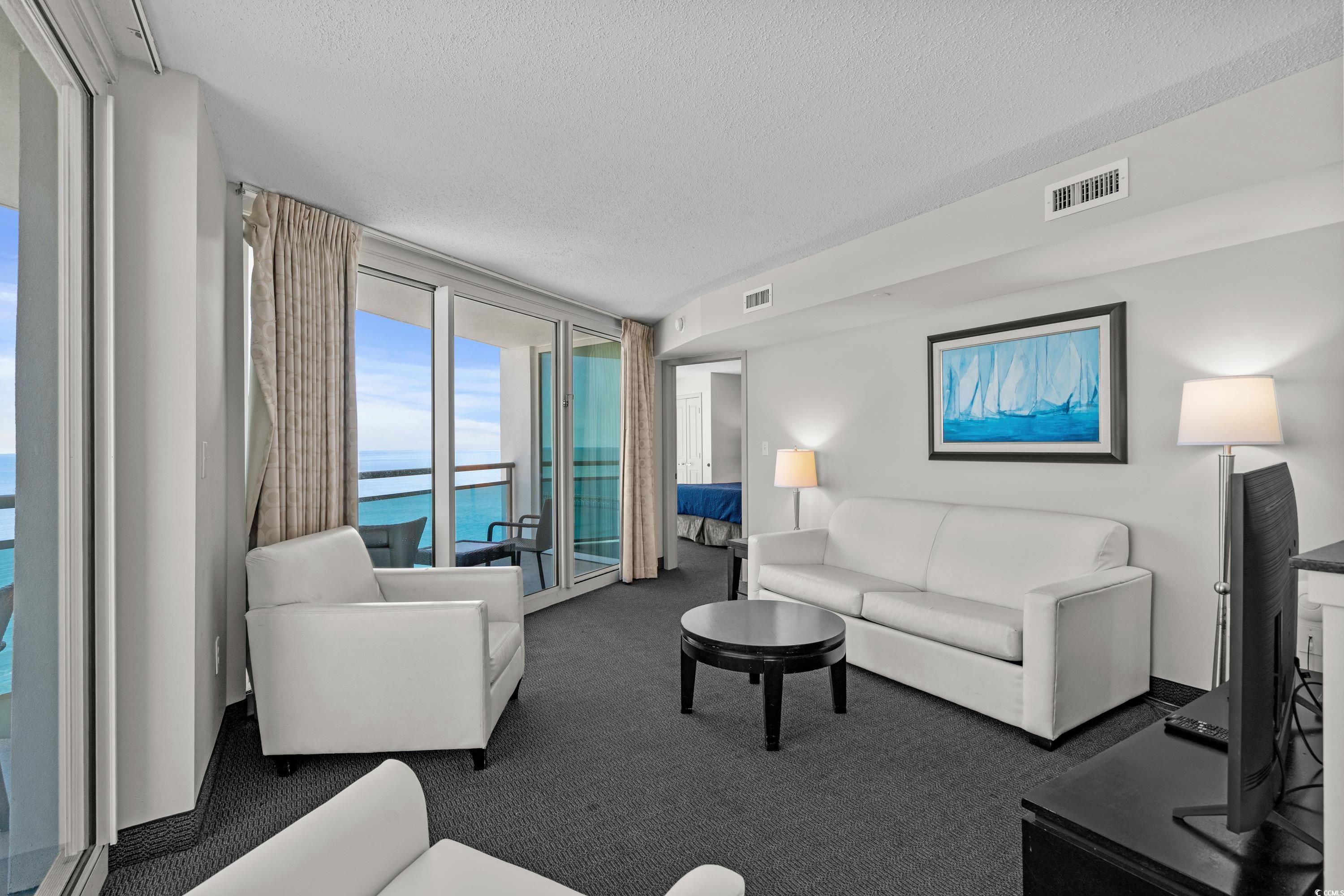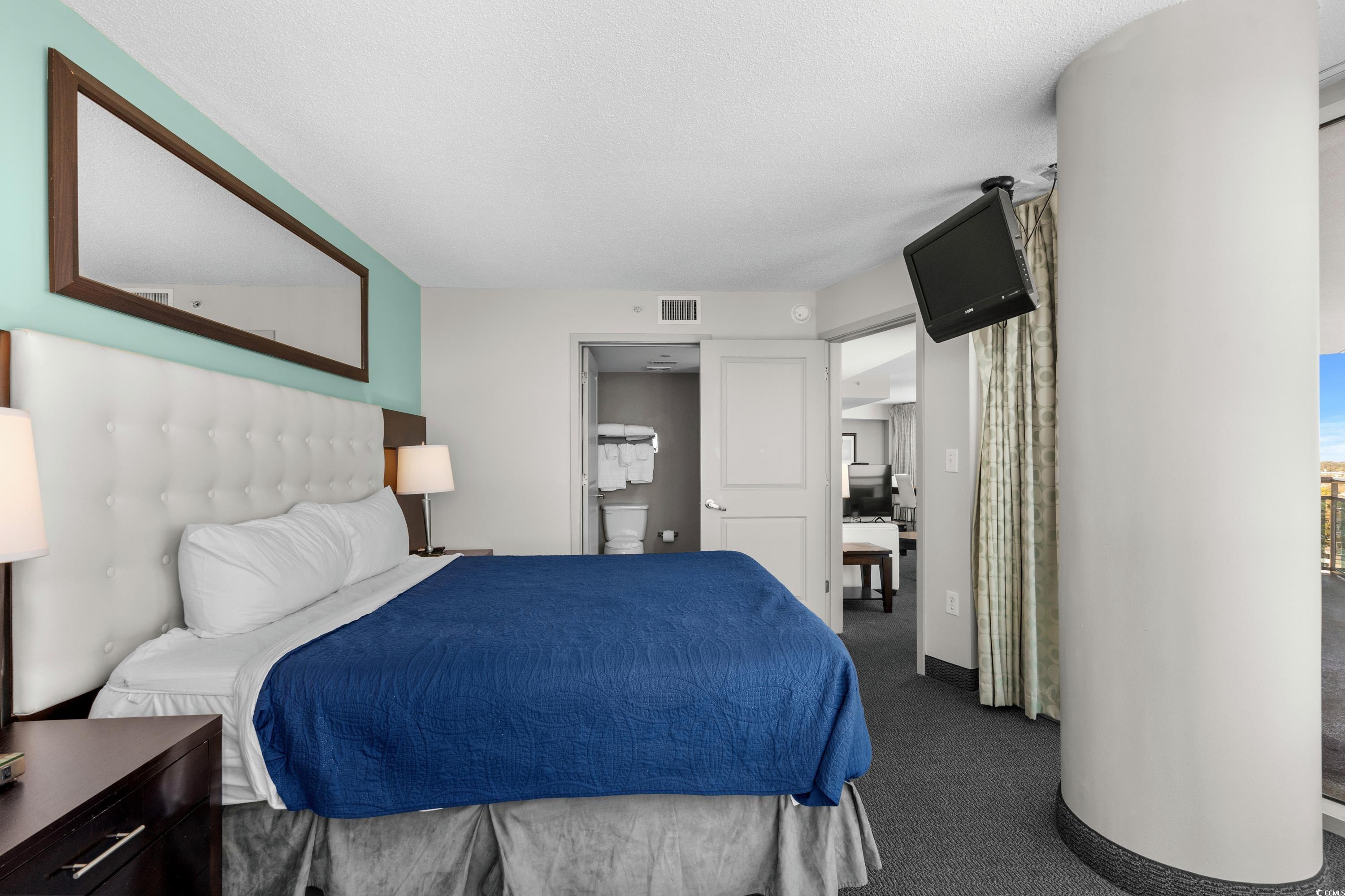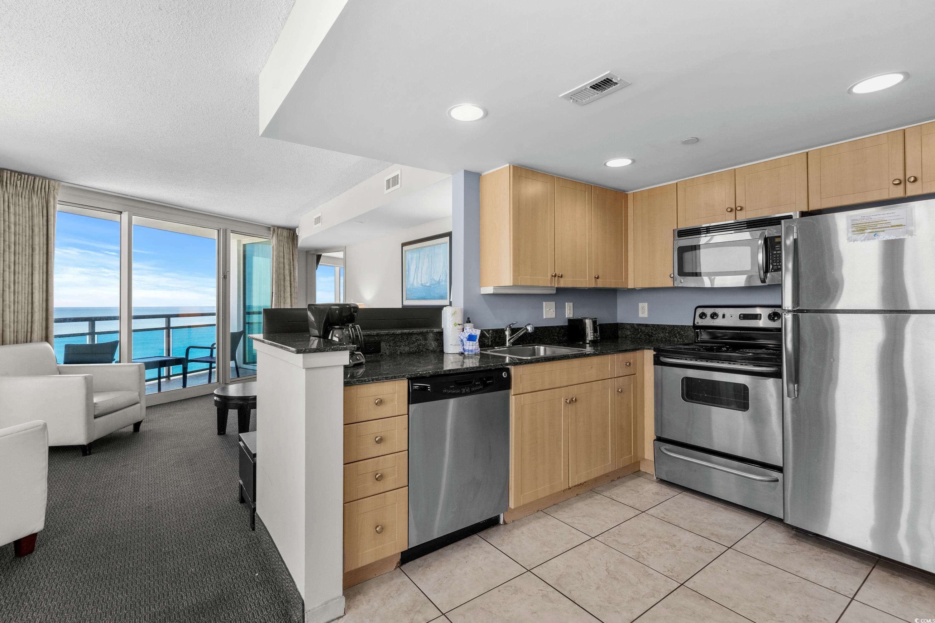 Welcome to this luxurious and versatile 2-bedroom, 2-bathroom oceanfront lockout condo located in the heart of Myrtle Beach. Situated on a prime end unit, this stunning property boasts floor-to-ceiling windows offering uninterrupted panoramic views of the Atlantic Ocean, coastline, and cityscape — truly a front-row seat to some of the most breathtaking sunrises on the East Coast. This thoughtfully designed condo can be used as a spacious 2-bedroom unit or locked out into two separate accommodations: a 1-bedroom, 1-bathroom condo with a full kitchen and living area, and a private studio with its own bathroom as well. Whether you're seeking a personal retreat, vacation home, or a high-performing investment property with flexible rental options, this unit delivers exceptional value and appeal. The interiors feature a sleek, contemporary aesthetic with clean lines, soft coastal hues, and upscale furnishings. The main living space opens to a private balcony through sliding glass doors, offering expansive views that stretch up and down the coast. Natural light floods the space, creating a bright and airy ambiance that perfectly complements the oceanfront setting. The fully equipped kitchen is outfitted with stainless steel appliances, wood cabinetry, and plenty of counter space ideal for entertaining or preparing meals after a day on the beach. The adjacent dining area is framed by wraparound windows, allowing you to dine with an unforgettable backdrop of sea and sky. The primary bedroom features its own sweeping ocean views. A private en-suite bathroom offers ample storage, and a shower/tub combo. The second bedroom — part of the lockout studio — also features ocean views, its own sitting area, and a bathroom, making it ideal for guests or potential rental clients seeking privacy and comfort. Oceans One Resort offers access to a wide array of resort-style amenities that cater to all ages. Enjoy an outdoor pool, an indoor pool, a relaxing hot tub, and a lazy river that winds through a beautifully landscaped sun deck. Little ones will love the outdoor kiddie pool and splash features, while adults can unwind with a drink in hand as they lounge by the water, all with the sounds of the surf as a backdrop. Located just minutes from Myrtle Beach’s most iconic attractions, including the Boardwalk, SkyWheel, Market Common, and a variety of golf courses, dining, and entertainment options, this unit offers the perfect blend of convenience and coastal luxury. Whether you're looking for a second home, a beachfront getaway, or an income-producing property this location is hard to beat. Don’t miss this rare opportunity to own a modern, oceanfront condo in one of Myrtle Beach’s most sought-after high-rise resorts. Buyer is responsible for verification.