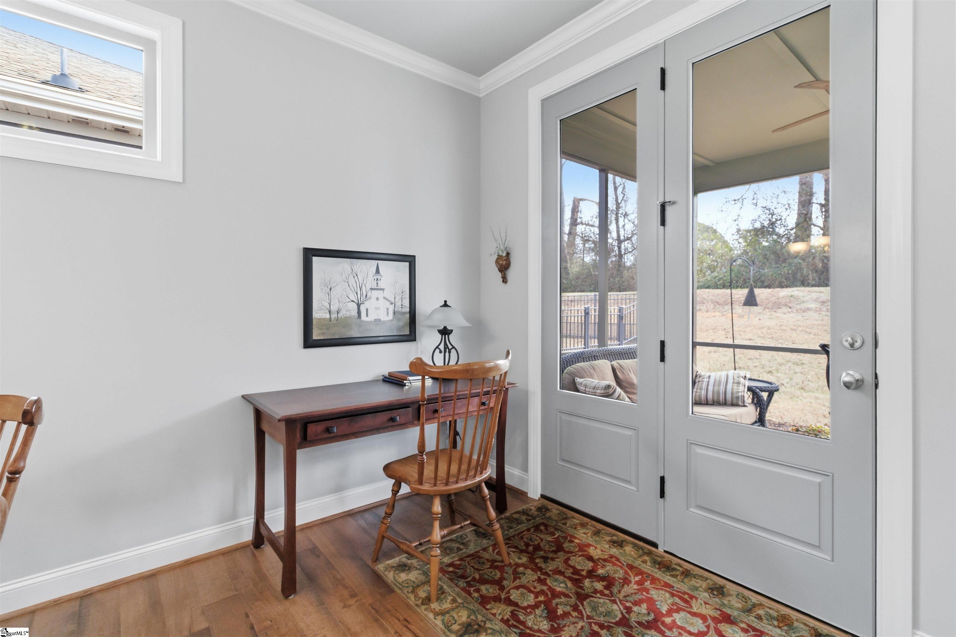 Welcome to the Cottages at Harrison Bridge, a premier gated community in Simpsonville offering low-maintenance living just minutes from Fairview Road shopping, dining, hospital access, and quick connectivity to I-385 — and less than 20 minutes to downtown Greenville. Built in 2021, this thoughtfully designed 3-bedroom, 2.5-bath home features primary living on the main floor and an open layout ideal for both everyday living and entertaining. Hardwood floors extend throughout the main level, and a triple window in the living area fills the space with natural light while the gas-log fireplace adds warmth and character. The kitchen is anchored by a large island with generous seating, stainless steel appliances, and quartz countertops that continue into all bathrooms. The main-level primary suite offers a spacious walk-in closet with custom organization and a standout convenience — direct access from the closet into the laundry room, complete with sink, shelving, and additional storage. This thoughtful design creates an easy everyday flow that simply makes sense. Upstairs, a private guest retreat with its own half bath provides flexibility for visitors, recreation space, or a home office. During construction, the owners selected numerous upgrades beyond the base plan, including custom closet systems throughout, a screened back porch, ceiling fans in multiple areas, ceramic tile and walk-in shower with seat in the guest bath, leaf-protected gutters, and designer-painted interior doors. With craftsman-style construction featuring Hardie board siding and an HOA that handles lawn maintenance, exterior trim, mulch, and irrigation, this home offers a seamless blend of quality, comfort, and convenience — designed for easy living in one of Simpsonville’s most desirable gated communities.