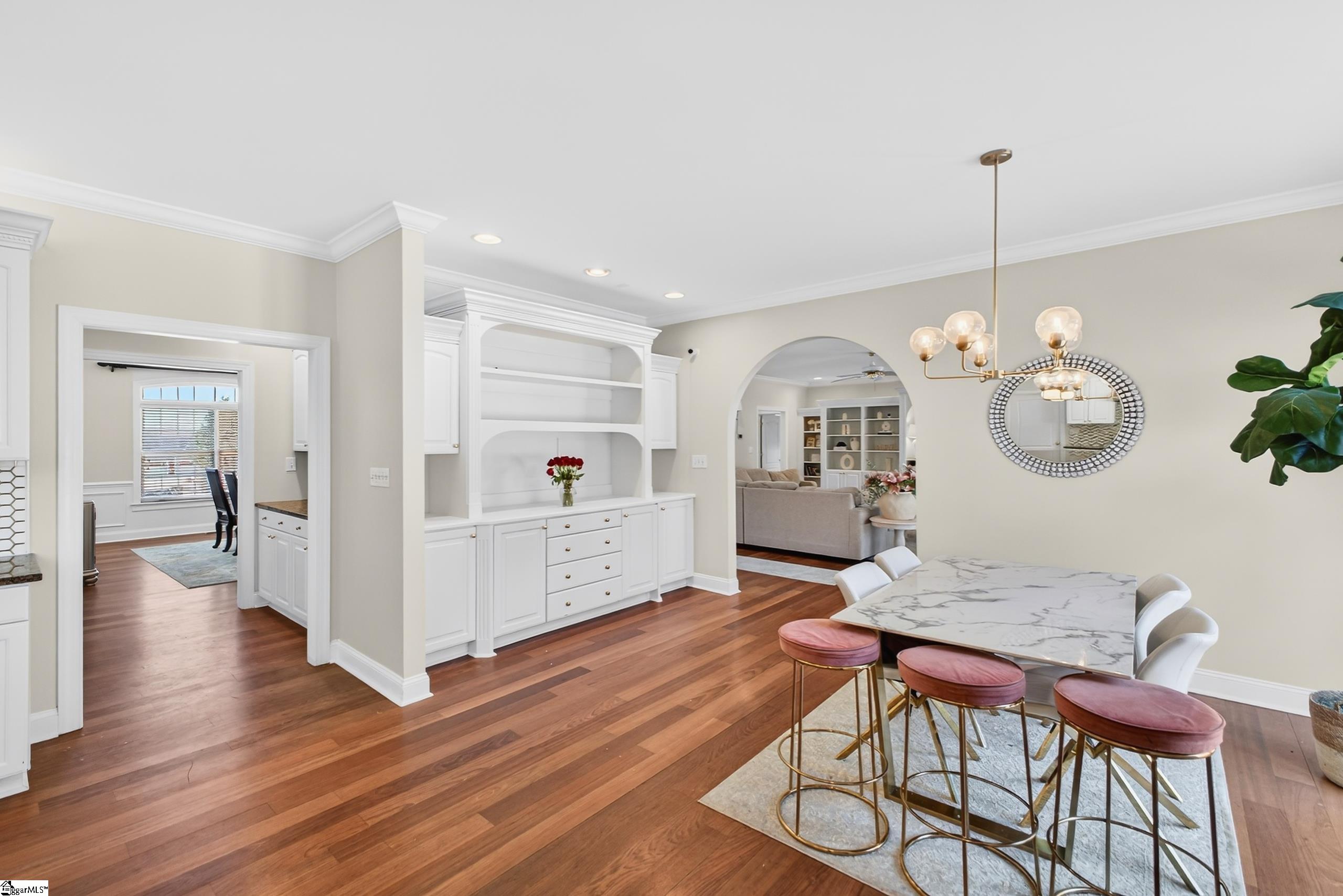 Welcome to this stunning, painted white brick estate nestled at the end of a quiet cul-de-sac in the desirable Providence subdivision, set on over an acre of beautifully maintained property. A circular driveway and striking curb appeal make a lasting first impression, highlighted by custom double doors and an iron-clad Palladian window. Inside, Brazilian cherry hardwood floors flow throughout the main living areas, setting the tone for timeless elegance. The home features a spacious dining room and a dedicated home office, offering both functionality and sophistication. Designed with flexibility in mind, this residence is ideal for multi-generational living, featuring two luxurious primary suites—one conveniently located on the main level. The second-floor primary suite is truly a showstopper, boasting an expansive bedroom, custom closet, and a spa-like bath complete with a soaking tub and an oversized walk-in marble surround shower. The great room offers a warm and inviting atmosphere with a fireplace and custom built-ins, seamlessly connecting to a covered patio overlooking the private backyard—perfect for relaxing or entertaining. At the heart of the home is a gourmet kitchen equipped with double ovens, a gas cooktop with pot filler, and a large island ideal for gathering. The oversized main-level laundry room adds convenience, while upstairs you’ll find a second washer-and-dryer area in the playroom/recreation space. Additional features include an oversized two-car attached garage and a separate one-car detached garage or storage area. Built by a local builder as their personal residence, this home showcases exceptional craftsmanship, thoughtful design, and high-end finishes throughout.