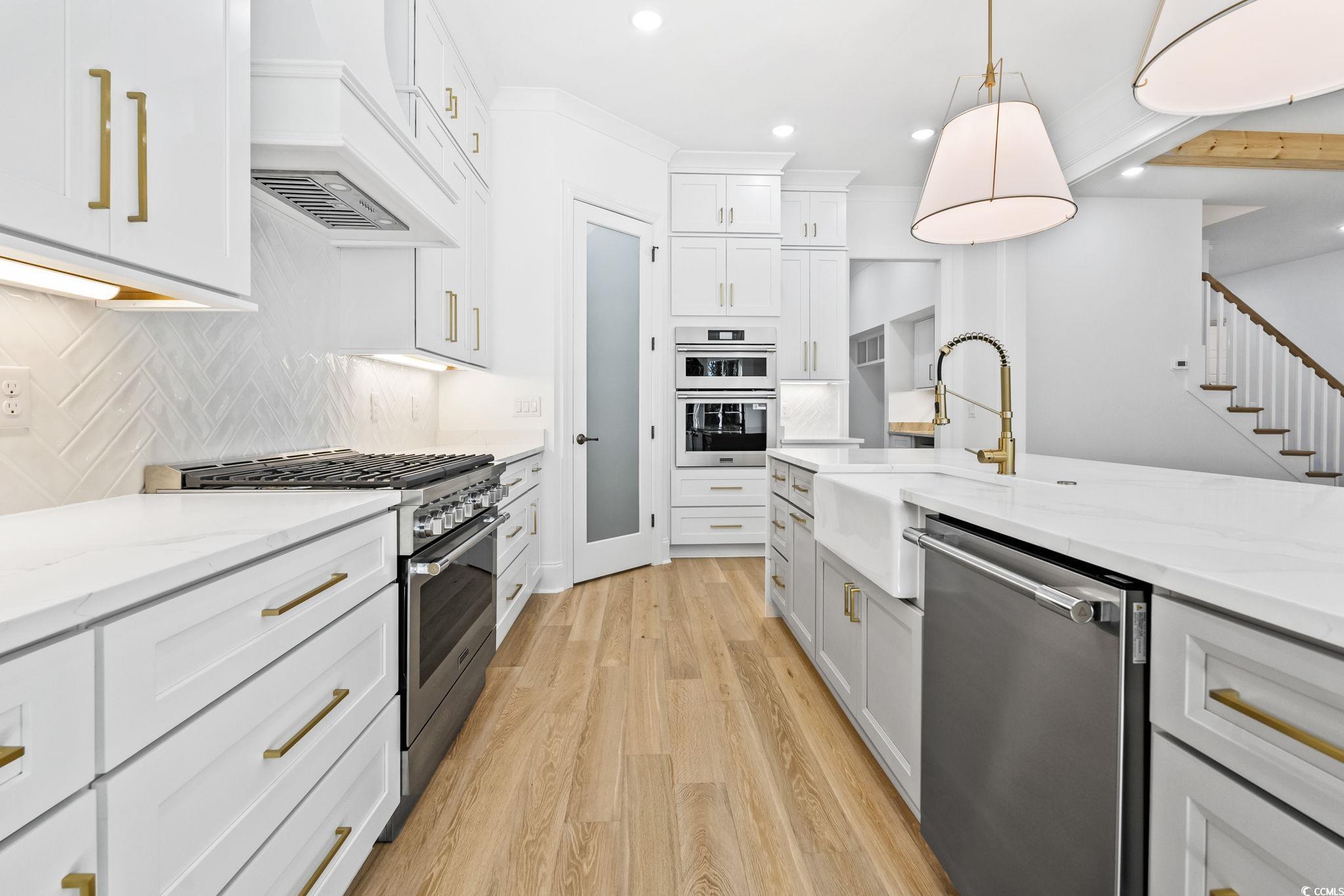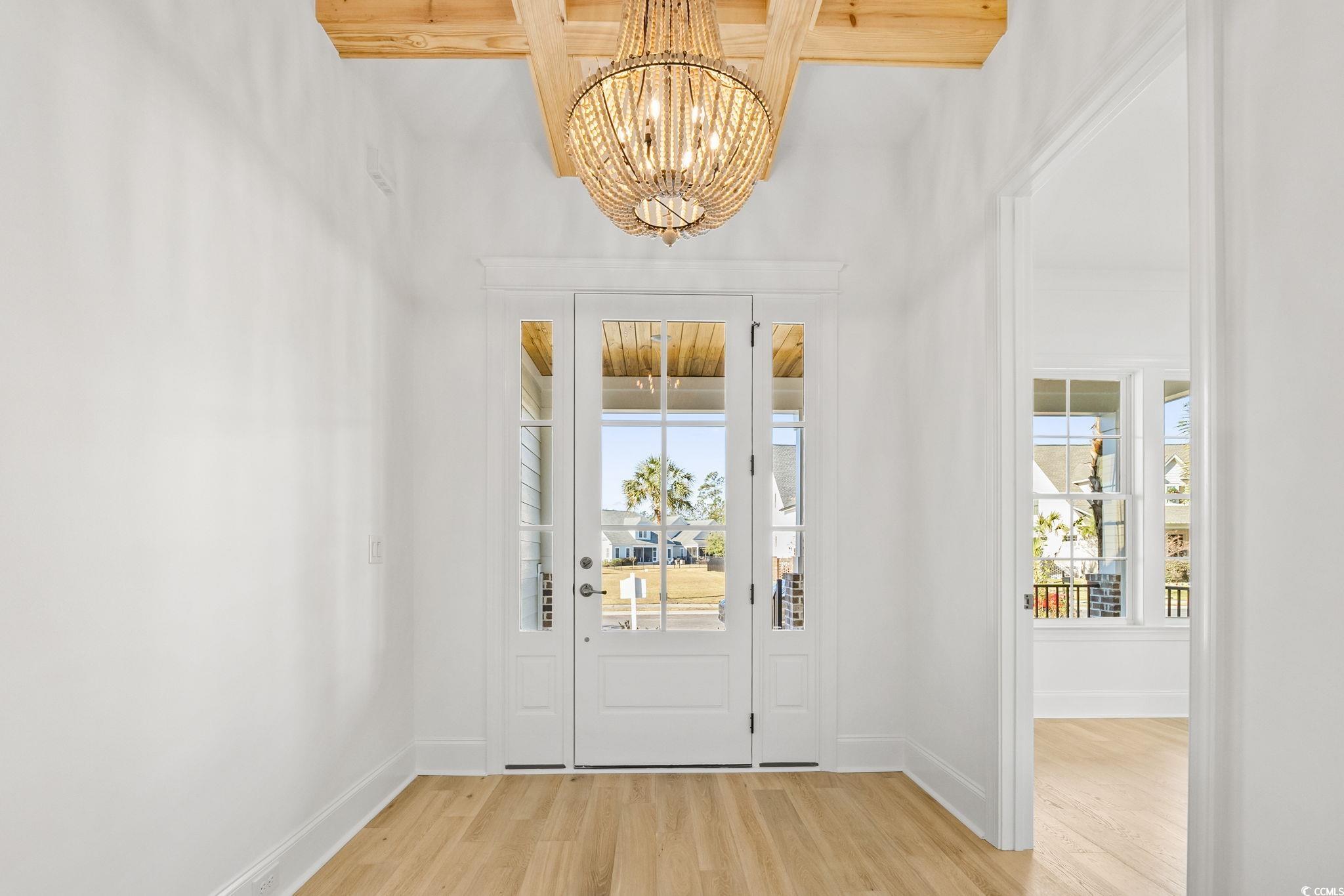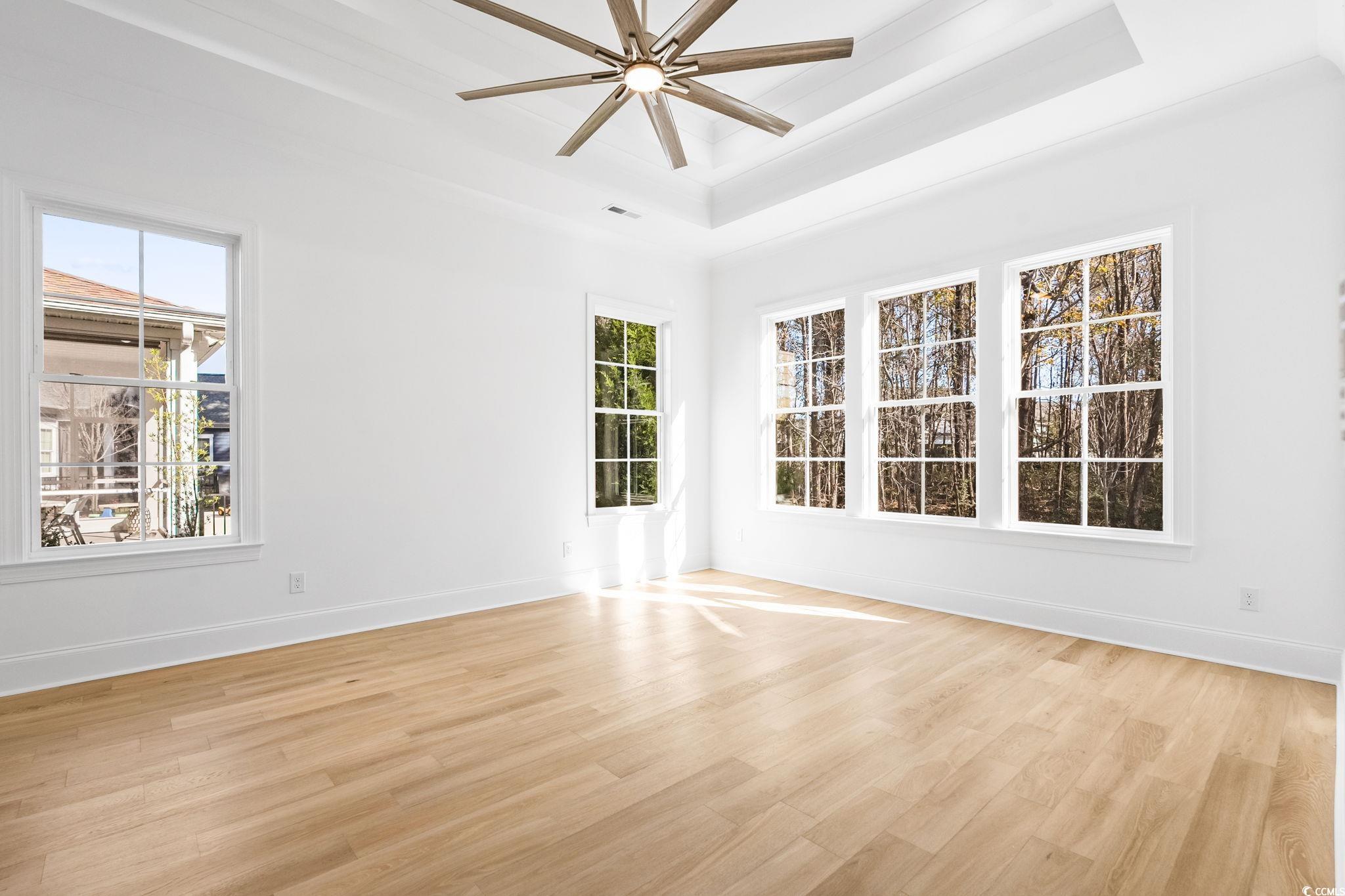 Welcome Home to this stunning 6 bedroom and 4 full bathroom home in the prestigious community of Waterway Palms Plantation. Take notice of the impeccable craftsmanship and extensive attention to detail as you tour this well thought out floor plan. A large southern porch with wood inlay ceilings greets you as you enter the impressive double wood beam foyer. Head into the family room and see how seamlessly it flows into the kitchen and dining space. Wood beam ceilings, custom built ins, a large electric fireplace and double slider glass doors to the back, create a cozy living space for you to enjoy the views of your private wooded backyard retreat. A true chefs dream awaits in the gourmet kitchen. Featuring an oversized gas range & oven, a 2nd wall mount oven, quartz countertops, large island with waterfall edge, porcelain farmhouse sink, and stainless appliances. Off the family room is an impressive primary suite with a large bedroom, double tray ceilings and giant fan. The bathroom will definitely make you feel as though you stepped into a spa. Dual vanities with sinks are spaced by a beautiful standalone tub, and an enormous fully tiled shower with double heads. Just off the kitchen is a wine bar with sink and mini fridge, along with a wood drop zone with bench & cubbies. Adjacent is the laundry with brick tiled floor, extensive cabinetry, a sink, and one more full refrigerator. There is an additional first floor bedroom and full bath with walk in tiled shower. Upstairs you will find four additional bedrooms, two full bathrooms with double sinks and a dedicated office with French doors. There is also a walk-in unfinished storage room, and a closet set up for an upstairs laundry. Out back is large screen room with wood inlaid ceilings, a custom outdoor kitchen & bar. Upgraded zoysia grass was installed, and there is room to add a pool if desired. Additional features of the home include; Engineered hardwoods throughout all living areas and bedrooms, crown molding, wood closet systems, high end light and plumbing fixtures, epoxy floored garage, tankless propane water heater, and ceiling fans in all bedrooms. Waterway Palms is a fully gated community with an amenities center unlike any in the area. Featuring resort style pool, hot tub, tennis/pickleball courts, basketball court, gym, bocce, cornhole, boat launch, day docks, and massive two-story amenity building. Waterway Palms allows quick access to Hwy 31, and just a short drive to shopping, restaurants and the beach.