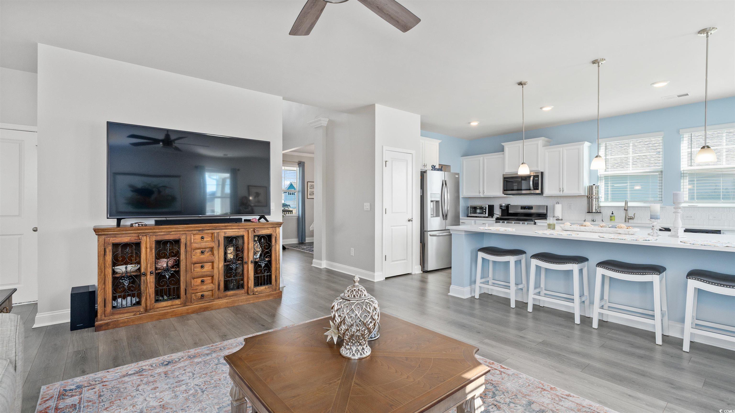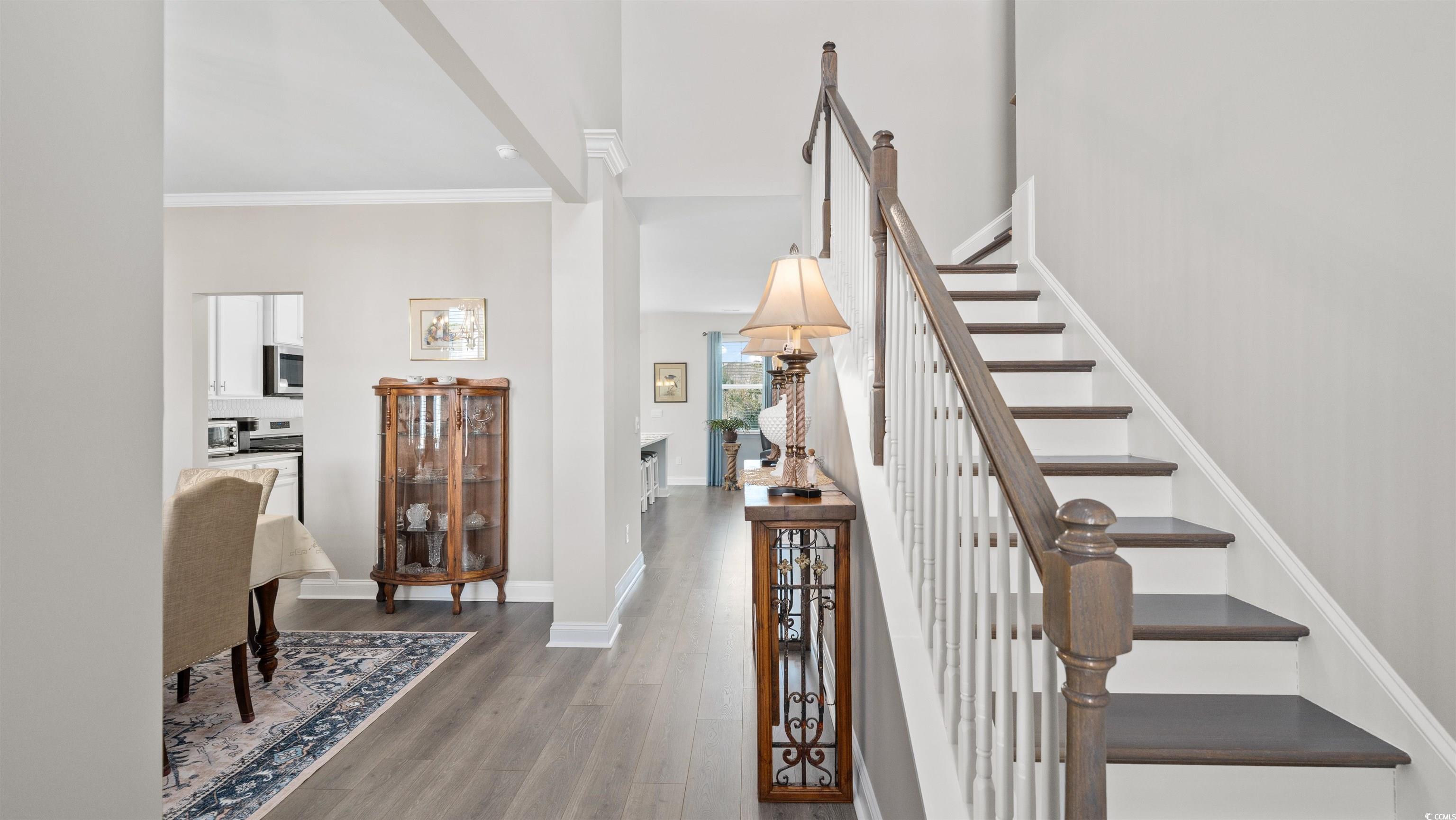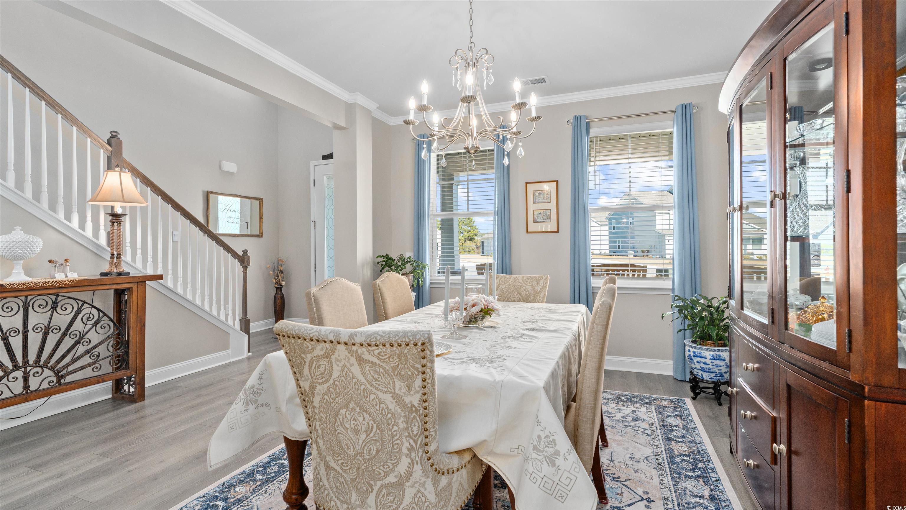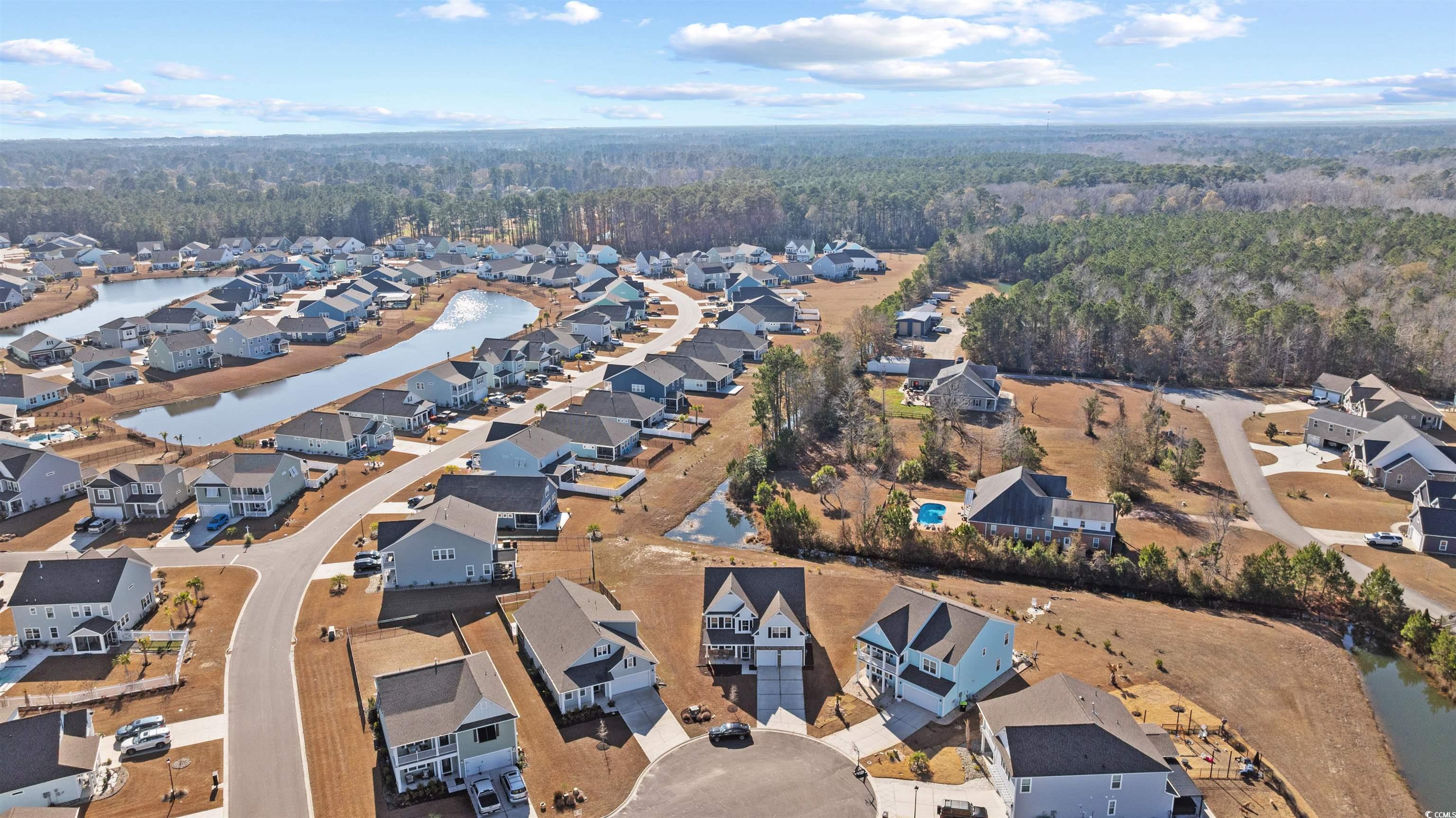 Welcome to this beautifully maintained 5-bedroom, 3-bath, two-story home offering 2,645 heated square feet, ideally situated in a cul-de-sac. The first floor of this thoughtfully designed floor plan features a formal dining room, a guest bedroom, and a beautiful kitchen with quartz countertops and an oversized island, perfect for everyday living and entertaining. The second floor offers a generously sized owner’s suite with a private bath featuring a tiled shower, dual quartz-top vanities, and a large walk-in closet, along with three additional bedrooms—including an exceptionally large bonus bedroom measuring 19'5" x 19'11"—and a conveniently located laundry room. Recent updates include fresh interior paint and new wallpaper, while refined details such as crown molding in the primary bedroom add to the home’s polished feel. The screened-in porch connects to a large concrete pad overlooking a small retention pond, providing a peaceful outdoor retreat with a sense of privacy in the backyard ready to entertain! This home was built with smart home technology, keeping peace of mind with the luxuries of security, wireless thermostat control, and video doorbell access from your phone!; Residents enjoy access to a community swimming pool, and the home is conveniently located approximately 10 minutes from Garden City Beach, with easy access to shopping, dining, and major roadways. A well-cared-for home offering space, comfort, and location—schedule your showing today.