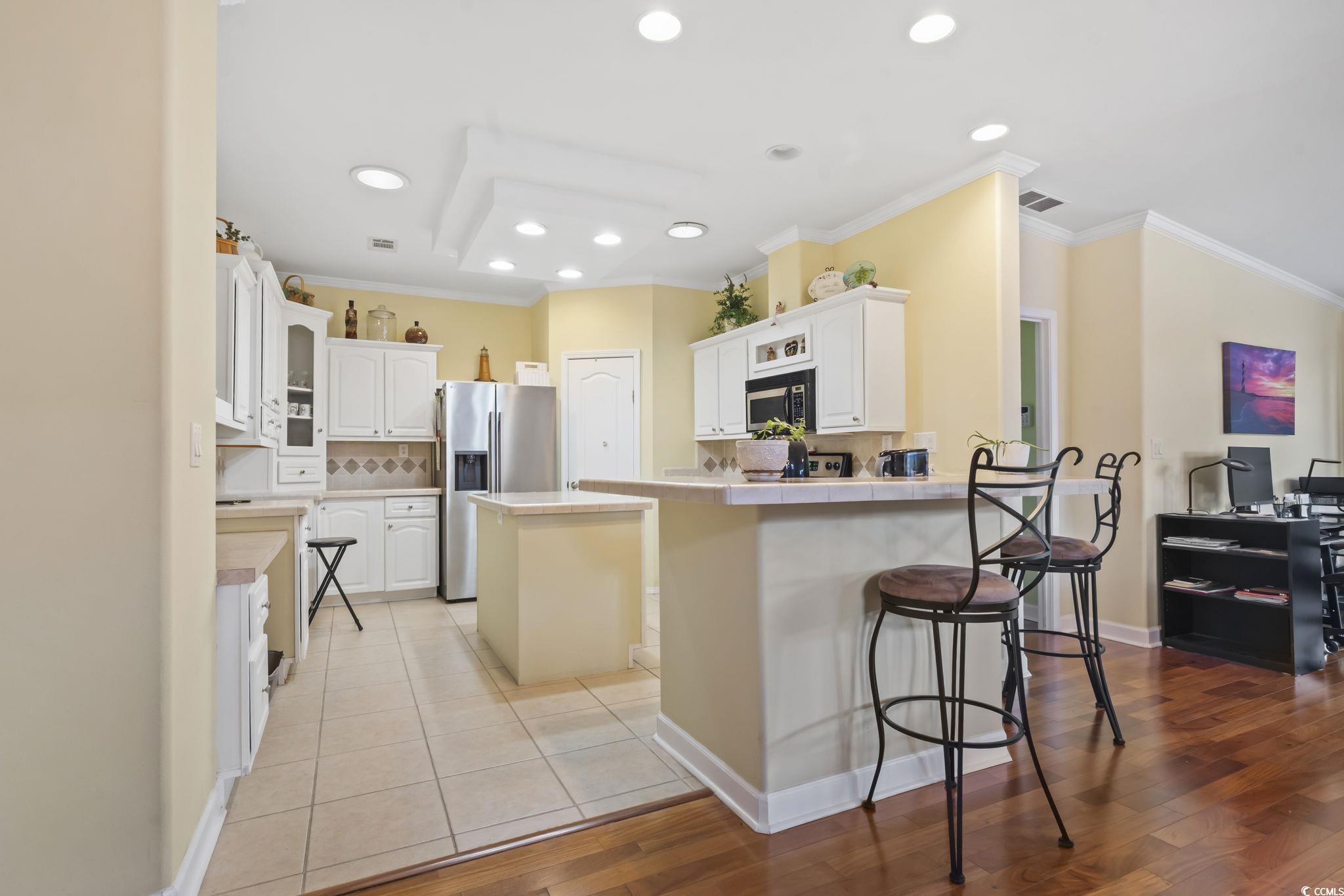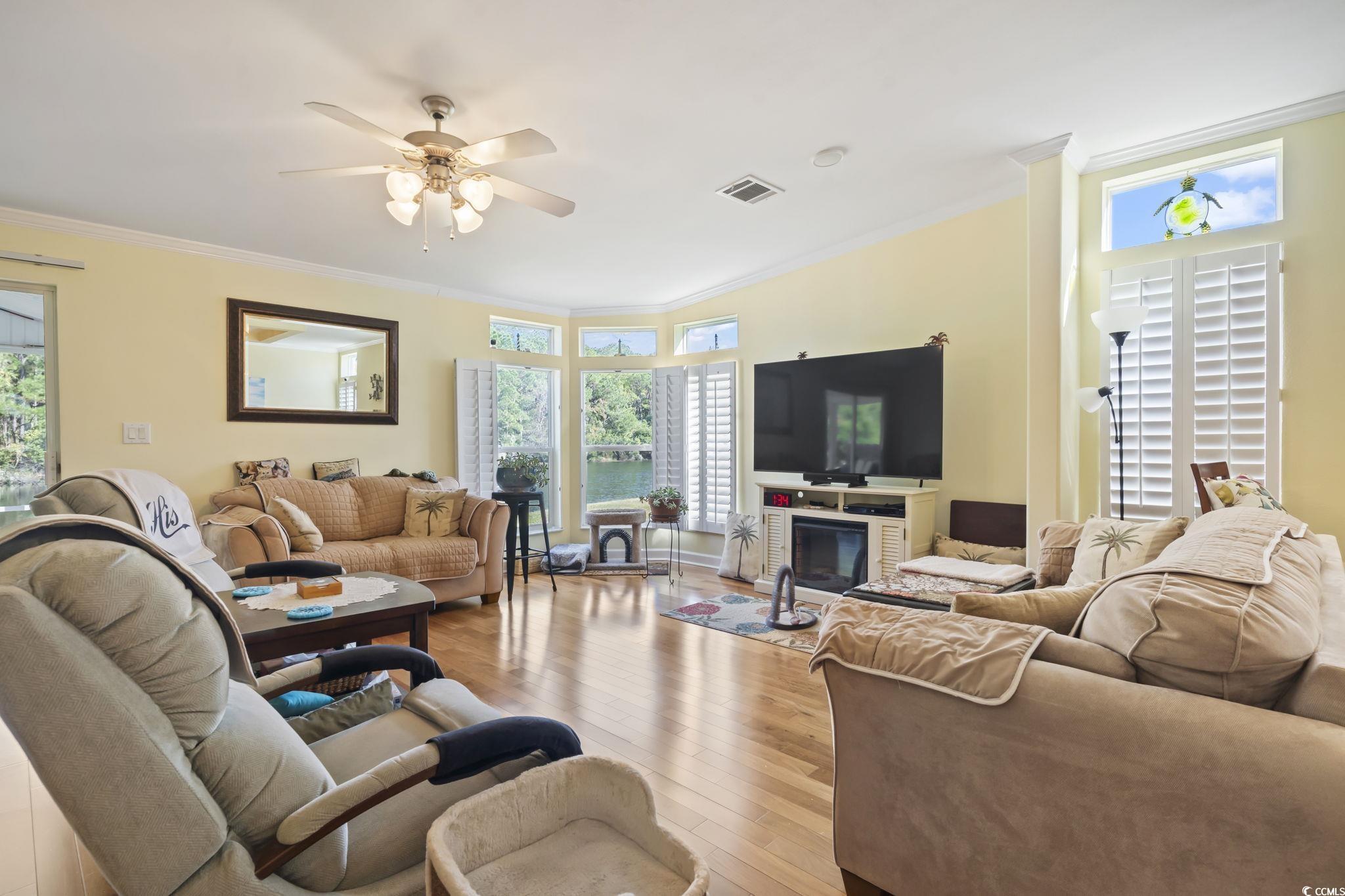 Welcome home to this beautifully maintained 3 bedroom, 2-bath single-level home in the desirable Lakeside Crossing community. Thoughtfully updated and move-in ready, this property combines comfort, charm and modern convenience just minutes from the beaches, shopping, and dining of the Grand Strand. Step inside to discover gleaming wood flooring, plantation shutters, and solar tubes that fill the space with natural light. The open floor plan flows effortlessly from the spacious living room to the dining area and kitchen-perfect for everyday living or entertaining friends and family. The kitchen is equipped with stainless steel appliances, including a new LG refrigerator (2025), dishwasher (2023), and washer & dryer (2023). Enjoy peace of mind with recent major updates- roof 2019 and HVAC 2024. Relax in the Carolina sunshine from your screened in porch or patio while taking in the serene pond view framed by beautiful mature trees- a perfect backdrop for your morning coffee or evening unwind. The professionally designed landscape curbing adds a polished touch to the exterior, enhancing the home's curb appeal. Located in the award-winning 55+ Lakeside Crossing community, residents enjoy resort-style amenities including indoor and outdoor pools, clubhouse, fitness center, tennis and pickleball courts, and countless social activities. Lot fee covers mowing, edging, trash, lot taxes and full amenities access. DON'T WAIT! Schedule your showing today!