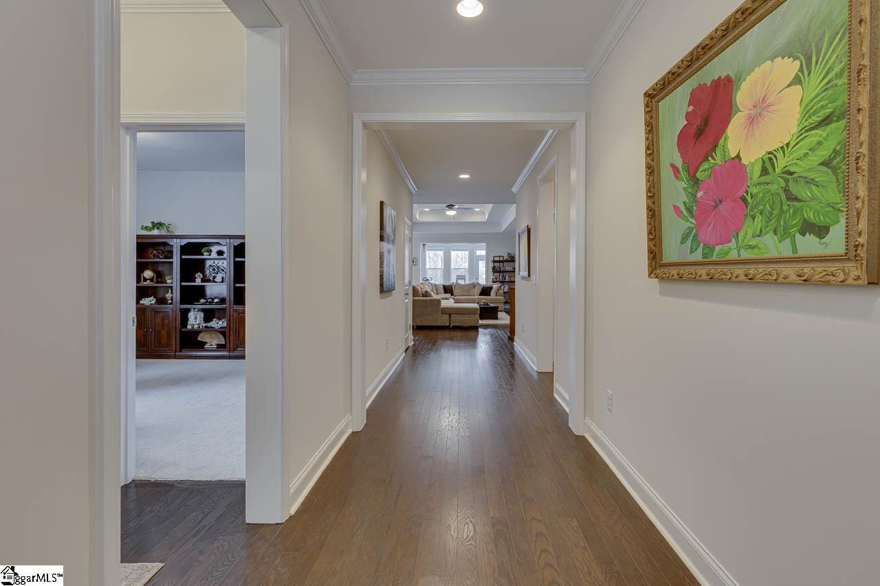 Situated in the heart of the Five Forks area of Simpsonville, this 2020-built luxury residence offers 2,390+/- square feet of refined design, intentional flow, and truly move-in-ready elegance. Every detail feels elevated. A charming front porch sets a gracious first impression, welcoming you into a spacious foyer accented by stunning crown molding and substantial baseboards, with Craftsman style finishes that carry throughout the home. Rich hardwood floors anchor the central living spaces, guiding you into a breathtaking living room defined by a dramatic double tray ceiling; a space that feels both grand and inviting. The living room features a cozy fireplace and is perfectly suited for lively gatherings or quiet evenings at home. The kitchen is nothing short of gorgeous. Granite countertops and stainless steel appliances provide timeless appeal, while thoughtful touches like the breakfast bar seating, a dedicated coffee bar area, a walk-in pantry, and a butler’s pantry, elevate everyday living and entertaining alike. The adjoining dining room flows seamlessly into a light-filled sunroom, where walls of windows frame serene views of the yard and the community green space. Step outside to the patio and backyard, where you can enjoy peaceful mornings or practicing your grilling skills. Tucked privately toward the rear of the home, the Primary Suite is a true retreat. The double tray ceiling adds architectural interest to the expansive bedroom, creating a sense of height and luxury. The ensuite bath offers a double sink vanity, walk-in tiled shower, and an impressively sized walk-in closet designed to accommodate even the most curated wardrobe. At the front of the home, two additional bedrooms and a well-appointed full bath provide flexibility for guests, family, or a home office. The walk-in laundry room is thoughtfully positioned off the two-car attached garage and doubles as a mudroom, blending practicality with polish. Conveniently located just moments away from all of the wonderful Woodruff Road amenities, I-385, and downtown Greenville. Move-in-ready and impeccably maintained, this home delivers the rare combination of modern construction, timeless finishes, and effortless comfort. Don't miss out on your chance to turn this special property into your new home. Schedule your showing today!