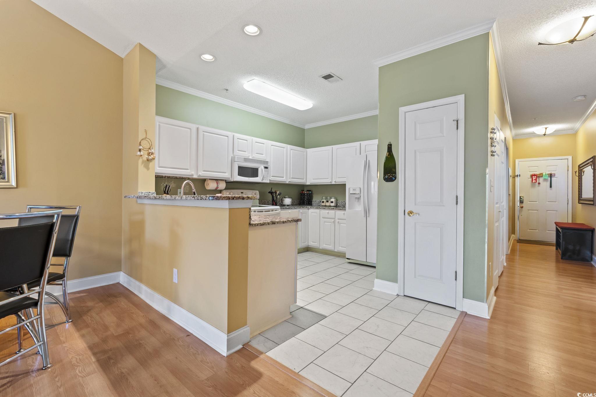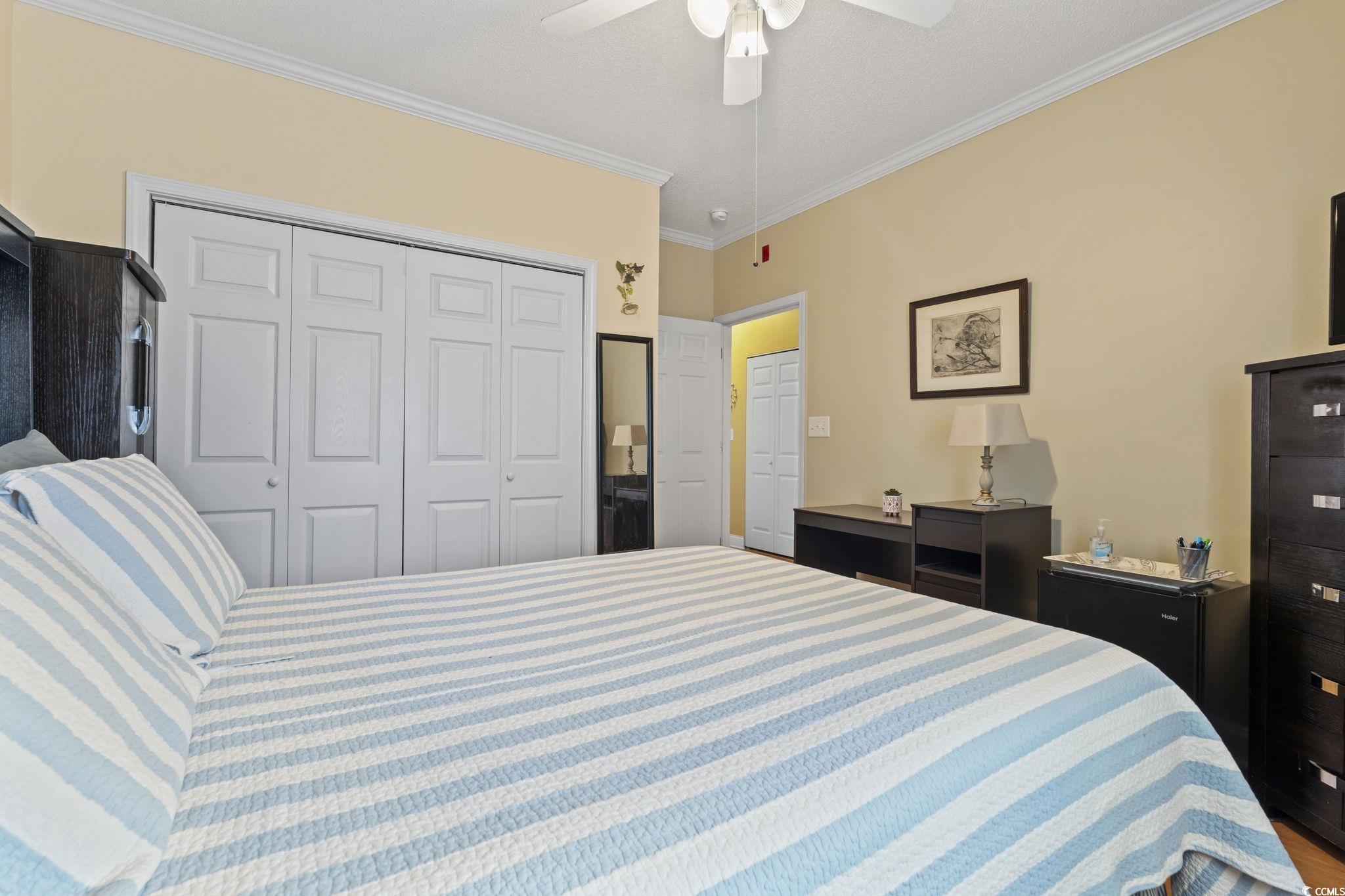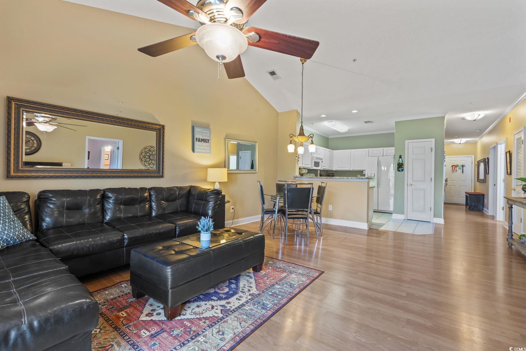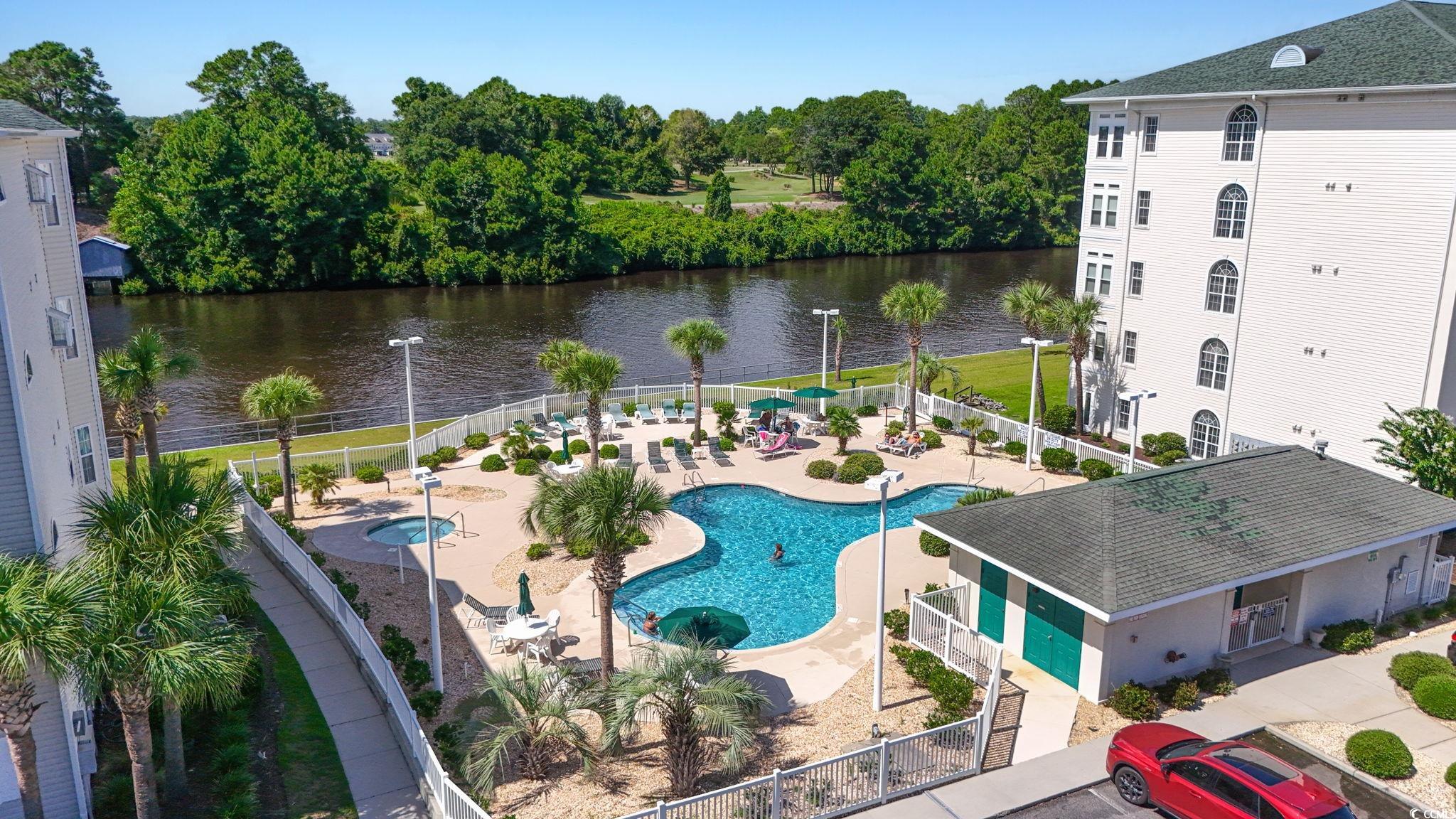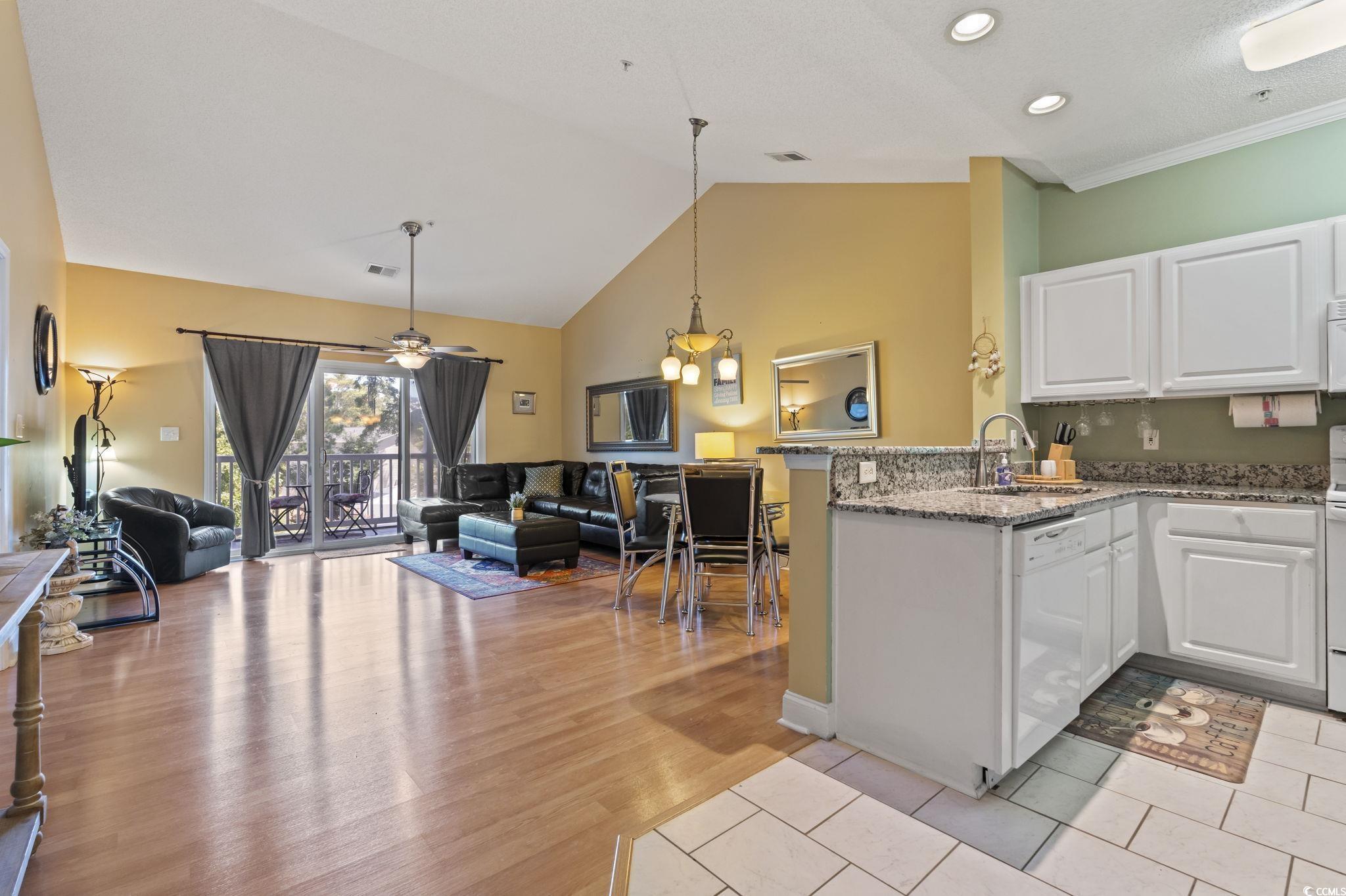 Spacious and beautifully furnished 3-bedroom, 2-bath top-floor villa offering 1,500 square feet of comfortable living space in an elevator building. Located in a quiet waterway community, this villa features vaulted ceilings and a large screened-in porch with peaceful pond views, accessible from both the living room and master bedroom. The open kitchen is equipped with granite countertops, a breakfast bar, a pantry, and upgraded finishes. The primary suite includes a spacious walk-in closet, an adjustable bed with head and foot elevation, and a private bath with dual vanities, and two additional closets for extra storage. The second bedroom offers an oversized closet, and the third bedroom features two closets, providing ample storage throughout. Additional highlights include tile flooring in the kitchen, bathrooms, laundry room, and porch, with laminate flooring throughout the remaining living spaces. Crown molding adds a touch of elegance in the kitchen, hallway, and bedrooms. Samsung washer and dryer, and HVAC system were replaced in 2018. Enjoy the community amenities, including a pool and hot tub overlooking the Intracoastal Waterway, a BBQ area, and beautifully landscaped grounds. All just one mile from the beach and conveniently located between Barefoot Landing and the Myrtle Beach Mall and Tanger Outlets. Easy access to Hwy 22 and Hwy 31 places you minutes from golf, dining, entertainment, and everything the Grand Strand has to offer. This is coastal living at its best!
