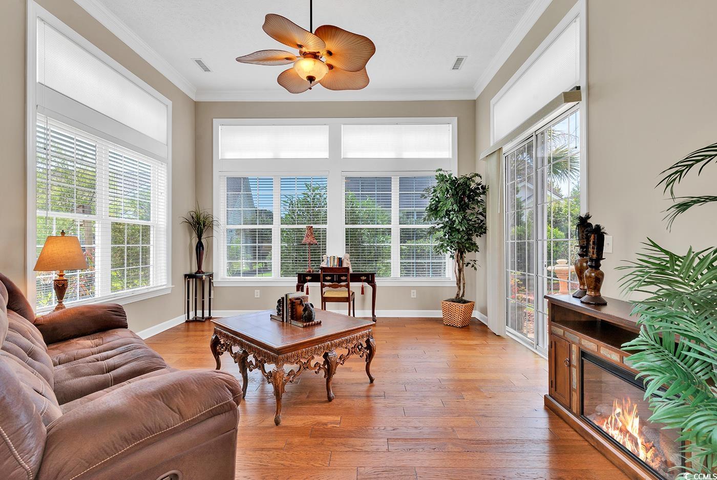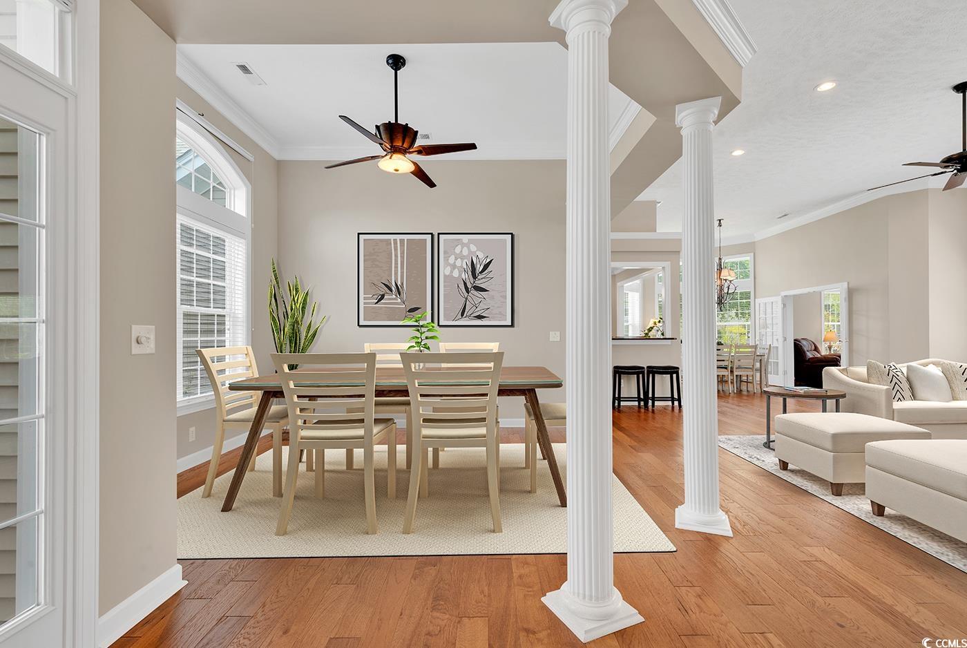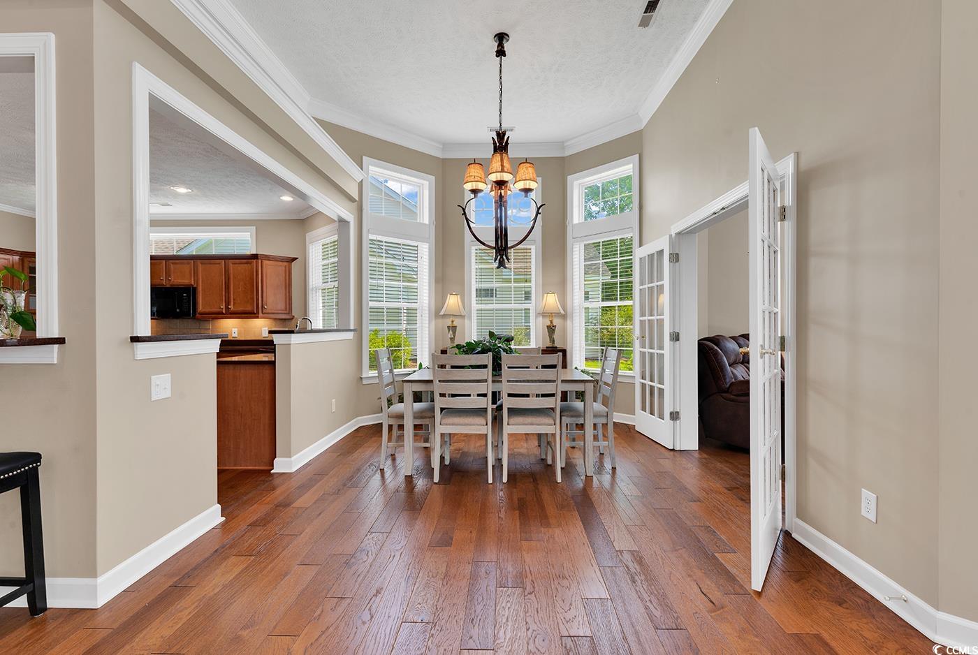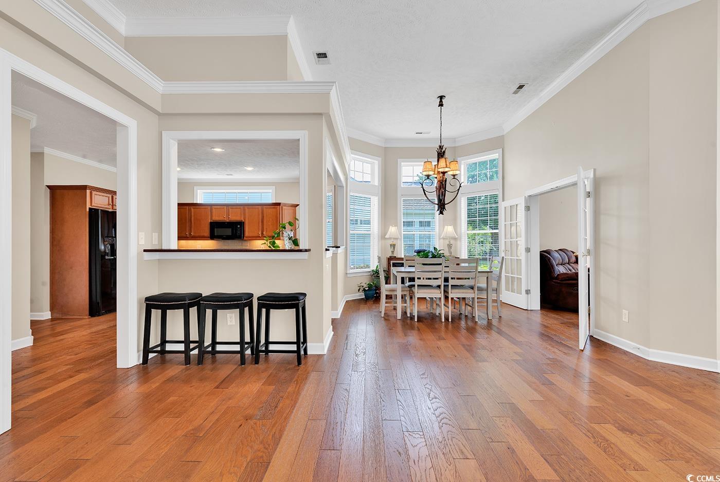 This spacious custom built home is located on a cul-de-sac in the Pebble Creek community of the International Club. Three spacious bedrooms are located on the first floor with a bonus room upstairs that could be a 4th bedroom, game room, or office. A new roof was installed in 2020 and 2 Trane HVAC units were installed in 2022. New windows, wood flooring, refrigerator, microwave, dishwasher, and exterior siding were installed within the last 4 years - plus a new irrigation controller in 2023 and a SunSetter patio awning in 2024! The home has beautiful floors, high ceilings, and lots of natural lighting. The large family room has a gas fireplace and plenty of space for family time or entertaining. The Carolina Room is the perfect place to relax and read or watch your favorite movie. The formal dining room area could also be used as an office area if you need 4 bedrooms and an office. The kitchen features lots of cabinets with slide-outs, a wet bar or food prep area, large pantry, and a storage closet. The spacious master bedroom has a large walk-in closet and the master bathroom has double sinks with a vanity, garden tub, shower, linen closet, and water closet. Relax on the private back patio or entertain family and friends while grilling your favorite meal and enjoying the mature landscaping. The home also has plenty of storage space, a Watts hot water recirculation pump, a 2-car garage with shelves and a utility sink, plus drop down stairs leading to floored attic space. You can also walk into the attic storage area from the upstairs bonus room. This community has a lot to offer with a large amenities center including a club house, children's playground, library, fitness center, and large walk-in pool. Located in the International Golf Club in Murrells Inlet, it’s a short drive to the ocean in Garden City Beach, the Murrells Inlet Marshwalk, shopping, dining, entertainment, and medical facilities. Schedule your showing today!