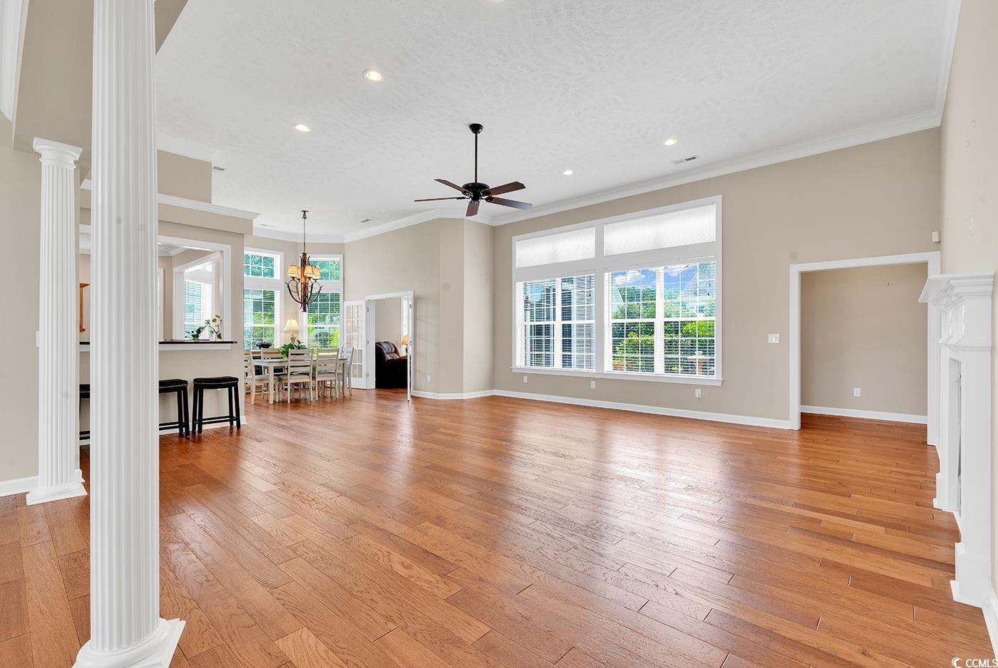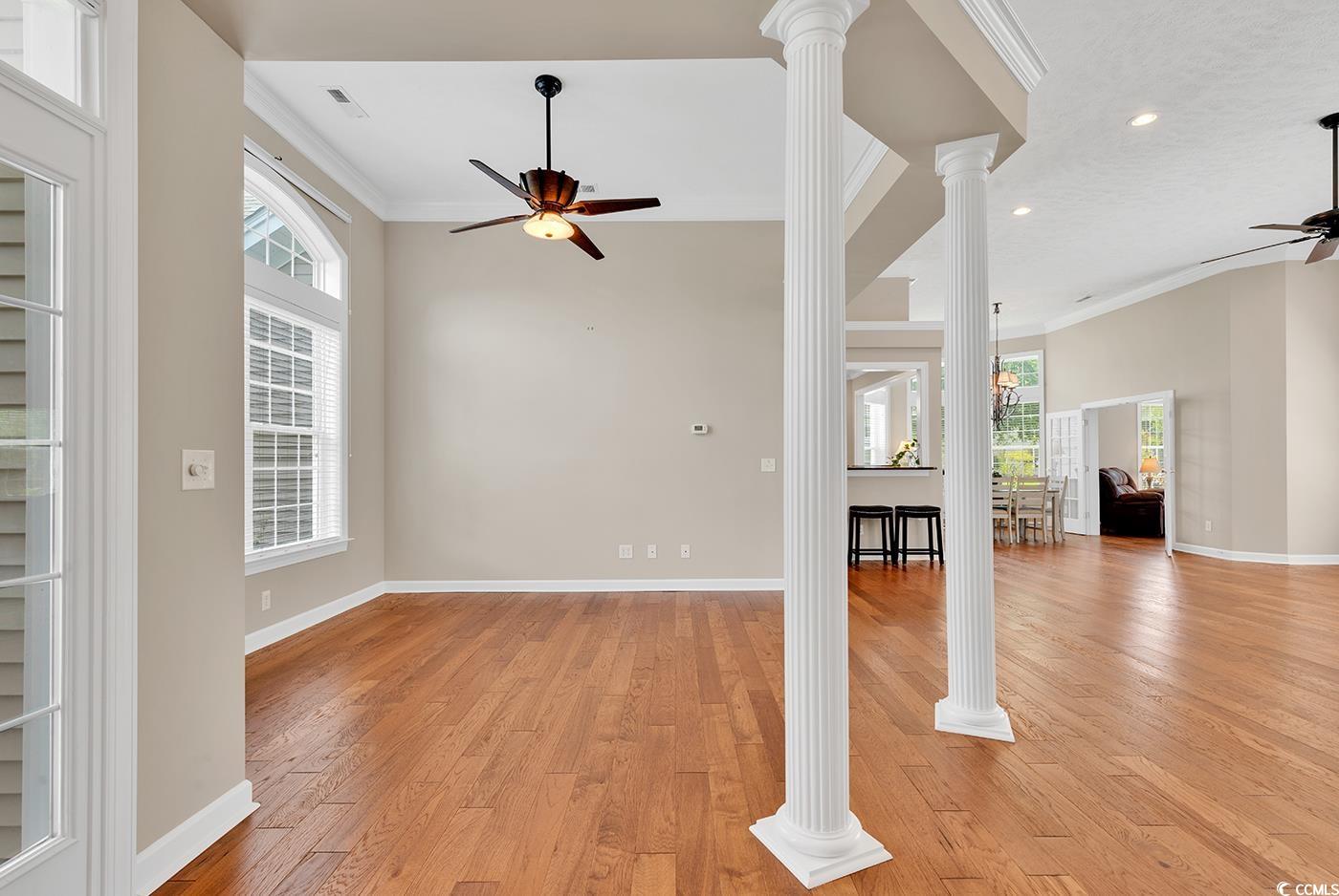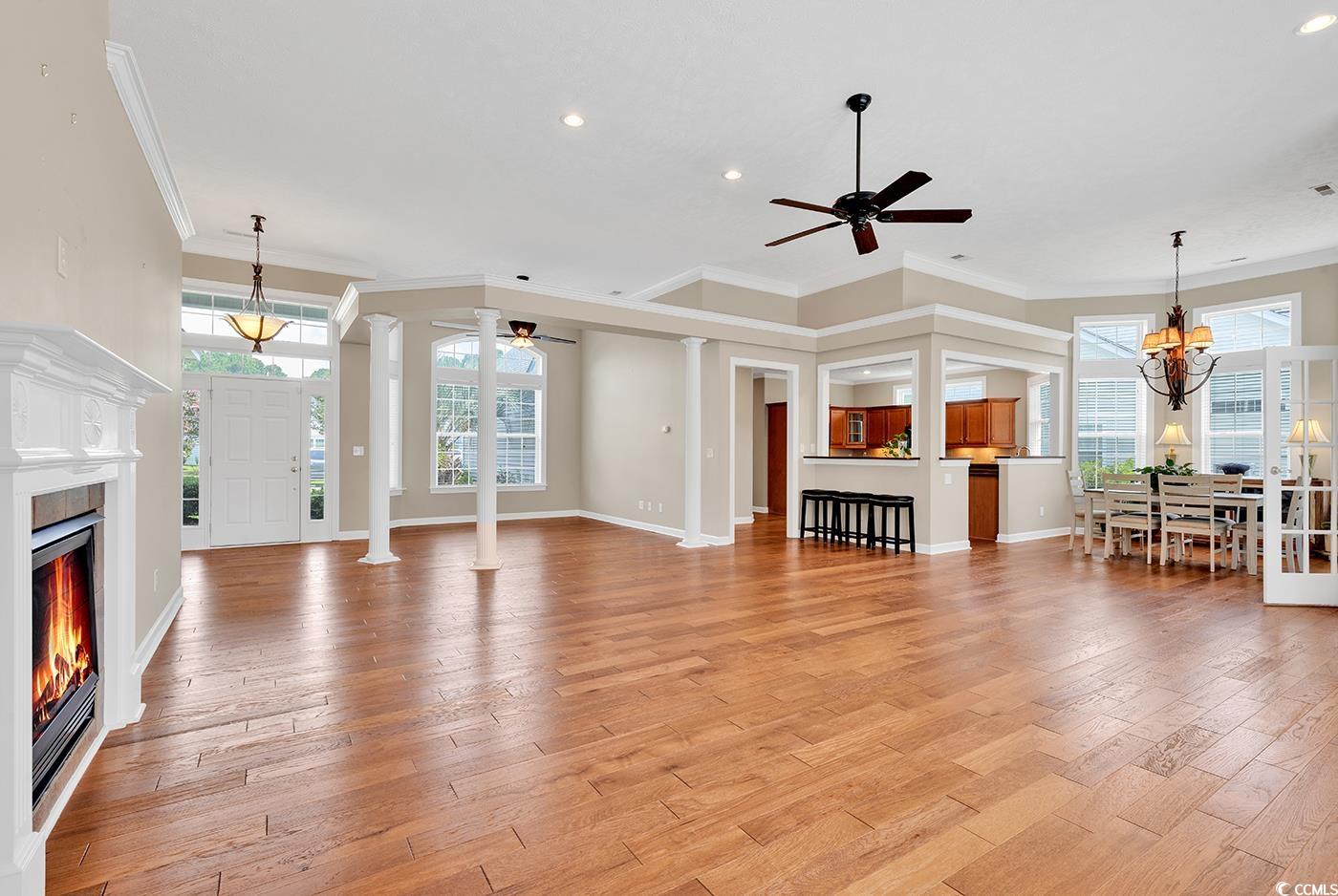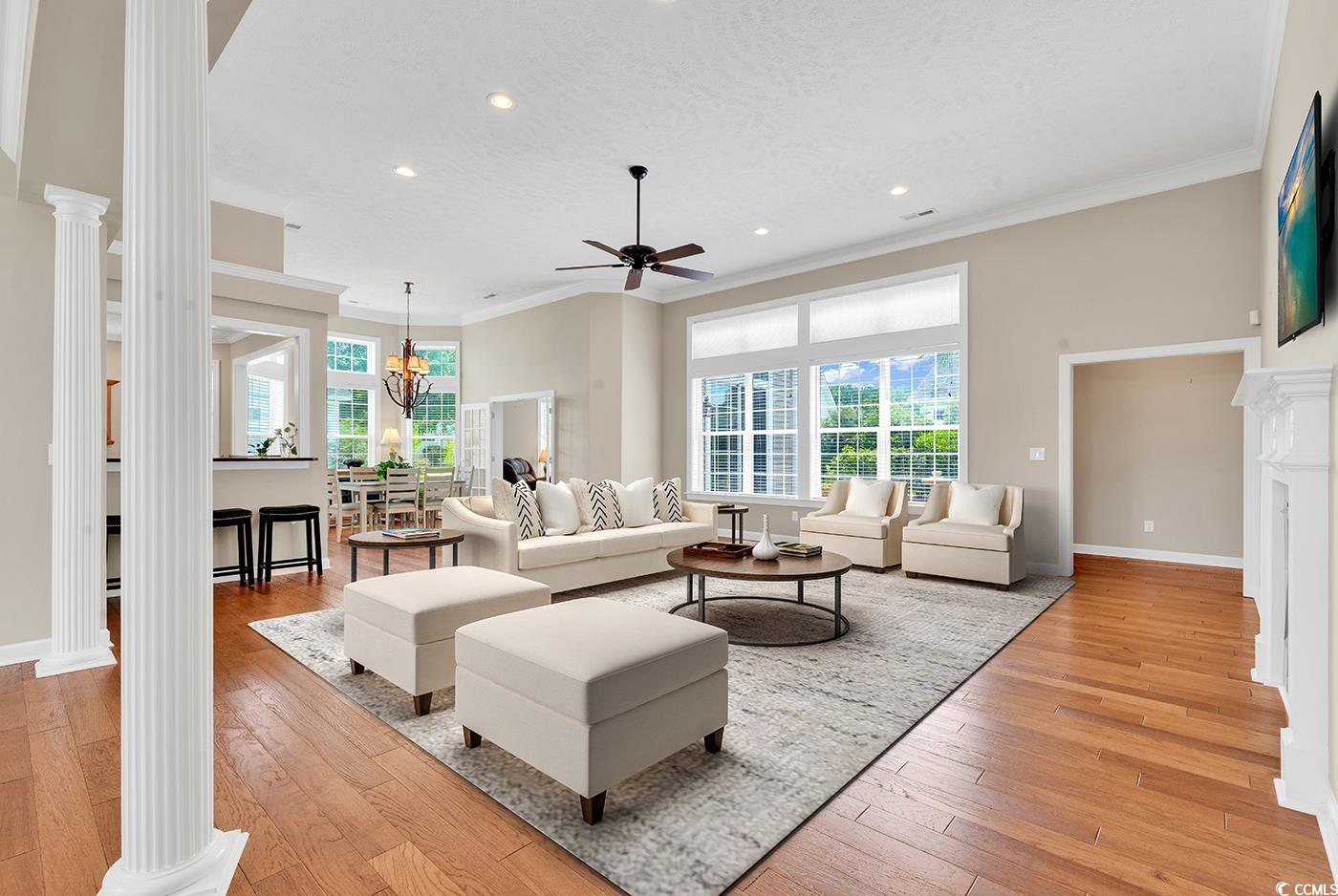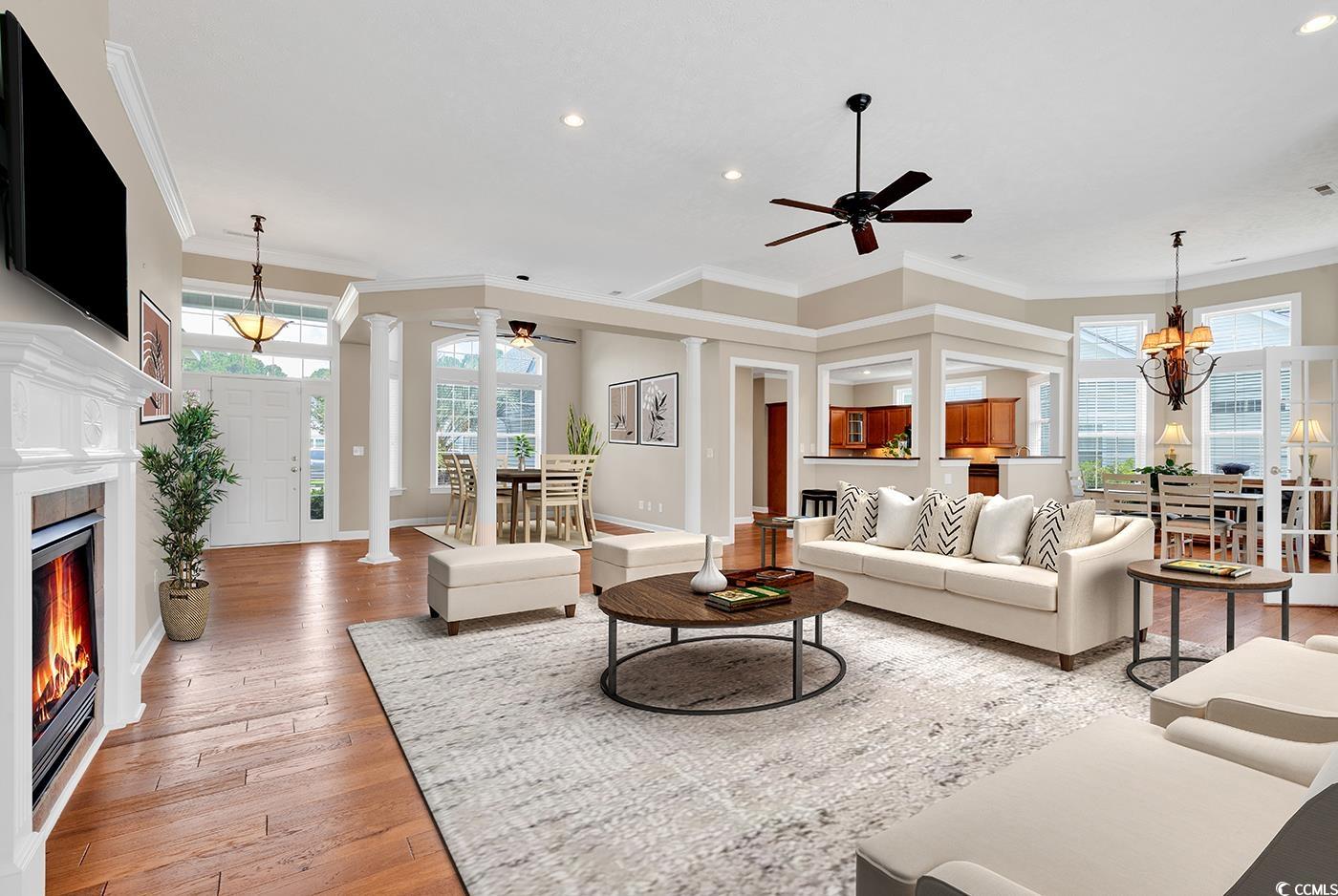 This spacious custom built home is located on a cul-de-sac in the Pebble Creek community of the International Club. Three spacious bedrooms are located on the first floor with a bonus room upstairs that could be a 4th bedroom, game room, or office. A new roof was installed in 2020 and 2 Trane HVAC units were installed in 2022. New windows, wood flooring, refrigerator, microwave, dishwasher, and exterior siding were installed within the last 4 years - plus a new irrigation controller in 2023 and a SunSetter patio awning in 2024! The home has beautiful floors, high ceilings, and lots of natural lighting. The large family room has a gas fireplace and plenty of space for family time or entertaining. The Carolina Room is the perfect place to relax and read or watch your favorite movie. The formal dining room area could also be used as an office area if you need 4 bedrooms and an office. The kitchen features lots of cabinets with slide-outs, a wet bar or food prep area, large pantry, and a storage closet. The spacious master bedroom has a large walk-in closet and the master bathroom has double sinks with a vanity, garden tub, shower, linen closet, and water closet. Relax on the private back patio or entertain family and friends while grilling your favorite meal and enjoying the mature landscaping. The home also has plenty of storage space, a Watts hot water recirculation pump, a 2-car garage with shelves and a utility sink, plus drop down stairs leading to floored attic space. You can also walk into the attic storage area from the upstairs bonus room. This community has a lot to offer with a large amenities center including a club house, children's playground, library, fitness center, and large walk-in pool. Located in the International Golf Club in Murrells Inlet, it’s a short drive to the ocean in Garden City Beach, the Murrells Inlet Marshwalk, shopping, dining, entertainment, and medical facilities. Schedule your showing today!