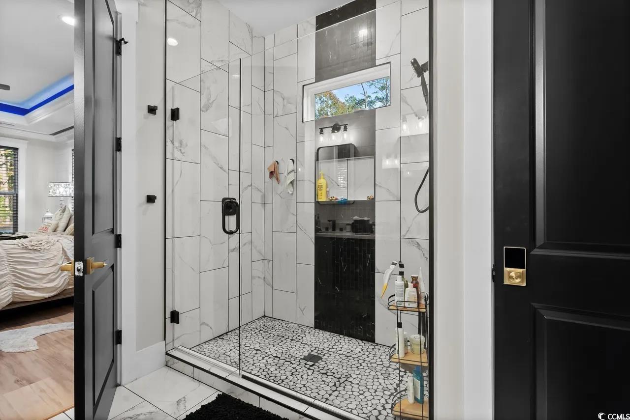 This to be built property features an impressive 5 Bed / 6.5 Bath modern home with unique architectural details. The home itself features multiple windows with charming shutter details, and the welcoming porch includes a lovely columned entryway. The design blends both contemporary and rustic elements. Whether you're seeking privacy or a spacious layout, this home offers both—backed by a peaceful wooded backdrop. Perfect for those looking for a private yet stylish residence. The kitchen is a blend of sleek modern design and functional elegance, featuring dark cabinetry with gold hardware accents. The large island with a pristine white countertop is a standout feature, perfect for both cooking and entertaining. The high-end appliances, including a stainless steel fridge and range, are seamlessly integrated into the space. Pendant lighting with woven shades adds a touch of warmth, while exposed wooden beams above bring a natural, rustic element to the space. The living room exudes a contemporary feel featuring stylish coffered beams, and the open layout allows for plenty of natural light. Ideally situated near top-rated schools, you’re just minutes from the famous Murrells Inlet Marsh Walk, yet far enough out to enjoy peace, privacy, and the natural beauty of the area.